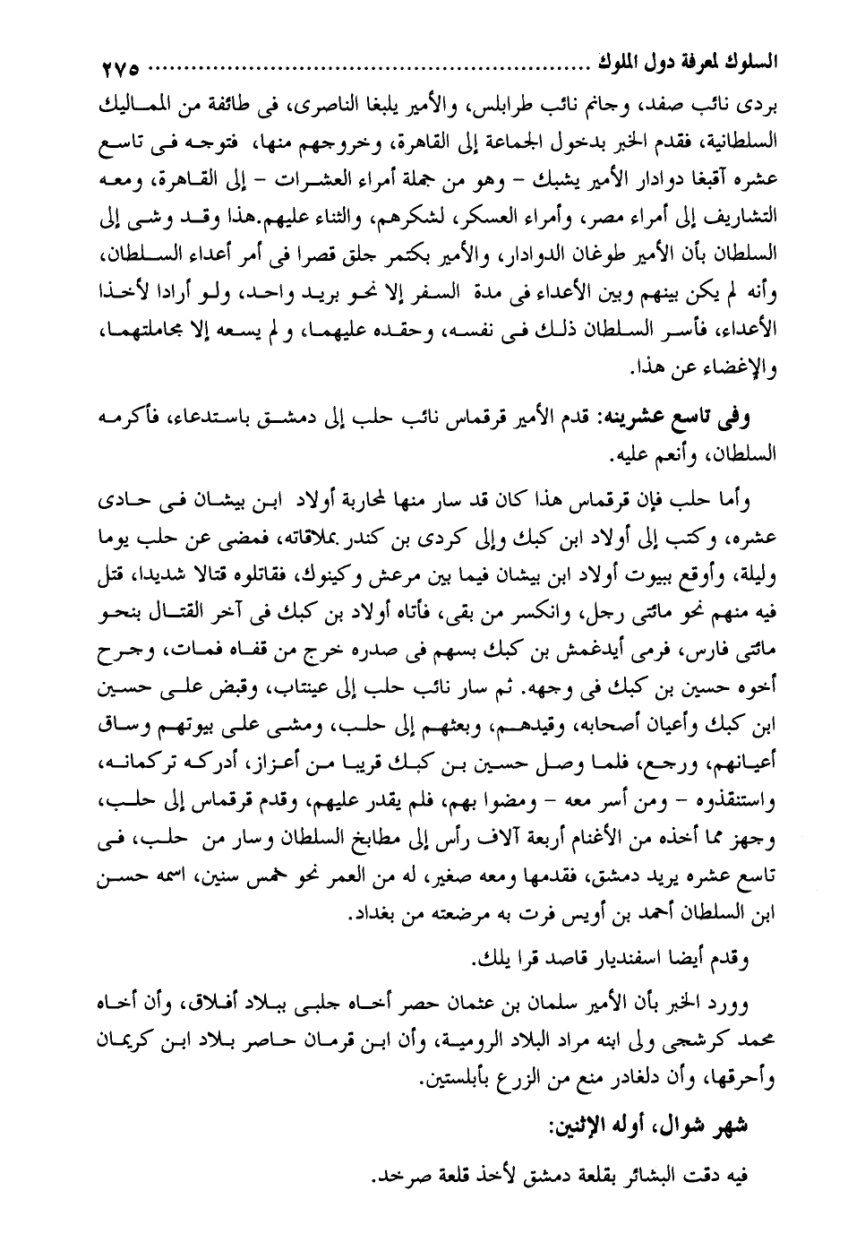 بردى نَائِب صفد وجانم نَائِب طرابلس والأمير يلبغا الناصري فِي طَائِفَة من المماليك السُّلْطَانِيَّة فَقدم الْخَبَر بِدُخُول الْجَمَاعَة إِلَى الْقَاهِرَة وخروجهم مِنْهَا مُتَوَجّه فِي تَاسِع عشره أقبغا دوادار الْأَمِير يشبك - وَهُوَ من جملَة أُمَرَاء العشرات - إِلَى الْقَاهِرَة وَمَعَهُ التشاريف إِلَى أُمَرَاء مصر وأمراء الْعَسْكَر لشكرهم وَالثنَاء عَلَيْهِم. هَذَا وَقد وشي إِلَى السُّلْطَان بِأَن الْأَمِير طوغان الدوادار والأمير بكتمر جلق قصراً فِي أَمر أَعدَاء السُّلْطَان وَأَنه لم يكن بَينهم وَبَين الْأَعْدَاء فِي مُدَّة السّفر إِلَّا نَحْو بريد وَاحِد وَلَو أَرَادَا لأخذا الْأَعْدَاء فَأسر السُّلْطَان ذَلِك فِي نَفسه وحقده عَلَيْهِمَا وَلم يَسعهُ إِلَّا مجاملتهما والإغضاء عَن هَذَا. وَفِي تَاسِع عشرينه: قدم الْأَمِير قرقماس نَائِب حلب إِلَى دمشق باستدعاء فَأكْرمه السُّلْطَان وأنعم عَلَيْهِ. وَأما حلب فَإِن قرقماس هَذَا كَانَ قد سَار مِنْهَا لمحاربة أَوْلَاد ابْن بيشان فِي حادي عشره وَكتب إِلَى أَوْلَاد ابْن كبك وَإِلَى كردِي بن كندر بملاقاته فَمضى عَن حلب يَوْمًا وَلَيْلَة وأوقع ببيوت أَوْلَاد ابْن بيشان فِيمَا بَين مرعش وكينوك فقاتلوه قتالاً شَدِيدا قتل فِيهِ مِنْهُم نَحْو مِائَتي رجل وانكسر من بَقِي فَأَتَاهُ أَوْلَاد بن كبك فِي أَخُو الْقِتَال بِنَحْوِ مِائَتي فَارس فَرمى أيدغمش بن كبك بِسَهْم فِي صَدره خرج من قَفاهُ فَمَاتَ وجرح أَخُوهُ حُسَيْن بن كبك فِي وَجهه. ثمَّ سَار نَائِب حلب إِلَى عينتاب وَقبض على حُسَيْن ابْن كبك وأعيان أَصْحَابه وقيدهم وبعثهم إِلَى حلب ومشي على بُيُوتهم وسَاق أعيانهم وَرجع فَلَمَّا وصل حُسَيْن بن كبك قَرِيبا من أعزاز أدْركهُ تركمانه واستنقذوه - وَمن أسر مَعَه - ومضوا بهم فَلم يقدر عَلَيْهِم وَقدم قرقماس إِلَى حلب وجهز مِمَّا أَخذه من الأغنام أَرْبَعَة آلَاف رَأس إِلَى مطابخ السُّلْطَان وَسَار من حلب فِي تَاسِع عشره يُرِيد دمشق فَقَدمهَا وَمَعَهُ صَغِير لَهُ من الْعُمر نَحْو خمس سِنِين اسْمه حسن ابْن السُّلْطَان أَحْمد بن أويس فرت بِهِ مرضعته من بَغْدَاد. وَقدم أَيْضا اسفنديار قَاصد قرايلك. وَورد الْخَبَر بِأَن الْأَمِير سلمَان بن عُثْمَان حصر أَخَاهُ جلبي بِبِلَاد أفلاق وَأَن أَخَاهُ مُحَمَّد كرشجي ولى ابْنه مُرَاد الْبِلَاد الرومية وَأَن ابْن قرمان حاصر بِلَاد ابْن كريمان وأحرقها وَأَن دلغادر منع من الزَّرْع بأبلستين. شهر شَوَّال أَوله الِاثْنَيْنِ: فِيهِ دقَّتْ البشائر بقلعة دمشق لأخذ قلعة صرخد.
