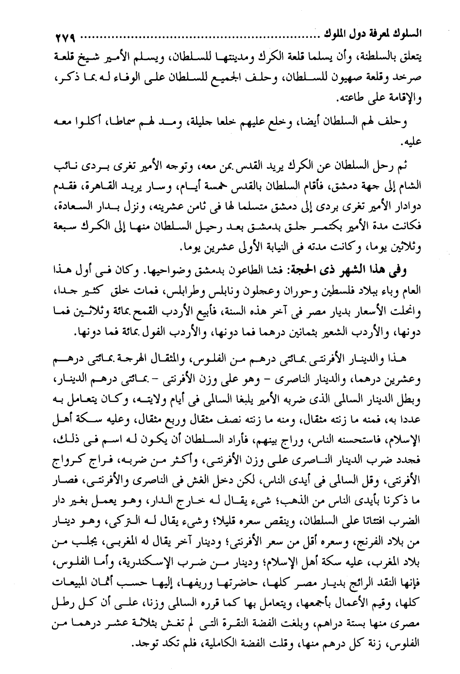 يتَعَلَّق بالسلطة وَأَن يسلما قلعة الكرك ومدينتها للسُّلْطَان وَيسلم الْأَمِير شيخ قلعة صرخد وقلعة صهيون للسُّلْطَان وَحلف الْجَمِيع للسُّلْطَان على الْوَفَاء لَهُ بِمَا ذكر وَالْإِقَامَة على طَاعَته. ثمَّ رَحل السُّلْطَان عَن الكرك يُرِيد الْقُدس بِمن مَعَه وَتوجه الْأَمِير تغري بردى نَائِب الشَّام إِلَى جِهَة دمشق فَأَقَامَ السُّلْطَان بالقدس خَمْسَة أَيَّام وَسَار يُرِيد الْقَاهِرَة فَقدم دوادار الْأَمِير تغري بردى إِلَى دمشق متسلماً لَهَا فِي ثامن عشرينه وَنزل بدار السَّعَادَة فَكَانَت مُدَّة الْأَمِير بكتمر جلق بِدِمَشْق بعد رحيل السُّلْطَان مِنْهَا إِلَى الكرك سَبْعَة وَثَلَاثِينَ يَوْمًا وَكَانَت مدَّته فِي النِّيَابَة الأولى عشْرين يَوْمًا. وَفِي هَذَا الشَّهْر ذِي الْحجَّة: فَشَا الطَّاعُون بِدِمَشْق وضواحيها. وَكَانَ فِي أول هَذَا الْعَام وباء بِبِلَاد فلسطين وحوران وعجلون ونابلس وطرابلس فَمَاتَ خلق كثير جدا وانحلت الأسعار بديار مصر فِي آخر هَذِه السّنة فأبيع الأردب الْقَمْح بِمِائَة وَثَلَاثِينَ فَمَا دونهَا والأردب الشّعير بِثَمَانِينَ درهما فَمَا دونهَا والأردب الفول بِمِائَة فَمَا دونهَا. هَذَا وَالدِّينَار الأفرنتي بِمِائَتي دِرْهَم من الْفُلُوس والمثقال الهرجة بِمِائَتي دِرْهَم وَعشْرين درهما وَالدِّينَار الناصري - وَهُوَ على وزن الأفرنتي - بِمِائَتي دِرْهَم الدِّينَار وَبَطل الدِّينَار السالمي الَّذِي ضربه الْأَمِير يلبغا السالمي فِي أَيَّام ولَايَته وَكَانَ يتعامل بِهِ عددا بِهِ فَمِنْهُ مَا زنته مِثْقَال وَمِنْه مَا زنته نصف مِثْقَال وَربع مِثْقَال وَعَلِيهِ سكَّة أهل الْإِسْلَام فَاسْتَحْسَنَهُ النَّاس وراج بَينهم فَأَرَادَ السُّلْطَان أَن يكون لَهُ اسْم فِي ذَلِك فجدد ضرب الدِّينَار الناصري على وزن الأفرنتي وَأكْثر من ضربه فراج كرواج الأفرنتي وَقل السالمي فِي أَيدي النَّاس لَكِن دخل الْغِشّ فِي الناصري والأفرنتي فَصَارَ مَا ذكرنَا بأيدي النَّاس من الذَّهَب شَيْء يُقَال لَهُ خَارج الدَّار وَهُوَ يعْمل بِغَيْر دَار الضَّرْب افتئاتا على السُّلْطَان وَينْقص سعره قَلِيلا وَشَيْء يُقَال لَهُ التركي وَهُوَ دِينَار من بِلَاد الفرنج وسعره أقل من سعر الأفرنتي ودينار آخر يُقَال لَهُ المغربي يجلب من بِلَاد الْمغرب عَلَيْهِ سكَّة أهل الْإِسْلَام ودينار من ضرب الْإسْكَنْدَريَّة وَأما الْفُلُوس فَإِنَّهَا النَّقْد الرائج بديار مصر كلهَا حاضرتها وريفها إِلَيْهَا حسب أَثمَان المبيعات كلهَا وقيم الْأَعْمَال بأجمعها ويتعامل بهَا كَمَا قَرَّرَهُ السالمي وزنا على أَن كل رَطْل مصري مِنْهَا بِسِتَّة دَرَاهِم وَبَلغت الْفضة النقرة الَّتِي لم تغش بِثَلَاثَة عشر درهما من الْفُلُوس زنة كل دِرْهَم مِنْهَا وَقلت الْفضة الكاملية فَلم تكد تُوجد.