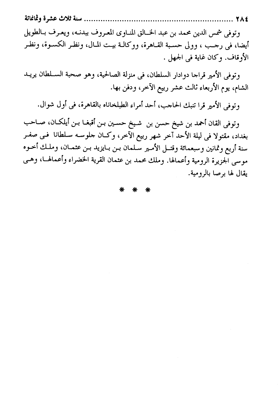وَتُوفِّي شمس الدّين مُحَمَّد بن عبد الْخَالِق الْمَنَاوِيّ الْمَعْرُوف بِبدنِهِ وَيعرف بالطويل أَيْضا فِي رَجَب وَولي حسبَة الْقَاهِرَة ووكالة بَيت المَال وَنظر الْكسْوَة وَنظر الْأَوْقَاف. وَكَانَ غَايَة فِي الْجَهْل. وَتُوفِّي الْأَمِير قراجا دوادار السُّلْطَان فِي منزلَة الصالحية وَهُوَ صُحْبَة السُّلْطَان يُرِيد الشَّام يَوْم الْأَرْبَعَاء ثَالِث عشر ربيع الآخر وَدفن بهَا. وَتُوفِّي الْأَمِير قرا تنبك الْحَاجِب أحد أُمَرَاء الطبلخاناه بِالْقَاهِرَةِ فِي أول شَوَّال. وَتُوفِّي القان أَحْمد بن شيخ حسن بن شيخ حُسَيْن بن أقبغا بن أيلكان صَاحب بَغْدَاد مقتولاً فِي لَيْلَة الْأَحَد آخر شهر ربيع الآخر وَكَانَ جُلُوسه سُلْطَانا فِي صفر سنة أَربع وَثَمَانِينَ وَسَبْعمائة وَقتل الْأَمِير سلمَان بن بايزيد بن عُثْمَان وَملك أَخُوهُ مُوسَى الجزيرة الرومية وأعمالها. وَملك مُحَمَّد بن عُثْمَان الْقرْيَة الخضراء وأعمالها وَهِي يُقَال لَهَا برصا بالرومية.