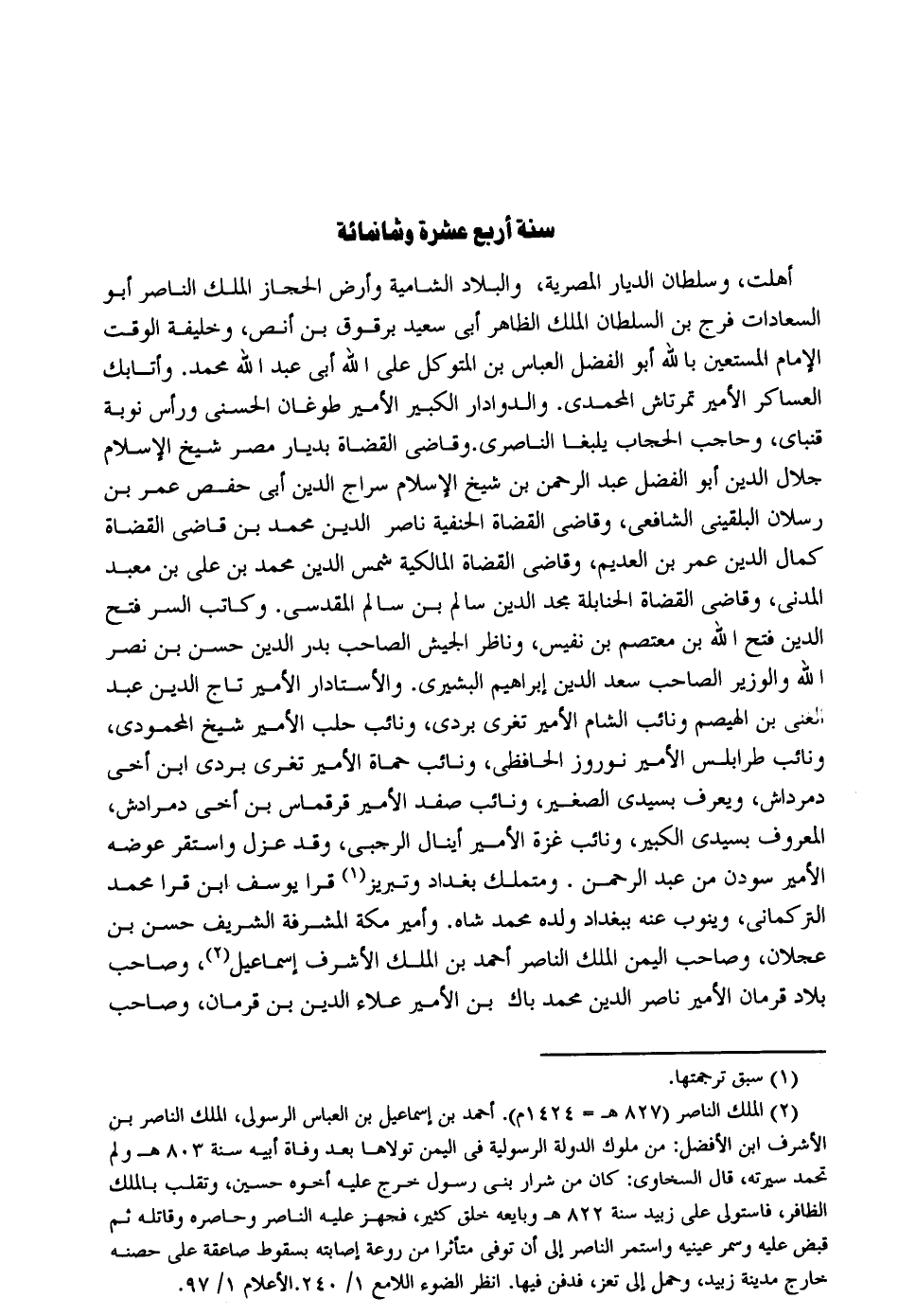 أهلت وسلطان الديار المصرية والبلاد الشامية وَأَرْض الْحجاز الْملك النَّاصِر أَبُو السعادات فرج بن السُّلْطَان الْملك الظَّاهِر أبي سعيد برقوق بن أنص وَخَلِيفَة الْوَقْت الإِمَام المستعين بِاللَّه أَبُو الْفضل الْعَبَّاس بن المتَوَكل على الله أبي عبد الله مُحَمَّد. وأتابك العساكر الْأَمِير تمرتاش المحمدي. والدوادار الْكَبِير الْأَمِير طوغان الحسني وَرَأس نوبَة قنباي وحاجب الْحجاب يلبغا الناصري. وقاضي الْقُضَاة بديار مصر شيخ الْإِسْلَام جلال الدّين أَبُو الْفضل عبد الرَّحْمَن بن شيخ الْإِسْلَام سراج الدّين أبي حَفْص عمر بن رسْلَان البُلْقِينِيّ الشَّافِعِي وقاضي الْقُضَاة الْحَنَفِيَّة نَاصِر الدّين مُحَمَّد بن قَاضِي القفساة كَمَال الدّين عمر بن العديم وقاضي الْقُضَاة الْمَالِكِيَّة شمس الدّين مُحَمَّد بن عَليّ بن معبد الْمدنِي وقاضي الْقُضَاة الْحَنَابِلَة مجد الدّين سَالم بن سَالم الْمَقْدِسِي. وَكَاتب السِّرّ فتح الدّين فتح الله بن معتصم بن نَفِيس وناظر الْجَيْش الصاحب بدر الدّين حسن بن نصر الله والوزير الصاحب سعد الدّين إِبْرَاهِيم البشيري. والأستادار الْأَمِير تَاج الدّين عبد الْغَنِيّ بن الهيصم ونائب الشَّام الْأَمِير تغري بردى ونائب حلب الْأَمِير شيخ المحمودي ونائب طرابلس الْأَمِير نوروز الحافظي ونائب حماة الْأَمِير تغري بردى ابْن أخي دمرداش وَيعرف بسيدي الصَّغِير ونائب صفد الْأَمِير قرقماس بن أخي دمرادش الْمَعْرُوف بسيدي الْكَبِير ونائب غَزَّة الْأَمِير أينال الرجبي وَقد عزل وَاسْتقر عوضه الْأَمِير سودن من عبد الرَّحْمَن ومتملك بَغْدَاد وتبريز قرا يُوسُف ابْن قرا مُحَمَّد التركماني وينوب عَنهُ بِبَغْدَاد وَلَده مُحَمَّد شاه. وأمير مَكَّة المشرفة الشريف حسن بن عجلَان وَصَاحب الْيمن الْملك النَّاصِر أَحْمد بن الْملك الْأَشْرَف إِسْمَاعِيل وَصَاحب بِلَاد قرمان الْأَمِير نَاصِر الدّين مُحَمَّد باك بن الْأَمِير عَلَاء الدّين بن قرمان وَصَاحب