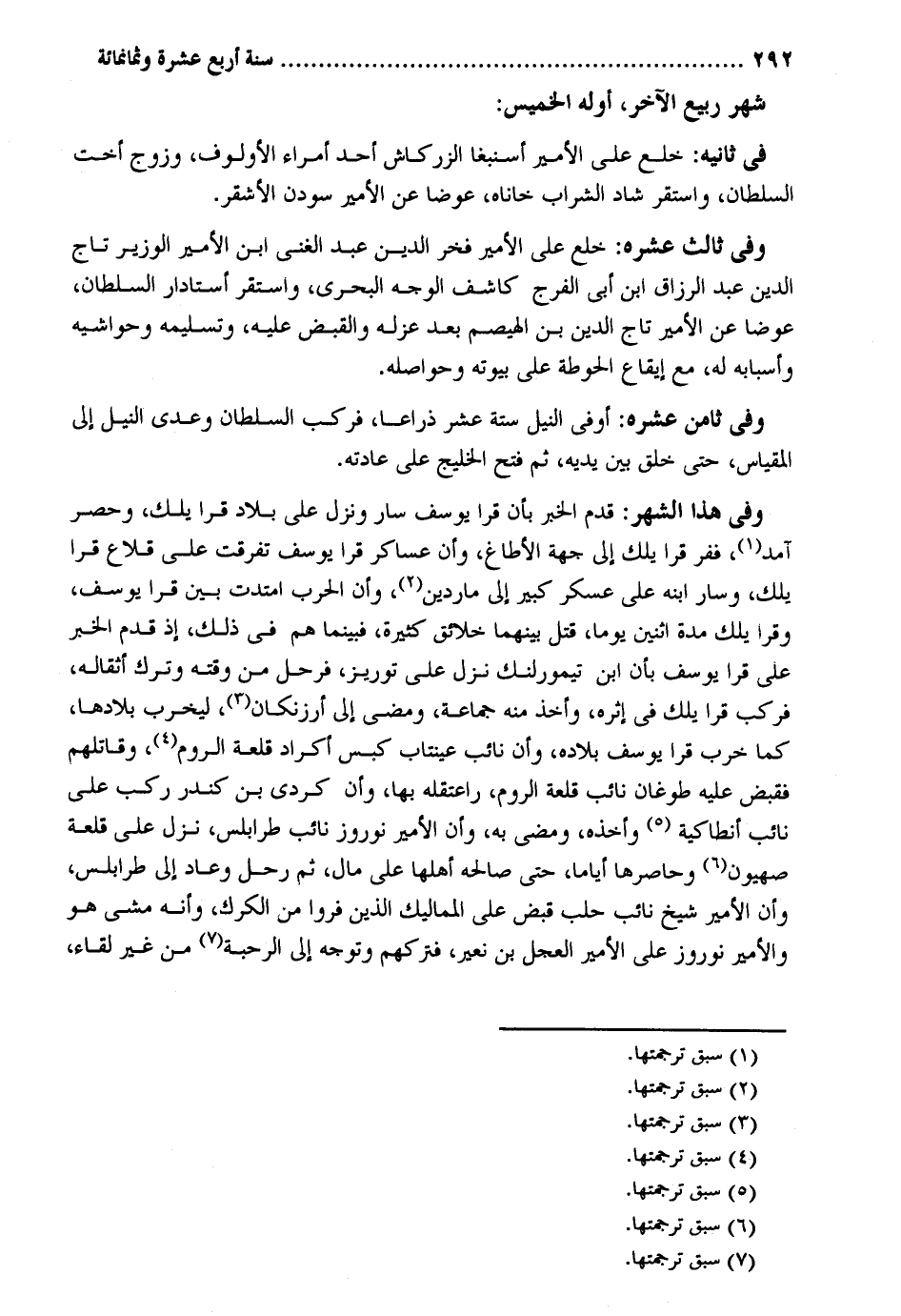 فِي ثَانِيه: خلع على الْأَمِير أسنبغا الزركاش أحد أُمَرَاء الأولوف وَزوج أُخْت السُّلْطَان وَاسْتقر شاد الشَّرَاب خاناه عوضا عَن الْأَمِير سودن الْأَشْقَر. وَفِي ثَالِث عشره: خلع على الْأَمِير فَخر الدّين عبد الْغَنِيّ ابْن الْأَمِير الْوَزير تَاج الدّين عبد الرَّزَّاق ابْن أبي الْفرج كاشف الْوَجْه البحري وَاسْتقر أستادار السُّلْطَان عوضا عَن الْأَمِير تَاج الدّين بن الهيصم بعد عَزله وَالْقَبْض عَلَيْهِ وتسليمه وحواشيه وأسبابه لَهُ مَعَ إِيقَاع الحوطة على بيوته وحواصله. وَفِي ثامن عشره: أوفى النّيل سِتَّة عشر ذِرَاعا فَركب السُّلْطَان وعدى النّيل إِلَى المقياس حَتَّى خلق بَين يَدَيْهِ ثمَّ فتح الخليج على عَادَته. وَفِي هَذَا الشَّهْر: قدم الْخَبَر بِأَن قرا يُوسُف سَار وَنزل على بِلَاد قرايلك وَحصر آمد ففر قرايلك إِلَى جِهَة الأطاغ وَأَن عَسَاكِر قرا يُوسُف تَفَرَّقت على قلاع قرايلك وَسَار ابْنه على عَسْكَر كَبِير إِلَى ماردين وَأَن الْحَرْب امتدت بَين قرا يُوسُف وقرايلك مُدَّة اثْنَيْنِ يَوْمًا قتل بَينهمَا خلائق كَثِيرَة فَبَيْنَمَا هم فِي ذَلِك إِذْ قدم الْخَبَر على قرا يُوسُف بِأَن ابْن تيمورلنك نزل على توريز فَرَحل من وقته وَترك أثقاله فَركب قرايلك فِي أَثَره وَأخذ مِنْهُ جمَاعَة وَمضى إِلَى أرزنكان ليخرب بلادها كَمَا خرب قرا يُوسُف بِلَاده وَأَن نَائِب عينتاب كبس أكراد قلعة الرّوم وَقَاتلهمْ فَقبض عَلَيْهِ طوغان نَائِب قلعة الرّوم واعتقله بهَا وَأَن كردِي بن كندر ركب على نَائِب إنطاكية وَأَخذه وَمضى بِهِ وَأَن الْأَمِير نوروز نَائِب طرابلس نزل على قلعة صهيون وحاصرها أَيَّامًا حَتَّى صَالحه أَهلهَا على مَال ثمَّ رَحل وَعَاد إِلَى طرابلس وَأَن الْأَمِير شيخ نَائِب حلب قبض على المماليك الَّذين فروا من الكرك وَأَنه مَشى هُوَ والأمير نوروز على الْأَمِير الْعجل بن نعير فتركهم وَتوجه إِلَى الرحبة من غير لِقَاء