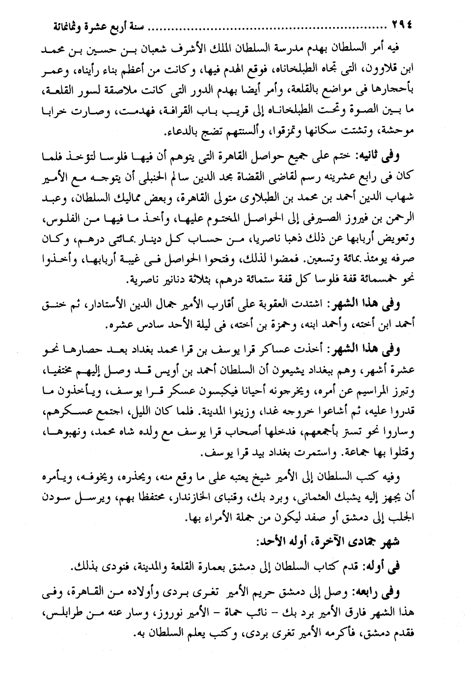 فِيهِ أَمر السُّلْطَان بهدم مدرسة السُّلْطَان الْملك الْأَشْرَف شعْبَان بن حُسَيْن بن مُحَمَّد ابْن قلاوون الَّتِي تجاه الطبلخاناه فَوَقع الْهدم فِيهَا وَكَانَت من أعظم بِنَاء رَأَيْنَاهُ وَعمر بأحجارها فِي مَوَاضِع بالقلعة وَأمر أَيْضا بهدم الدّور الَّتِي كَانَت ملاصقة لسور القلعة مَا بَين الصوة وَتَحْت الطبلخاناه إِلَى قريب بَاب القرافة فهدمت وَصَارَت خرابا موحشة وتشتت سكانها وتمزقوا وألسنتهم وَفِي ثَانِيه: ختم على جَمِيع حواصل الْقَاهِرَة الَّتِي يتَوَهَّم أَن فِيهَا فُلُوسًا لتؤخذ فَلَمَّا كَانَ فِي رَابِع عشرينه رسم لقَاضِي الْقُضَاة مجد الدّين سَالم الْحَنْبَلِيّ أَن يتَوَجَّه مَعَ الْأَمِير شهَاب الدّين أَحْمد بن مُحَمَّد بن الطبلاوي مُتَوَلِّي الْقَاهِرَة وَبَعض ممالك السُّلْطَان وَعبد الرَّحْمَن بن فَيْرُوز الصَّيْرَفِي إِلَى الحواصل الْمَخْتُوم عَلَيْهَا وَأخذ مَا فِيهَا من الْفُلُوس وتعويض أَرْبَابهَا عَن ذَلِك ذَهَبا ناصرياً من حِسَاب كل دِينَار بِمِائَتي دِرْهَم وَكَانَ صرفه يَوْمئِذٍ بِمِائَة وَتِسْعين. فَمَضَوْا لذَلِك وفتحوا الحواصل فِي غيبَة أَرْبَابهَا وَأخذُوا نَحْو خَمْسمِائَة قفة فُلُوسًا كل قفة سِتّمائَة دِرْهَم بِثَلَاثَة دَنَانِير ناصرية. وَفِي هَذَا الشَّهْر: اشتدت الْعقُوبَة على أقَارِب الْأَمِير جمال الدّين الأستادار ثمَّ خنق أَحْمد ابْن أُخْته وَأحمد ابْنه وَحَمْزَة بن أُخْته فِي لَيْلَة الْأَحَد سادس عشره. وَفِي هَذَا الشَّهْر: أخذت عَسَاكِر قرا يُوسُف بن قرا مُحَمَّد بَغْدَاد بعد حصارها نَحْو عشرَة أشهر وهم بِبَغْدَاد يشيعون أَن السُّلْطَان أَحْمد بن أويس قد وصل إِلَيْهِم مختفياً وتبرز المراسيم عَن أمره ويخرجونه أَحْيَانًا فيكبسون عَسْكَر قرا يُوسُف وَيَأْخُذُونَ مَا قدرُوا عَلَيْهِ ثمَّ أشاعوا خُرُوجه غَدا وزينوا الْمَدِينَة. فَلَمَّا كَانَ اللَّيْل اجْتمع عَسْكَرهمْ وَسَارُوا نَحْو تستر بأجمعهم فَدَخلَهَا أَصْحَاب قرا يُوسُف مَعَ وَلَده شاه مُحَمَّد ونهبوها وَقتلُوا بهَا جمَاعَة. واستمرت بَغْدَاد وَفِيه كتب السُّلْطَان إِلَى الْأَمِير شيخ يعتبه على مَا وَقع مِنْهُ ويحذره ويخوفه ويأمره أَن يُجهز إِلَيْهِ يشبك العثماني وَبرد بك وقنباي الخازندار محتفظاً بهم وَيُرْسل سودن الجلب إِلَى دمشق أَو صفد ليَكُون من جملَة الْأُمَرَاء بهَا. شهر جُمَادَى الْآخِرَة أَوله الْأَحَد: فِي أَوله: قدم كتاب السُّلْطَان إِلَى دمشق بعمارة القلعة وَالْمَدينَة فَنُوديَ بذلك. وَفِي رابعه: وصل إِلَى دمشق حَرِيم الْأَمِير تغري بردى وَأَوْلَاده من الْقَاهِرَة وَفِي هَذَا الشَّهْر فَارق الْأَمِير برد بك - نَائِب حماة - الْأَمِير نوروز وَسَار عَنهُ من طرابلس فَقدم دمشق فَأكْرمه الْأَمِير تغري بردى وَكتب يعلم السُّلْطَان بِهِ.