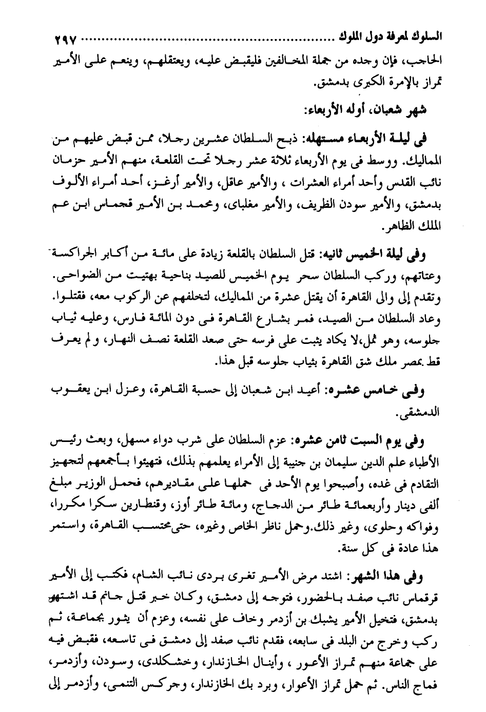 الْحَاجِب فَإِن وَحده من جملَة الْمُخَالفين فليقبض عَلَيْهِ، ويعتقلهم، وينعم على الْأَمِير تمراز بالإمرة الْكُبْرَى بِدِمَشْق. شهر شعْبَان أَوله الْأَرْبَعَاء: فِي لَيْلَة الْأَرْبَعَاء مستهله: ذبح السُّلْطَان عشْرين رجلا مِمَّن قبض عَلَيْهِم من المماليك. ووسط فِي يَوْم الْأَرْبَعَاء ثَلَاثَة عشر رجلا تَحت القلعة مِنْهُم الْأَمِير حزمان نَائِب الْقُدس وَأحد أُمَرَاء العشرات والأمير عَاقل والأمير أرغز أحد أُمَرَاء الألوف بِدِمَشْق والأمير سودن الظريف والأمير مغلباي وَمُحَمّد بن الْأَمِير قجماس ابْن عَم الْملك الظَّاهِر. وَفِي لَيْلَة الْخَمِيس ثَانِيه: قتل السُّلْطَان بالقلعة زِيَادَة على مائَة من أكَابِر الجراكسة وعتاتهم وَركب السُّلْطَان سحر يَوْم الْخَمِيس للصَّيْد بِنَاحِيَة بهتيت من الضواحي. وَتقدم إِلَى وَالِي الْقَاهِرَة أَن يقتل عشرَة من المماليك لتخلفهم عَن الرّكُوب مَعَه فَقتلُوا. وَعَاد السُّلْطَان من الصَّيْد فَمر بشارع الْقَاهِرَة فِي دون الْمِائَة فَارس وَعَلِيهِ ثِيَاب جُلُوسه وَهُوَ ثمل لَا يكَاد يثبت على فرسه حَتَّى صعد القلعة نصف النَّهَار وَلم يعرف قطّ بِمصْر ملك شقّ الْقَاهِرَة بِثِيَاب جُلُوسه قبل هَذَا. وَفِي خَامِس عشره: أُعِيد ابْن شعْبَان إِلَى حسبَة الْقَاهِرَة وعزل ابْن يَعْقُوب الدِّمَشْقِي. وَفِي يَوْم السبت ثامن عشره: عزم السُّلْطَان على شرب دَوَاء مسهل وَبعث رَئِيس الْأَطِبَّاء علم الدّين سُلَيْمَان بن جنيبة إِلَى الْأُمَرَاء يعلمهُمْ بذلك فتهيئوا بأجمعهم لتجهيز التقادم فِي غده وَأَصْبحُوا يَوْم الْأَحَد فِي حملهَا على مقاديرهم فَحمل الْوَزير مبلغ ألفي دِينَار وَأَرْبَعمِائَة طَائِر من الدَّجَاج وَمِائَة طَائِر إوز وقنطارين سكرا مكرواً وفواكه وحلوى وَغير ذَلِك. وَحمل نَاظر الْخَاص وَغَيره حَتَّى محتسب الْقَاهِرَة وَاسْتمرّ هَذَا عَادَة فِي كل سنة. وَفِي هَذَا الشَّهْر: اشْتَدَّ مرض الْأَمِير تغري بردى نَائِب الشَّام فَكتب إِلَى الْأَمِير قرقماس نَائِب صفد بالحضور فَتوجه إِلَى دمشق وَكَانَ خبر قتل جانم قد اشْتهر بِدِمَشْق فتخيل الْأَمِير يشبك بن أزدمر وَخَافَ على نَفسه وعزم أَن يثور بِجَمَاعَة ثمَّ ركب وَخرج من الْبَلَد فِي سابعه فَقدم نَائِب صفد إِلَى دمشق فِي تاسعه فَقبض فِيهِ على جمَاعَة مِنْهُم تمراز الْأَعْوَر وأينال الخازندار وخشكلدي وسودن وأزدمر فماج النَّاس. ثمَّ حمل تمراز الأعوار وَبرد بك الخازندار وجركس التنمي وأزدمر إِلَى