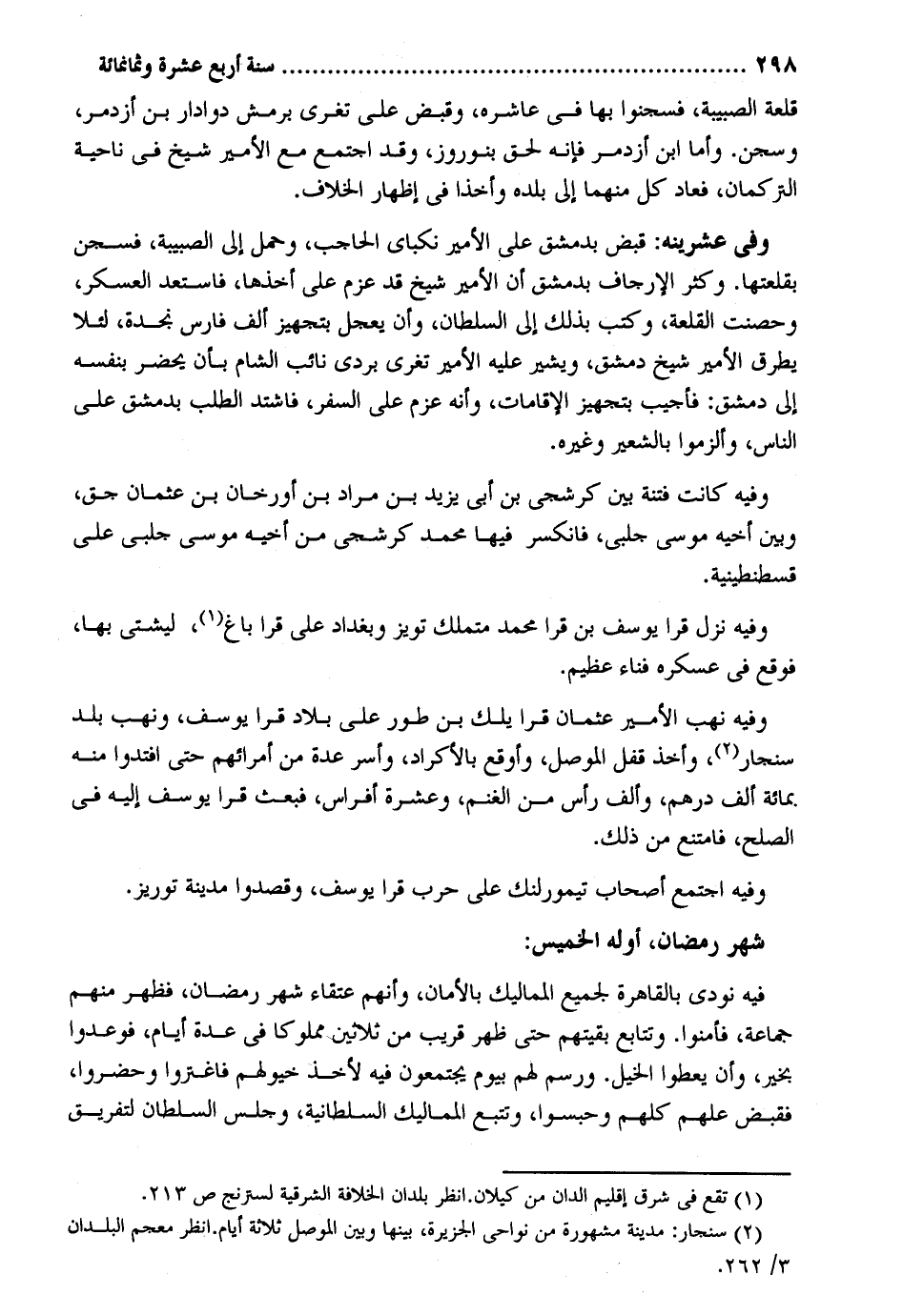 قلعة الصبيبة فسجنوا بهَا فِي عاشره وَقبض على تغري برمش دوادار بن أزدمر وسجن. وَأما ابْن أزدمر فَإِنَّهُ لحق بنوروز وَقد اجْتمع مَعَ الْأَمِير شيخ فِي نَاحيَة التركمان فَعَاد كل مِنْهُمَا إِلَى بَلَده وأخذا فِي إِظْهَار الْخلاف. وَفِي عشرينه: قبض بِدِمَشْق على الْأَمِير نكباي الْحَاجِب وَحمل إِلَى الصبيبة فسجن بقلعتها. وَكثر الإرجاف بِدِمَشْق أَن الْأَمِير شيخ قد عزم على أَخذهَا فاستعد الْعَسْكَر وحصنت القلعة وَكتب بذلك إِلَى السُّلْطَان وَأَن يعجل بتجهيز ألف فَارس نجدة لِئَلَّا يطْرق الْأَمِير شيخ دمشق وَيُشِير عَلَيْهِ الْأَمِير تغري بردى نَائِب الشَّام بِأَن يحضر بِنَفسِهِ إِلَى دمشق: فَأُجِيب بتجهيز الإقامات وَأَنه عزم على السّفر فَاشْتَدَّ الطّلب بِدِمَشْق على النَّاس وألزموا بِالشَّعِيرِ وَغَيره. وَفِيه كَانَت فتْنَة بَين كرشجي بن أبي يزِيد بن مُرَاد بن أورخان بن عُثْمَان جق وَبَين أَخِيه مُوسَى جلبي فانكسر فِيهَا مُحَمَّد كرشجي من أَخِيه مُوسَى جلبي على قسطنطينية. وَفِيه نزل قرا يُوسُف بن قرا مُحَمَّد متملك تويز وبغداد على قرا بَاغ ليشتي بهَا فَوَقع فِي عسكره فنَاء عَظِيم. وَفِيه نهب الْأَمِير عُثْمَان قرا يلك بن طور على بِلَاد قرا يُوسُف وَنهب بلد سنجار وَأخذ قفل الْموصل وأوقع بالأكراد وَأسر عدَّة من أَمْوَالهم حَتَّى افْتَدَوْا مِنْهُ بِمِائَة ألف دِرْهَم وَألف رَأس من الْغنم وَعشرَة أَفْرَاس فَبعث قرا يُوسُف إِلَيْهِ فِي الصُّلْح فَامْتنعَ من ذَلِك. وَفِيه أجتمع أَصْحَاب تيمورلنك على حَرْب قرا يُوسُف وقصدوا مَدِينَة توريز. شهر رَمَضَان أَوله الْخَمِيس: فِيهِ نُودي بِالْقَاهِرَةِ لجَمِيع المماليك بالأمان وَأَنَّهُمْ عُتَقَاء شهر رَمَضَان فَظهر مِنْهُم جمَاعَة فَأمنُوا. وتتابع بَقِيَّتهمْ حَتَّى ظهر قريب من ثَلَاثِينَ مَمْلُوكا فِي عدَّة أَيَّام فوعدوا بِخَير وَأَن يُعْطوا الْخَيل. ورسم لَهُم بِيَوْم يَجْتَمعُونَ فِيهِ لأخذ خيولهم فاغتروا وحضروا فَقبض عَلَيْهِم كلهم وحبسوا وتتبع الممالك السُّلْطَانِيَّة وَجلسَ السُّلْطَان لتفريق