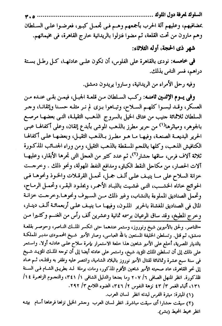 بمضافيهم وَعَلَيْهِم آلَة الْحَرْب بأجمعهم وهم فِي تجمل كَبِير فعرضوا على السُّلْطَان وهم مارون من تَحت القلعة ثمَّ مضوا فنزلوا بالريدانية خَارج الْقَاهِرَة فِي مخيماتهم. شهر ذِي الْحجَّة أَوله الثُّلَاثَاء: فِي خامسه: نُودي بِالْقَاهِرَةِ على الْفُلُوس أَن تكون على عَادَتهَا كل رَطْل بِسِتَّة دَرَاهِم فسر النَّاس بذلك. وَفِيه رَحل الْأُمَرَاء من الريدانية وَسَارُوا يُرِيدُونَ دمشق. وَفِي يَوْم الِاثْنَيْنِ ثامنه: ركب السُّلْطَان من قلعة الْجَبَل فِيمَن بَقِي عِنْده من الْعَسْكَر وَقد لبسوا كلهم السِّلَاح وتباهوا بزِي لم نر مثله حسنا وإتقاناً وجر السُّلْطَان ثَلَاثمِائَة جنيب من عتاق الْخَيل بالسروج الذَّهَب الثَّقِيلَة الَّتِي بَعْضهَا مرصع بالجوهر ومياثرها من حَرِير مطرز بِالذَّهَب الْمُوشى بأبدع إتقان وعَلى أكفالها عبي الْحَرِير البديعة الصَّنْعَة وفيهَا مَا هُوَ مطرز بِالذَّهَب الثقيل وَبَعضهَا على أكفالها الكنافيش الذَّهَب وَكلهَا باللجم المسقطة بِالذَّهَب الثقيل وَمن وَرَاء الجنائب الْمَذْكُورَة ثَلَاثَة آلَاف فرس سَاقهَا جشار ثمَّ عدد كثير من الْعجل الَّتِي تجرها الأبقار وَعَلَيْهَا آلَات الْحصار من مكاحل النقط الْكِبَار ومدافع النفط المهولة وَنَحْو ذَلِك. وَخرجت خزانَة السِّلَاح على مَا ينيف على ألف جمل تحمل القرقلات والخوذ وَنَحْوهَا فِي الْحَوَائِج خاناه الْخشب الَّتِي غشيت باللباد الْأَحْمَر وبجلود الْبَقر وَتحمل الرماح وَتحمل الصناديق المملوءة بالنشاب وَغير ذَلِك من السيوف وَنَحْوهَا. وَخرجت خزانَة المَال فِي الصناديق المغشاة بالحرير الملون وفيهَا مَا ينيف على أَرْبَعمِائَة ألف دِينَار وَخرج المطبخ وَقد سَاق الرعيان برسمه ثَمَانِيَة وَعشْرين ألف رَأس من الْغنم وَكَثِيرًا من