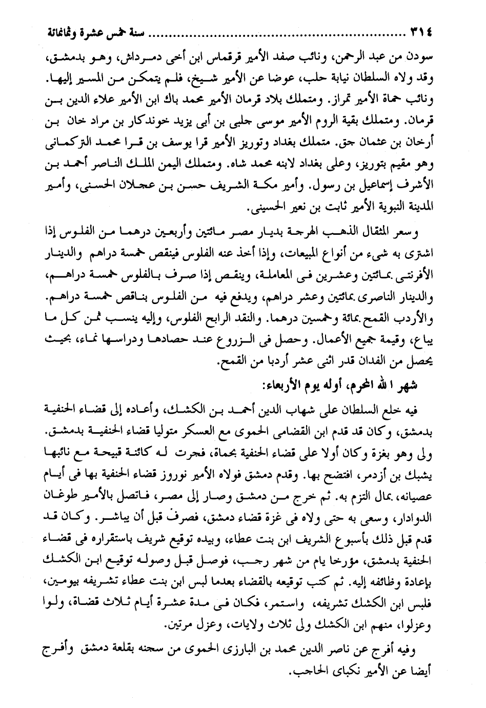 سودن من عبد الرَّحْمَن ونائب صفد الْأَمِير قرقماس ابْن أخي دمرداش وَهُوَ بِدِمَشْق وَقد ولاه السُّلْطَان نِيَابَة حلب عوضا عَن الْأَمِير شيخ فَلم يتَمَكَّن من الْمسير إِلَيْهَا. ونائب حماة الْأَمِير تمراز. ومتملك بِلَاد قرمان الْأَمِير مُحَمَّد باك ابْن الْأَمِير عَلَاء الدّين بن قرمان. ومتملك بَقِيَّة الرّوم الْأَمِير مُوسَى جلبي بن أبي يزِيد خوندكار بن مُرَاد خَان بن أرخان بن عُثْمَان جق. متملك بَغْدَاد وتوريز الْأَمِير قرا يُوسُف بن قرا مُحَمَّد التركماني وَهُوَ مُقيم بتوريز وعَلى بَغْدَاد لِابْنِهِ مُحَمَّد شاه. ومتملك الْيمن الْملك النَّاصِر أَحْمد بن الْأَشْرَف إِسْمَاعِيل بن رَسُول. وأمير مَكَّة الشريف حسن بن عجلَان الحسني وأمير الْمَدِينَة النَّبَوِيَّة الْأَمِير ثَابت بن نعير الْحُسَيْنِي. وسعر المثقال الذَّهَب الهرجة بديار مصر مِائَتَيْنِ وَأَرْبَعين درهما من الْفُلُوس إِذا اشْترى بِهِ شَيْء من أَنْوَاع المبيعات وَإِذا أَخذ عَنهُ الْفُلُوس فينقص خَمْسَة دَرَاهِم وَالدِّينَار الأفرنتي بمائتين وَعشْرين فِي الْمُعَامَلَة وَينْقص إِذا صرف بالفلوس خَمْسَة دَرَاهِم وَالدِّينَار الناصري بمائتين وَعشر دَرَاهِم وَيدْفَع فِيهِ من الْفُلُوس بناقص خَمْسَة دَرَاهِم. والأردب الْقَمْح بِمِائَة وَخمسين درهما. والنقد الرابح الْفُلُوس وَإِلَيْهِ ينْسب مِمَّن كل مَا يُبَاع وَقِيمَة جَمِيع الْأَعْمَال. وَحصل فِي الزروع عِنْد حصادها ودراسها نَمَاء بِحَيْثُ يحصل من الفدان قدر اثْنَي عشر أردباً من الْقَمْح. شهر الله الْمحرم أَوله يَوْم الْأَرْبَعَاء: فِيهِ خلع السُّلْطَان على شهَاب الدّين أَحْمد بن الكشك وَأَعَادَهُ إِلَى قَضَاء الْحَنَفِيَّة بِدِمَشْق وَكَانَ قد قدم ابْن القضامي الْحَمَوِيّ مَعَ الْعَسْكَر مُتَوَلِّيًا قَضَاء الْحَنَفِيَّة بِدِمَشْق. ولي وَهُوَ بغزة وَكَانَ أَولا على قَضَاء الْحَنَفِيَّة بحماة فجرت لَهُ كائنة قبيحة مَعَ نائبها يشبك بن أزدمر افتضح بهَا. وَقدم دمشق فولاه الْأَمِير نوروز قَضَاء الْحَنَفِيَّة بهَا فِي أَيَّام عصيانه بِمَال الْتزم بِهِ. ثمَّ خرج من دمشق وَصَارَ إِلَى مصر فاتصل بالأمير طوغان الدوادار وسعى بِهِ حَتَّى ولاه فِي غَزَّة قَضَاء دمشق فصرت قبل أَن يُبَاشر. وَكَانَ قد قدم قبل ذَلِك بإسبوع الشريف ابْن بنت عَطاء وَبِيَدِهِ توقيع شرِيف باستقراره فِي قَضَاء الْحَنَفِيَّة بِدِمَشْق مؤرخاً أَيَّام من شهر رَجَب فوصل قبل وُصُوله توقيع ابْن الكشك بِإِعَادَة وظائفه إِلَيْهِ. ثمَّ كتب توقيعه بِالْقضَاءِ بَعْدَمَا لبس ابْن بنت عَطاء تشريفه بيومين فَلبس ابْن الكشك تشريفه وَاسْتمرّ فَكَانَ فِي مُدَّة عشرَة أَيَّام ثَلَاث قُضَاة ولوا وعزلوا مِنْهُم ابْن الكشك ولي ثَلَاث ولايات وعزل مرَّتَيْنِ. وَفِيه أفرج عَن نَاصِر الدّين مُحَمَّد بن الْبَارِزِيّ الْحَمَوِيّ من سجنه بقلعة دمشق وَأَفْرج أَيْضا عَن الْأَمِير نكباي الْحَاجِب.
