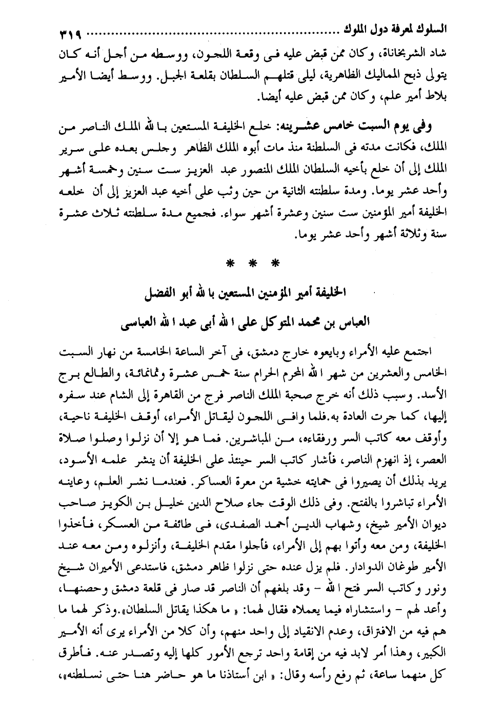 شاد الشربخاناة وَكَانَ مِمَّن قبض عَلَيْهِ فِي وقْعَة اللجون ووسطه من أحل أَنه كَانَ يتَوَلَّى ذبح المماليك الظَّاهِرِيَّة ليل قَتلهمْ السُّلْطَان بقلعة الْجَبَل. ووسط أَيْضا الْأَمِير بلاط أَمِير علم وَكَانَ مِمَّن قبض عَلَيْهِ أَيْضا. وَفِي يَوْم السبت خَامِس عشرينه: خلع الْخَلِيفَة المستعين بِاللَّه الْملك النَّاصِر من الْملك فَكَانَت مدَّته فِي السلطنة مُنْذُ مَاتَ أَبوهُ الْملك الظَّاهِر وَجلسَ بعده على سَرِير الْملك إِلَى أَن خلع بأَخيه السُّلْطَان الْملك الْمَنْصُور عبد الْعَزِيز سِتّ سِنِين وَخَمْسَة أشهر وَأحد عشر يَوْمًا. وَمُدَّة سلطنته الثَّانِيَة من حِين وثب على أَخِيه عبد الْعَزِيز إِلَى أَن خلعه الْخَلِيفَة أَمِير الْمُؤمنِينَ سِتّ سِنِين وَعشرَة أشهر سَوَاء. فَجَمِيع مُدَّة سلطته ثَلَاث عشرَة سنة وَثَلَاثَة أشهر وَأحد عشر يَوْمًا. الْخَلِيفَة المستعين بِاللَّه أَبُو الْفضل الْعَبَّاس بن مُحَمَّد المتَوَكل على الله أبي عبد الله العباسي اجْتمع عَلَيْهِ الْأُمَرَاء وَبَايَعُوهُ خَارج دمشق فِي آخر السَّاعَة الْخَامِسَة من نَهَار السبت الْخَامِس وَالْعِشْرين من شهر الله الْمحرم الْحَرَام سنة خمس عشرَة وَثَمَانمِائَة والطالع برج الْأسد. وَسبب ذَلِك أَنه خرج صُحْبَة الْملك النَّاصِر فرج من الْقَاهِرَة إِلَى الشَّام عِنْد سَفَره إِلَيْهَا كَمَا جرت الْعَادة بِهِ. فَلَمَّا وافى اللجون لِيُقَاتل الْأُمَرَاء أوقف الْخَلِيفَة نَاحيَة وأوقف مَعَه كَاتب السِّرّ ورفقاءه من المباشرين. فَمَا هُوَ إِلَّا أَن نزلُوا وصلوا صَلَاة الْعَصْر إِذْ انهزم النَّاصِر فَأَشَارَ كَاتب السِّرّ حِينَئِذٍ على الْخَلِيفَة أَن ينشر علمه الْأسود يُرِيد بذلك أَن يصيروا فِي حمايته خشيَة من معرة العساكر. فعندما نشر الْعلم وعاينه الْأُمَرَاء تباشروا بِالْفَتْح. وَفِي ذَلِك الْوَقْت جَاءَ صَلَاح الدّين خَلِيل بن الكوير صَاحب ديوَان الْأَمِير شيخ وشهاب الدّين أَحْمد الصَّفَدِي فِي طَائِفَة من الْعَسْكَر فَأخذُوا الْخَلِيفَة وَمن مَعَه وَأتوا بهم إِلَى الْأُمَرَاء فأجلوا مقدم الْخَلِيفَة وأنزلوه وَمن مَعَه عِنْد الْأَمِير طوغان الدوادار. فَلم يزل عِنْده حَتَّى نزلُوا ظَاهر دمشق فاستدعى الأميران شيخ وَنور وَكَاتب السِّرّ فتح الله - وَقد بَلغهُمْ أَن النَّاصِر قد صَار فِي قلعة دمشق وحصنها وَأعد لَهُم - واستشاراه فِيمَا يعملاه فَقَالَ لَهما: مَا هَكَذَا يُقَاتل السُّلْطَان. وَذكر لَهما مَا هم فِيهِ من الِافْتِرَاق وَعدم الانقياد إِلَى وَاحِد مِنْهُم وَأَن كلا من الْأُمَرَاء يرى أَنه الْأَمِير الْكَبِير وَهَذَا أَمر لابد فِيهِ من إِقَامَة وَاحِد ترجع الْأُمُور كلهَا إِلَيْهِ وتصدر عَنهُ. فَأَطْرَقَ كل مِنْهُمَا سَاعَة ثمَّ رفع رَأسه وَقَالَ: ابْن أستاذنا مَا هُوَ حَاضر هُنَا حَتَّى نسلطه