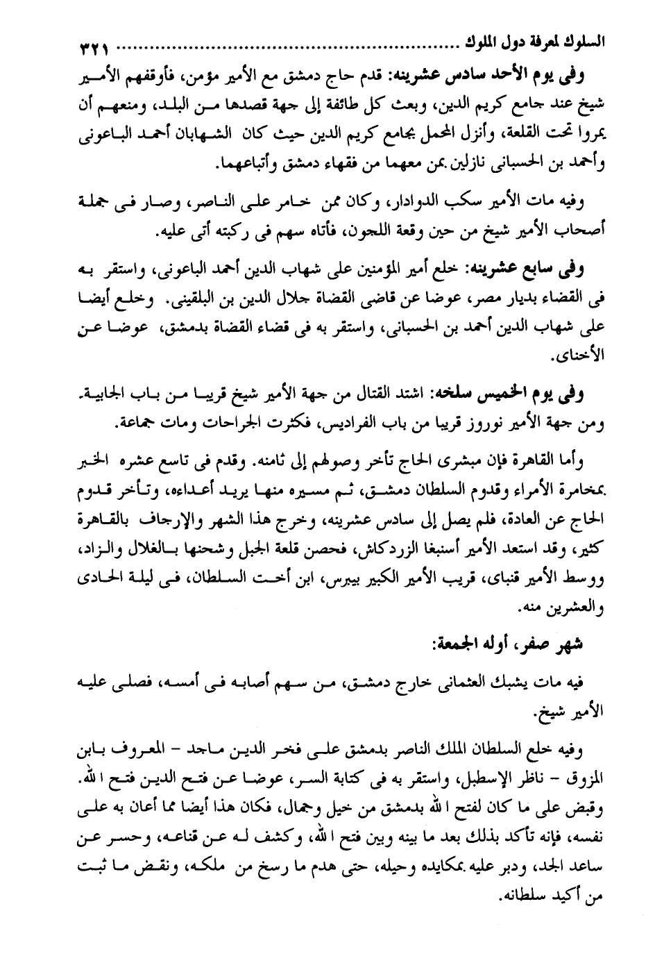 وَفِي يَوْم الْأَحَد سادس عشرينه: قدم حَاج دمشق مَعَ الْأَمِير مُؤمن فأوقفهم الْأَمِير شيخ عِنْد جَامع كريم الدّين وَبعث كل طَائِفَة إِلَى جِهَة قَصدهَا من الْبَلَد ومنعهم أَن يمروا تَحت القلعة وَأنزل الْمحمل بِجَامِع كريم الدّين حَيْثُ كَانَ الشهابان أَحْمد الباعوني وَأحمد بن الحسباني نازلين بِمن مَعَهُمَا من فُقَهَاء دمشق وأتباعهما. وَفِيه مَاتَ الْأَمِير سكب الدوادار وَكَانَ مِمَّن خامر على النَّاصِر وَصَارَ فِي جملَة أَصْحَاب الْأَمِير شيخ من حِين وقْعَة اللجون فَأَتَاهُ سهم فِي ركبته أَتَى عَلَيْهِ. وَفِي سَابِع عشرينه: خلع أَمِير الْمُؤمنِينَ على شهَاب الدّين أَحْمد الباعوني وَاسْتقر بِهِ فِي الْقَضَاء بديار مصر عوضا عَن قَاضِي الْقُضَاة جلال الدّين بن البُلْقِينِيّ. وخلع أَيْضا على شهَاب الدّين أَحْمد بن الحسباني وَاسْتقر بِهِ فِي قَضَاء الْقُضَاة بِدِمَشْق عوضا عَن الأخناي. وَفِي يَوْم الْخَمِيس سلخه: اشْتَدَّ الْقِتَال من جِهَة الْأَمِير شيخ قَرِيبا من بَاب الْجَابِيَة - وَمن جِهَة الْأَمِير نوروز قَرِيبا من بَاب الفراديس فكثرت الْجِرَاحَات وَمَات جمَاعَة. وَأما الْقَاهِرَة فَإِن مبشري الْحَاج تَأَخّر وصولهم إِلَى ثامنه. وَقدم فِي تَاسِع عشره الْخَبَر بمخامرة الْأُمَرَاء وقدوم السُّلْطَان دمشق ثمَّ مسيره مِنْهَا يُرِيد أعداءه وَتَأَخر قدوم الْحَاج عَن الْعَادة فَلم يصل إِلَى سادس عشرينه وَخرج هَذَا الشَّهْر والإرجاف بِالْقَاهِرَةِ كثير وَقد استعد الْأَمِير أسنبغا الزردكاش فحصن قلعة الْجَبَل وشحنها بالغلال والزاد ووسط الْأَمِير قنباي قريب شهر صفر أَوله الْجُمُعَة: فِيهِ مَاتَ يشبك العثماني خَارج دمشق من سهم أَصَابَهُ فِي أمسه فصلى عَلَيْهِ الْأَمِير شيخ. وَفِيه خلع السُّلْطَان الْملك النَّاصِر بِدِمَشْق على فَخر الدّين ماجد - الْمَعْرُوف بِابْن المزوق - نَاظر الإسطبل وَاسْتقر بِهِ فِي كِتَابَة السِّرّ عوضا عَن فتح الدّين فتح الله. وَقبض على مَا كَانَ لفتح الله بِدِمَشْق من خيل وجمال فَكَانَ هَذَا أَيْضا مِمَّا أعَان بِهِ على نَفسه فَإِنَّهُ تَأَكد بذلك بعد مَا بَينه وَبَين فتح الله وكشف لَهُ عَن قناعه وحسر عَن ساعد الْجد ودبر عَلَيْهِ بمكايده وحيله حَتَّى هدم مَا رسخ من ملكه وَنقض مَا ثَبت من أكيد سُلْطَانه.