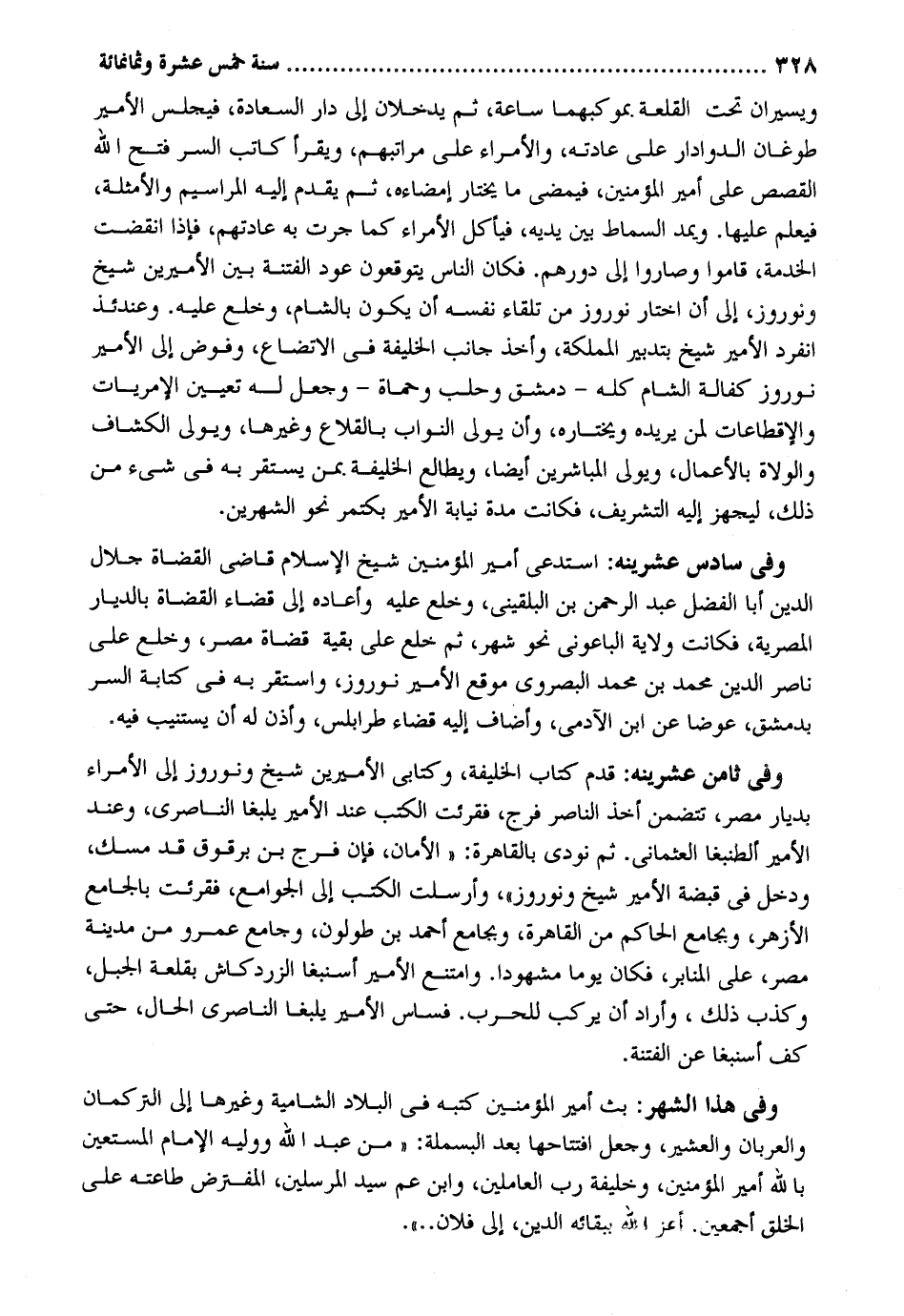 ويسيران تَحت القلعة بموكبهما سَاعَة ثمَّ يدخلَانِ إِلَى دَار السَّعَادَة فيجلس الْأَمِير طوغان الدوادار على عَادَته والأمراء على مَرَاتِبهمْ وَيقْرَأ كَاتب السِّرّ فتح الله الْقَصَص على أَمِير الْمُؤمنِينَ فيمضي مَا يخْتَار إمضاءه ثمَّ يقدم إِلَيْهِ المراسيم والأمثلة فَيعلم عَلَيْهَا. ويمد السماط بَين يَدَيْهِ فيأكل الْأُمَرَاء كَمَا جرت بِهِ عَادَتهم فَإِذا انْقَضتْ الْخدمَة قَامُوا وصاروا إِلَى دُورهمْ. فَكَانَ النَّاس يتوقعون عود الْفِتْنَة بَين الأميرين شيخ ونوروز إِلَى أَن اخْتَار نوروز من تِلْقَاء نَفسه أَن يكون بِالشَّام وخلع عَلَيْهِ. وعندئذ انْفَرد الْأَمِير شيخ بتدبير المملكة وَأخذ جَانب الْخَلِيفَة فِي الأتساع وفوض إِلَى الْأَمِير نوروز كَفَالَة الشَّام كُله - دمشق وحلب وحماة - وَجعل لَهُ تعْيين الإمريات والإقطاعات لمن يُريدهُ ويختاره وَأَن يولي النواب بالقلاع وَغَيرهَا ويولي الْكَشَّاف والولاة بِالْأَعْمَالِ ويولي المباشرين أَيْضا ويطالع الْخَلِيفَة بِمن يسْتَقرّ بِهِ فِي شَيْء من ذَلِك ليجهز إِلَيْهِ التشريف فَكَانَت مُدَّة نِيَابَة الْأَمِير بكتمر نَحْو الشَّهْرَيْنِ. وَفِي سادس عشرينه: استدعى أَمِير الْمُؤمنِينَ شيخ الْإِسْلَام قَاضِي الْقُضَاة جلال الدّين أَبَا الْفضل عبد الرَّحْمَن بن البُلْقِينِيّ وخلع عَلَيْهِ وَأَعَادَهُ إِلَى قَضَاء الْقُضَاة بالديار المصرية فَكَانَت ولَايَة الباعوني نَحْو شهر ثمَّ خلع على بَقِيَّة قُضَاة مصر وخلع على نَاصِر الدّين مُحَمَّد بن مُحَمَّد البصروي موقع الْأَمِير نوروز وَاسْتقر بِهِ فِي كِتَابَة السِّرّ بِدِمَشْق عوضا عَن ابْن الْآدَمِيّ وأضاف إِلَيْهِ قَضَاء طرابلس وَأذن لَهُ أَن يَسْتَنِيب فِيهِ. وَفِي ثامن عشرينه: قدم كتاب الْخَلِيفَة وكتابي الأميرين شيخ ونوروز إِلَى الْأُمَرَاء بديار مصر تَتَضَمَّن أَخذ النَّاصِر فرج فقرئت الْكتب عِنْد الْأَمِير يلبغا الناصري وَعند الْأَمِير ألطنبغا العثماني. ثمَّ نُودي بِالْقَاهِرَةِ: الْأمان فَإِن فرج بن برقوق قد مسك وَدخل فِي قَبْضَة الْأَمِير شيخ ونوروز وَأرْسلت الْكتب إِلَى الْجَوَامِع فقرئت بالجامع الْأَزْهَر وبجامع الْحَاكِم من الْقَاهِرَة وبجامع أَحْمد بن طولون وجامع عَمْرو من مَدِينَة مصر على المنابر فَكَانَ يَوْمًا مشهوداً. وَامْتنع الْأَمِير أسنبغا الزردكاش بقلعة الْجَبَل وَكذب ذَلِك وَأَرَادَ أَن يركب للحرب. فساس الْأَمِير يلبغا الناصري الْحَال حَتَّى كف أسنبغا عَن الْفِتْنَة. وَفِي هَذَا الشَّهْر: بَث أَمِير الْمُؤمنِينَ كتبه فِي الْبِلَاد الشامية وَغَيرهَا إِلَى التركمان والعربان والعشير وَجعل افتتاحها بعد الْبَسْمَلَة: من عبد الله ووليه الإِمَام المستعين بِاللَّه أَمِير الْمُؤمنِينَ وَخَلِيفَة رب العاملين وَابْن عَم سيد الْمُرْسلين المفترض طَاعَته على الْخلق أَجْمَعِينَ. أعز الله بِبَقَائِهِ الدّين إِلَى فلَان ...