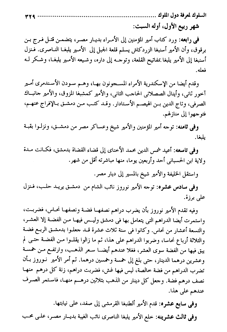 شهر ربيع الأول أَوله السبت: فِي رابعه: ورد كتاب أَمِير الْمُؤمنِينَ إِلَى الْأُمَرَاء بديار مصر يتَضَمَّن قتل فرج بن برقوق وَأَن الْأَمِير أسنبغا الزردكاش يسلم قلعة الْجَبَل إِلَى الْأَمِير يلبغا الناصري. فَنزل أسنبغا إِلَى الْأَمِير يلبغا بمفاتيح القلعة وَتوجه إِلَى دَاره وشيعه الْأَمِير يلبغا وشكر لَهُ فعله. وَقدم أَيْضا من الْإسْكَنْدَريَّة الْأُمَرَاء المسجونون بهَا وهم سودن الأسندمري أَمِير أخور ثَانِي وأينال الصصلاني الْحَاجِب الثَّانِي والأمير كمشبغا المزوق والأمير جانباك الصرفي وتاج الدّين بن الهيصم الأستادار. وَقد كتب من دمشق بالإفراج عَنْهُم لتوجهوا إِلَى مَنَازِلهمْ. وَفِي ثامنه: توجه أَمِير الْمُؤمنِينَ والأمير شيخ وعساكر مصر من دمشق ونزلوا بقبة يلبغا. وَفِي تاسعه: أُعِيد شمس الدّين مُحَمَّد الأخناي إِلَى قَضَاء الْقُضَاة بِدِمَشْق فَكَانَت مُدَّة ولَايَة ابْن الحسباني أحد وَأَرْبَعين يَوْمًا مِنْهَا مُبَاشَرَته أقل من شهر. واستقل الْخَلِيفَة والأمير شيخ بِالْمَسِيرِ إِلَى ديار مصر. وَفِي سادس عشرَة: توجه الْأَمِير نوروز نَائِب الشَّام من دمشق يُرِيد حلب فَنزل على بَرزَة. وَفِيه تقدم الْأَمِير نوروز بِأَن يضْرب دَرَاهِم نصفهَا فضَّة وَنِصْفهَا نُحَاس فَضربت واستمرت أَيْضا الدَّرَاهِم الَّتِي يتعامل بهَا فِي دمشق وَلَيْسَ فِيهَا من الْفضة إِلَّا الْعشْر والتسعة أعشار من نُحَاس وَكَانُوا فِي سنه ثَلَاث عشرَة قد جعلُوا بِدِمَشْق الرّبع فضَّة وَالثَّلَاثَة أَربَاع نُحَاسا وضربوا الدَّرَاهِم على هَذَا ثمَّ مَا زَالُوا يقلوا من الْفضة حَتَّى لم يبْق فِيهَا من الْفضة سوى الْعشْر فغلا عِنْدهم أَيْضا سعر الذَّهَب وارتفع من خَمْسَة وَعشْرين درهما الدِّينَار حَتَّى بلغ إِلَى خَمْسَة وَخمسين درهما. ثمَّ أَمر الْأَمِير نوروز بِأَن تضرب الدَّرَاهِم من فضَّة خَالِصَة لَيْسَ فِيهَا غش فَضربت دَرَاهِم زنة كل دِرْهَم مِنْهَا نصف دِرْهَم فضَّة. وَجعل كل دِينَار من الذَّهَب بِثَلَاثِينَ دِرْهَم مِنْهَا فاستمر الصّرْف عِنْدهم على هَذَا. وَفِي سَابِع عشره: قدم الْأَمِير ألطنبغا القرمشي إِلَى صفد على نيابتها. وَفِي ثَالِث عشرينه: خلع الْأَمِير يلبغا الناصري نَائِب الْغَيْبَة بديار مصر على محب