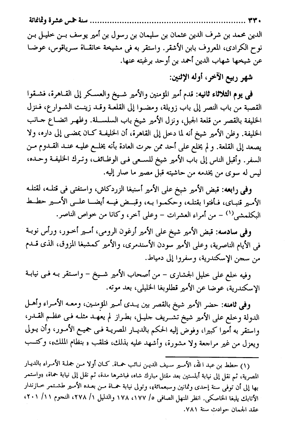 الدّين مُحَمَّد بن شرف الدّين عُثْمَان بن سُلَيْمَان بن رَسُول بن أَمِير يُوسُف بن خَلِيل بن نوح الكرادي الْمَعْرُوف بِابْن الْأَشْقَر. وَاسْتقر بِهِ فِي مشيخة خانقاة سرياقوس عوضا عَن شيخها شهَاب الدّين أَحْمد بن أوحد برغبته عَنْهَا. شهر ربيع الآخر أَوله الِاثْنَيْنِ: فِي يَوْم الثُّلَاثَاء ثَانِيه: قدم أَمِير الْمُؤمنِينَ والأمير شيخ والعسكر إِلَى الْقَاهِرَة فشقوا القصبة من بَاب النَّصْر إِلَى بَاب زويلة ومضوا إِلَى القلعة وَقد زينت الشوارع فَنزل الْخَلِيفَة بِالْقصرِ من قلعة الْجَبَل وَنزل الْأَمِير شيخ بَاب السلسلة. وَظهر اتضاع جَانب الْخَلِيفَة. وَظن الْأَمِير شيخ أَنه لما دخل إِلَى الْقَاهِرَة أَن الْخَلِيفَة كَانَ يمْضِي إِلَى دَاره وَلَا يصعد إِلَى القلعة. وَلم يخلع على أحد مِمَّن جرت الْعَادة بِأَنَّهُ يخلع عَلَيْهِ عِنْد الْقدوم من السّفر. وَأَقْبل النَّاس إِلَى بَاب الْأَمِير شيخ للسعي فِي الْوَظَائِف وَترك الْخَلِيفَة وَحده لَيْسَ لَهُ سوى من يَخْدمه من حَاشِيَته قبل مصير مَا صَار إِلَيْهِ. وَفِي رابعه: قبض الْأَمِير شيخ على الْأَمِير أسنبغا الزردكاش واستفتى فِي قَتله لقَتله الْأَمِير قنباي فأفتوا بقتْله وحكموا بِهِ وَقبض فِيهِ أَيْضا على الْأَمِير حطط البكلمشي - من أُمَرَاء العشرات - وعَلى آخر وَكَانَا من خَواص النَّاصِر. وَفِي سادسه: قبض الْأَمِير شيخ على الْأَمِير أرغون الرُّومِي أَمِير أخور وَرَأس نوبَة فِي الْأَيَّام الناصرية وعَلى الْأَمِير سودن الأسندمري والأمير كمشبغا المزوق الَّذِي قدم من سجن الْإسْكَنْدَريَّة وسفروا إِلَى دمياط. وَفِيه خلع على خَلِيل الجشاري - من أَصْحَاب الْأَمِير شيخ - وَاسْتقر بِهِ فِي نِيَابَة الْإسْكَنْدَريَّة عوضا عَن الْأَمِير قطلوبغا الخليلي بعد مَوته. وَفِي ثامنه: حضر الْأَمِير شيخ بِالْقصرِ بَين يَدي أَمِير الْمُؤمنِينَ وَمَعَهُ الْأُمَرَاء وَأهل الدولة وخلع على الْأَمِير شيخ تشريف جليل بطراز لم يعْهَد مثله فِي عظم الْقدر وَاسْتقر بِهِ أَمِيرا كَبِيرا وفوض إِلَيْهِ الحكم بالديار المصرية فِي جَمِيع الْأُمُور وَأَن يولي ويعزل من غير مُرَاجعَة وَلَا مشورة وَأشْهد عَلَيْهِ بذلك فتلقب بنظام الْملك وَكتب