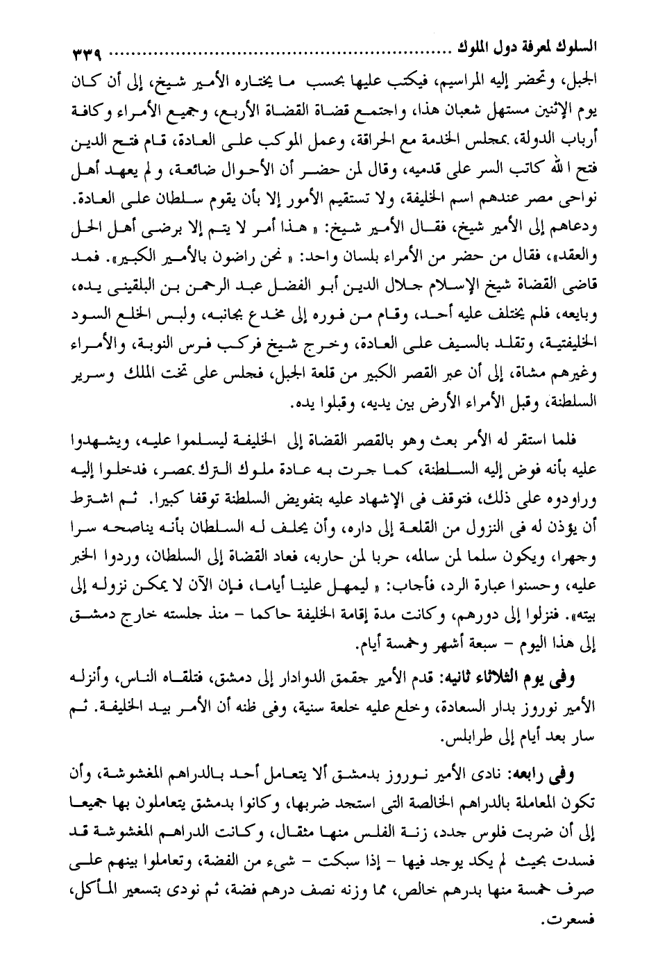 الْجَبَل وتحضر إِلَيْهِ المراسيم فَيكْتب عَلَيْهَا بِحَسب مَا يختاره الْأَمِير شيخ إِلَى أَن كَانَ يَوْم الِاثْنَيْنِ مستهل شعْبَان هَذَا وَاجْتمعَ قُضَاة الْقُضَاة الْأَرْبَع وَجَمِيع الْأُمَرَاء وكافة أَرْبَاب الدولة بِمَجْلِس الْخدمَة مَعَ الحراقة وَعمل الموكب على الْعَادة قَامَ فتح الدّين فتح الله كَاتب السِّرّ على قَدَمَيْهِ وَقَالَ لمن حضر أَن الْأَحْوَال ضائعة وَلم يعْهَد أهل نواحي مصر عِنْدهم اسْم الْخَلِيفَة وَلَا تستقيم الْأُمُور إِلَّا بِأَن يقوم سُلْطَان على الْعَادة. ودعاهم إِلَى الْأَمِير شيخ فَقَالَ الْأَمِير شيخ: هَذَا أَمر لَا يتم إِلَّا برضى أهل الْحل وَالْعقد فَقَالَ من حضر من الْأُمَرَاء بِلِسَان وَاحِد: نَحن راضون بالأمير الْكَبِير. فَمد قَاضِي الْقُضَاة شيخ الْإِسْلَام جلال الدّين أَبُو الْفضل عبد الرَّحْمَن بن البُلْقِينِيّ يَده وَبَايَعَهُ فَلم يخْتَلف عَلَيْهِ أحد وَقَامَ من فوره إِلَى مخدع بجانبه وَلبس الْخلْع السود الخليفتية وتقلد بِالسَّيْفِ على الْعَادة وَخرج شيخ مركب فرس النّوبَة والأمراء وَغَيرهم مشَاة إِلَى أَن عبر الْقصر الْكَبِير من قلعة الْجَبَل فَجَلَسَ على تخت الْملك وسرير السلطنة وَقبل الْأُمَرَاء الأَرْض بَين يَدَيْهِ فَلَمَّا اسْتَقر لَهُ الْأَمر بعث وَهُوَ بِالْقصرِ الْقُضَاة إِلَى الْخَلِيفَة ليسلموا عَلَيْهِ ويشهدوا عَلَيْهِ بِأَنَّهُ فوض إِلَيْهِ السلطنة كَمَا جرت بِهِ عَادَة مُلُوك التّرْك بِمصْر فَدَخَلُوا إِلَيْهِ وراودوه على ذَلِك فتوقف فِي الْإِشْهَاد عَلَيْهِ بتفويض السلطنة توقفاً كَبِيرا. ثمَّ اشْترط أَن يُؤذن لَهُ فِي النُّزُول من القلعة إِلَى دَاره وَأَن يخلص لَهُ السُّلْطَان بِأَنَّهُ يناصحه سرا وجهراً وَيكون سلما لمن سالمه حَربًا لمن حاربه فَعَاد الْقُضَاة إِلَى السُّلْطَان وردوا الْخَبَر عَلَيْهِ وحسنوا عبارَة الرَّد فَأجَاب. ليمهل علينا أَيَّامًا فَإِن الْآن لَا يُمكن نُزُوله إِلَى بَيته. فنزلوا إِلَى دُورهمْ وَكَانَت مُدَّة إِقَامَة الْخَلِيفَة حَاكما - مُنْذُ جلسته خَارج دمشق إِلَى هَذَا الْيَوْم - سَبْعَة أشهر وَخَمْسَة أَيَّام. وَإِلَى يَوْم الثُّلَاثَاء ثَانِيه: قدم الْأَمِير جقمق الدوادار إِلَى دمشق فَتَلقاهُ النَّاس وأنزله الْأَمِير نوروز بدار السَّعَادَة وخلع عَلَيْهِ خلعة سنية وَفِي ظَنّه أَن الْأَمر بيد الْخَلِيفَة. ثمَّ سَار بعد أَيَّام إِلَى طرابلس. وَفِي رابعه: نَادِي الْأَمِير نوروز بِدِمَشْق أَلا يتعامل أحد بِالدَّرَاهِمِ المغشوشة وَأَن تكون الْمُعَامَلَة بِالدَّرَاهِمِ الْخَالِصَة الَّتِي استجد ضربهَا وَكَانُوا بِدِمَشْق يتعاملون بهَا جَمِيعًا إِلَى أَن ضربت فلوس جدد زنة الْفلس مِنْهَا مِثْقَال وَكَانَت الدَّرَاهِم المغشوشة قد فَسدتْ بِحَيْثُ لم يكد يُوجد فِيهَا - إِذا سبكت - شَيْء من الْفضة وتعاملوا بَينهم على صرف خَمْسَة مِنْهَا بدرهم خَالص مِمَّا وَزنه نصف دِرْهَم فضَّة، ثمَّ نُودي بتسعير المأكل، فسعرت.