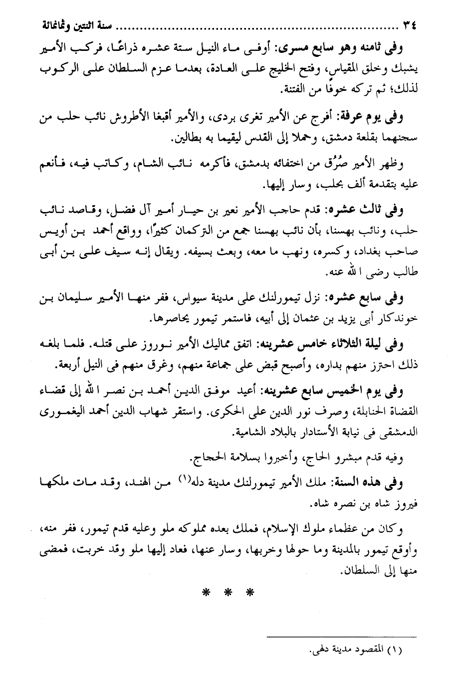 وَفِي ثامنه وَهُوَ سَابِع مسرى: أوفي مَاء النّيل سِتَّة عشره ذِرَاعا فَركب الْأَمِير يشبك وَخلق المقياس وَفتح الخليج على الْعَادة بَعْدَمَا عزم السُّلْطَان على الرّكُوب لذَلِك ثمَّ تَركه خوفًا من الْفِتْنَة. وَفِي يَوْم عَرَفَة: أفرج عَن الْأَمِير تغري بردى والأمير أقبغا الأطروش نَائِب حلب من سجنهما بقلعة دمشق وحملا إِلَى الْقُدس ليقيما بِهِ بطالين. وَظهر الْأَمِير صرق من اختفائه بِدِمَشْق فَأكْرمه نَائِب الشَّام وَكَاتب فِيهِ فأنعم عَلَيْهِ بتقدمة ألف بحلب وَسَار إِلَيْهَا. وَفِي ثَالِث عشره: قدم حَاجِب الْأَمِير نعير بن حيار أَمِير آل فضل وقاصد نَائِب حلب ونائب بهسنا بِأَن نَائِب بهسنا جمع من التركمان كثيرا وواقع أَحْمد بن أويس صَاحب بَغْدَاد وكسره وَنهب مَا مَعَه وَبعث بِسَيْفِهِ. وَيُقَال إِنَّه سيف عَليّ بن أبي طَالب رَضِي الله عَنهُ. وَفِي سَابِع عشره: نزل تيمورلنك على مَدِينَة سيواس ففر مِنْهَا الْأَمِير سُلَيْمَان بن خوندكار أبي يزِيد بن عُثْمَان إِلَى أَبِيه فاستمر تيمور يحاصرها. وَفِي لَيْلَة الثُّلَاثَاء خَامِس عشرينه: اتّفق مماليك الْأَمِير نوروز على قَتله. فَلَمَّا بلغه ذَلِك احْتَرز مِنْهُم بداره وَأصْبح قبض على جمَاعَة مِنْهُم وغرف مِنْهُم فِي النّيل أَرْبَعَة. وَفِي يَوْم الْخَمِيس سَابِع عشرينه: أُعِيد موفق الدّين أَحْمد بن نصر الله إِلَى قَضَاء الْقُضَاة الْحَنَابِلَة وَصرف نور الدّين عَليّ الحكري. وَاسْتقر شهَاب الدّين أَحْمد اليغموري الدِّمَشْقِي فِي نِيَابَة الأستادار بالبلاد الشامية. وَفِيه قدم مبشرو الْحَاج واخبروا بسلامة الْحجَّاج. وَفِي هَذِه السّنة: ملك الْأَمِير تيمورلنك مَدِينَة دله من الْهِنْد وَقد مَاتَ ملكهَا فَيْرُوز شاه بن نَصره شاه. وَكَانَ من عُظَمَاء مُلُوك الْإِسْلَام فَملك بعده مَمْلُوكه ملو وَعَلِيهِ قدم تيمور ففر مِنْهُ وأوقع تيمور بِالْمَدِينَةِ وَمَا حولهَا وخربها وَسَار عَنْهَا فَعَاد إِلَيْهَا ملو وَقد خربَتْ فمضي مِنْهَا إِلَى السُّلْطَان.