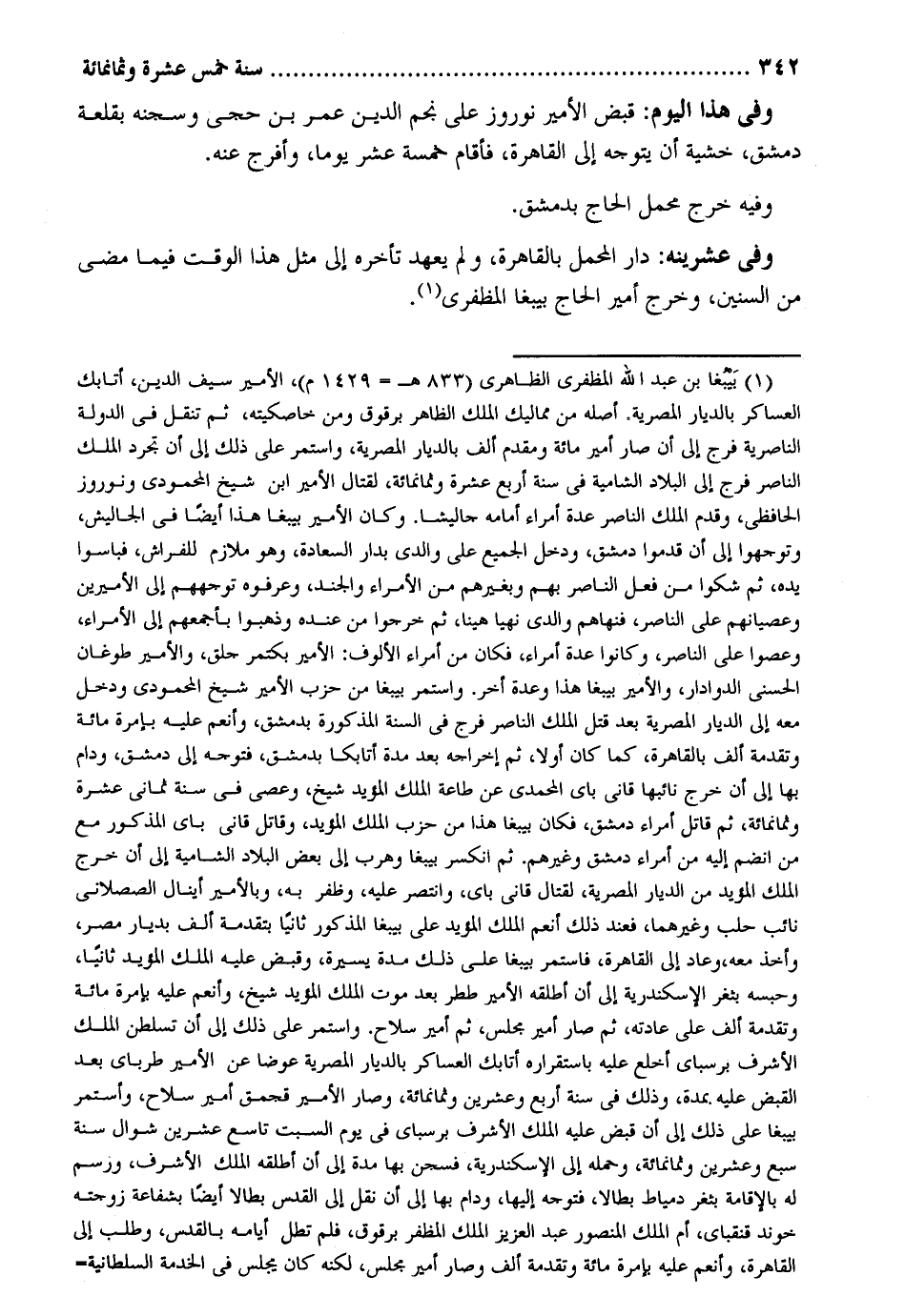 وَفِي هَذَا الْيَوْم: قبض الْأَمِير نوروز على نجم الدّين عمر بن حجي وسجنه بقلعة دمشق خشيَة أَن يتَوَجَّه إِلَى الْقَاهِرَة فَأَقَامَ خَمْسَة عشر يَوْمًا وَأَفْرج عَنهُ. وَفِيه خرج محمل الْحَاج بِدِمَشْق. وَفِي عشرينه: دَار الْمحمل بِالْقَاهِرَةِ وَلم يعْهَد تَأَخره إِلَى مثل هَذَا الْوَقْت فِيمَا مضى من السنين وَخرج أَمِير الْحَاج بيبغا المظفري.