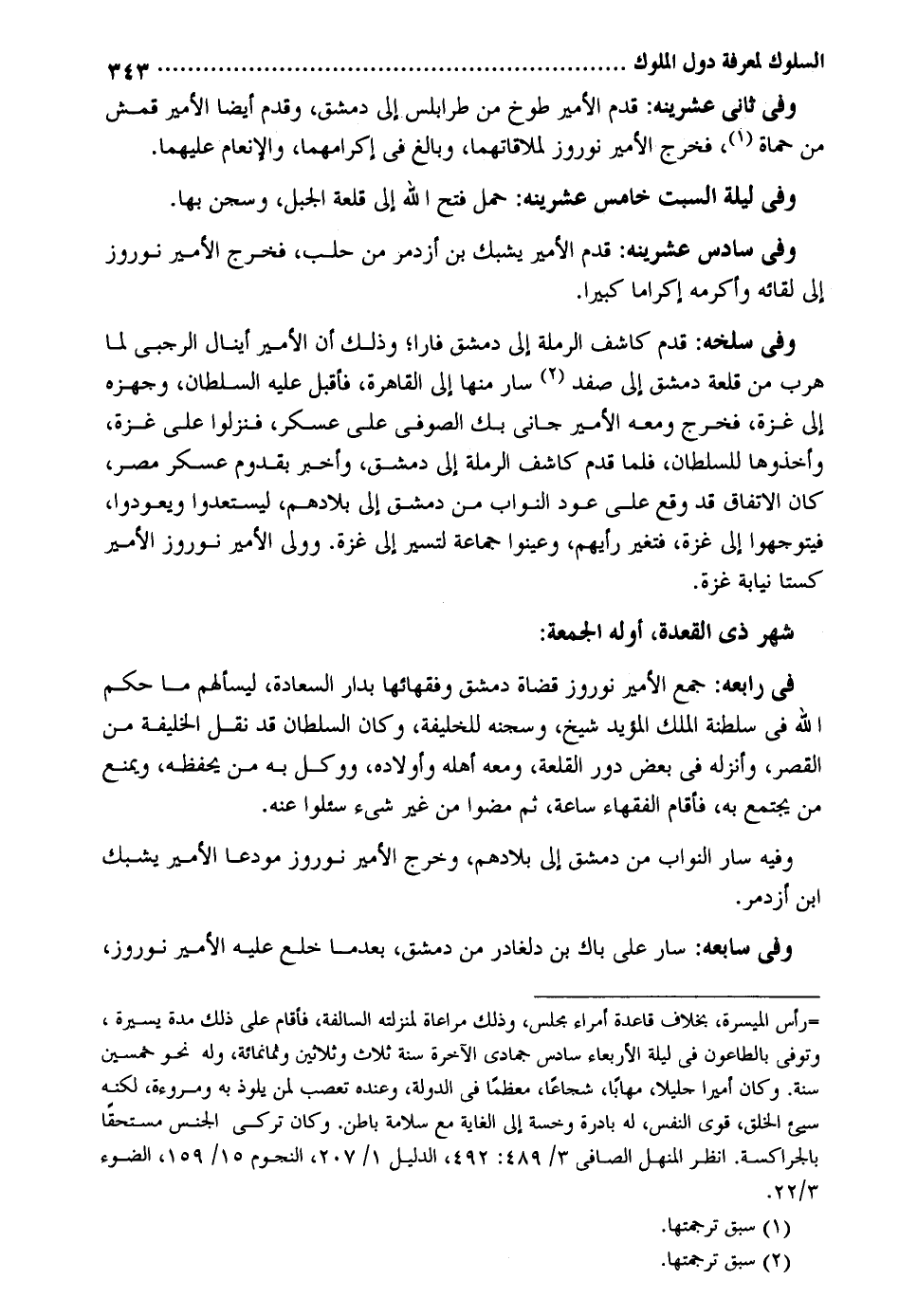 وَفِي ثَانِي عشرينه: قدم الْأَمِير طوخ من طرابلس إِلَى دمشق وَقدم أَيْضا الْأَمِير قمش من حماة فَخرج الْأَمِير نوروز لملاقاتهما وَبَالغ فِي إكرامهما والإنعام عَلَيْهِمَا. وَفِي لَيْلَة السبت خَامِس عشرينه: حمل فتح الله إِلَى قلعة الْجَبَل وسجن بهَا. وَفِي سادس عشرينه: قدم الْأَمِير يشبك بن أزدمر من حلب فَخرج الْأَمِير نوروز إِلَى لِقَائِه وأكرمه إِكْرَاما كَبِيرا. وَفِي سلخه: قدم كاشف الرملة إِلَى دمشق فَارًّا وَذَلِكَ أَن الْأَمِير أينال الرجبي لما هرب من قلعة دمشق إِلَى صفد سَار مِنْهَا إِلَى الْقَاهِرَة فَأقبل عَلَيْهِ السُّلْطَان وجهزه إِلَى غَزَّة فَخرج وَمَعَهُ الْأَمِير جاني بك الصُّوفِي على عَسْكَر فنزلوا على غَزَّة وأخذوها للسُّلْطَان فَلَمَّا قدم كاشف الرملة إِلَى دمشق وَأخْبر بقدوم عَسْكَر مصر كَانَ الِاتِّفَاق قد وَقع على عود النواب من دمشق إِلَى بِلَادهمْ ليستعدوا ويعودوا فيتوجهوا إِلَى غَزَّة فَتغير رَأْيهمْ وعينوا جمَاعَة لتسير إِلَى غَزَّة. وَولي الْأَمِير نوروز الْأَمِير كستا نِيَابَة غَزَّة. شهر ذِي الْقعدَة أَوله الْجُمُعَة: فِي رابعه: جمع الْأَمِير نوروز قُضَاة دمشق وفقهائها بدار السَّعَادَة ليسألهم مَا حكم الله فِي سلطنة الْملك الْمُؤَيد شيخ وسجنه للخليفة وَكَانَ السُّلْطَان قد نقل الْخَلِيفَة من الْقصر وأنزله فِي بعض دور القلعة وَمَعَهُ أَهله وَأَوْلَاده ووكل بِهِ من يحفظه وَيمْنَع من يجْتَمع بِهِ فَأَقَامَ الْفُقَهَاء سَاعَة ثمَّ مضوا من غير شَيْء سئلوا عَنهُ. وَفِيه سَار النواب من دمشق إِلَى بِلَادهمْ وَخرج الْأَمِير نوروز مودعاً الْأَمِير يشبك ابْن أزدمر. وَفِي سابعه: سَار على باك بن دلغادر من دمشق بَعْدَمَا خلع عَلَيْهِ الْأَمِير نوروز