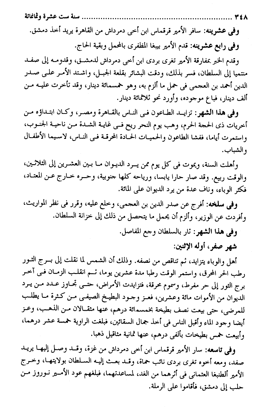 وَفِي عشرينه: سَافر الْأَمِير قرقماس ابْن أخي دمرداش من الْقَاهِرَة يُرِيد أَخذ دمشق. وَفِي رَابِع عشرينه: قدم الْأَمِير بيبغا المظفري بالمحمل وَبَقِيَّة الْحَاج. وَقدم الْخَبَر بمفارقة الْأَمِير تغري بردى ابْن أخي دمرداش لدمشق وقدومه إِلَى صفد منتمياً إِلَى السُّلْطَان فسر بذلك ودقت البشائر بقلعة الْجَبَل وَاشْتَدَّ الْأَمر على صدر الدّين أَحْمد بن العجمي فِي حمل مَا ألزم بِهِ وَهُوَ خَمْسمِائَة دِينَار وَقد تَأَخَّرت عَلَيْهِ من ألف دِينَار فَبَاعَ وَفِي هَذَا الشَّهْر: تزايد الطَّاعُون فِي النَّاس بِالْقَاهِرَةِ ومصر وَكَانَ ابتداؤه من أخريات ذِي الْحجَّة الْحرم وهب يَوْم النَّحْر ريح فِي غَايَة الشدَّة من نَاحيَة الْجنُوب واستمرت أَيَّامًا فَفَشَا الطَّاعُون والحميات الحادة المحرقة فِي النَّاس لاسيما الْأَطْفَال والشباب. وأهلت السّنة وَيَمُوت فِي كل يَوْم مِمَّن يرد الدِّيوَان مَا بَين الْعشْرين إِلَى الثَّلَاثِينَ وَالْوَقْت ربيع. وَقد صَار حاراً يَابسا ورياحه كلهَا جنوبية وحره خَارج عَن الْمُعْتَاد فَكثر الوباء وناف عدَّة من يرد الدِّيوَان على الْمِائَة. وَفِي سلخه: أفرج عَن صدر الدّين بن العجمي وخلع عَلَيْهِ وَقرر فِي نظر الْمَوَارِيث وأفردت عَن الْوَزير وألزم أَن يحمل مَا يتَحَصَّل من ذَلِك إِلَى خزانَة السُّلْطَان. وَفِي هَذَا الشَّهْر: ثار بالسلطان وجع المفاصل. شهر صفر أَوله الِاثْنَيْنِ: أهل والوباء يتزايد ثمَّ تناقص من نصفه. وَذَلِكَ أَن الشَّمْس لما نقلت إِلَى برج الثور رطب الْحر المحرق وَاسْتمرّ الْوَقْت رطبا مُدَّة عشْرين يَوْمًا ثمَّ انْقَلب الزَّمَان فِي آخر برج الثور إِلَى حر مفرط وعوم محرقة فتزايدت الْأَمْرَاض حَتَّى تجَاوز عدد من يرد الدِّيوَان من الْأَمْوَات مائَة وَعشْرين فعز وجود الْبِطِّيخ الصيفي من كَثْرَة مَا يطْلب للمرضى حَتَّى بِيعَتْ نصف بطيخة بِخَمْسِمِائَة دِرْهَم عَنْهَا مثقالان من الذَّهَب وَعز أَيْضا وجود المَاء وَأَقْبل النَّاس فِي أَخذ جمال السقائين فبلغت الراوية خَمْسَة عشر درهما وأبيعت خمس بطيخات بألفي دِرْهَم عَنْهَا ثَمَانِيَة مَثَاقِيل ذَهَبا. وَفِي تاسعه: سَار الْأَمِير قرقماس ابْن أخي دمرداش من غَزَّة وَقد وصل إِلَيْهَا يُرِيد صفد وَمَعَهُ أَخُوهُ تغري بردى نَائِب حماة وَقد بعث إِلَيْهِ السُّلْطَان بولايتها وَخرج الْأَمِير ألطنبغا العثماني فِي أثرهما من الْغَد لمساعدتهما فَبَلغهُمْ عود الْأَمِير نوروز من حلب إِلَى دمشق فأقاموا على الرملة.