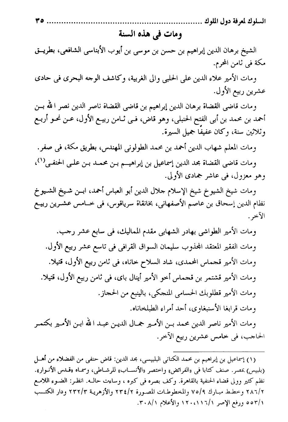 وَمَات فِي هَذِه السّنة الشَّيْخ برهَان الدّين إِبْرَاهِيم بن حسن بن موسي بن أَيُّوب الأبناسي الشَّافِعِي بطرِيق مَكَّة فِي ثامن الْمحرم. وَمَات الْأَمِير عَلَاء الدّين عَليّ الْحلَبِي وَالِي الغربية وَكَاشف الْوَجْه البحري فِي حادي عشْرين ربيع الأول. وَمَات قَاضِي الْقُضَاة برهَان الدّين إِبْرَاهِيم بن قَاضِي الْقُضَاة نَاصِر الدّين نصر الله بن أَحْمد بن مُحَمَّد بن أبي الْفَتْح الْحَنْبَلِيّ وَهُوَ قَاض فِي ثامن ربيع الأول عَن نَحْو أَربع وَثَلَاثِينَ سنة وَكَانَ عفيفاً جميل السِّيرَة. وَمَات الْمعلم شهَاب الدّين أَحْمد بن مُحَمَّد الطولوني المهندس بطرِيق مَكَّة فِي صفر. وَمَات قَاضِي الْقُضَاة مجد الدّين إِسْمَاعِيل بن إِبْرَاهِيم بن مُحَمَّد بن على الْحَنَفِيّ وَهُوَ مَعْزُول فِي عَاشر جُمَادَى الأولى. وَمَات شيخ الشُّيُوخ شيخ الْإِسْلَام جلال الدّين أَبُو الْعَبَّاس أَحْمد ابْن شيخ الشُّيُوخ نظام الدّين إِسْحَاق بن عَاصِم الْأَصْفَهَانِي بخانقاة سرياقوس فِي خَامِس عضرين ربيع الآخر. وَمَات الْأَمِير الطواشي بهادر الشهابي مقدم المماليك فِي سَابِع عشر رَجَب. وَمَات الْفَقِير المعتقد المجذوب سُلَيْمَان السواق الْقَرَافِيّ فِي تَاسِع عشر ربيع الأول. وَمَات الْأَمِير قشتمر بن قجماس أَخُو الْأَمِير أينال باي فِي ثامن ربيع الأول قَتِيلا. وَمَات الْأَمِير قطلوبك الحسامي المنجكي بالينبع من الْحجاز. وَمَات قرابغا الأسنبغاوي أحد أُمَرَاء الطبلخاناه. وَمَات الْأَمِير نَاصِر الدّين مُحَمَّد بن الْأَمِير جمال الدّين عبد الله ابْن الْأَمِير بكتمر الْحَاجِب فِي خَامِس عشْرين ربيع الآخر.