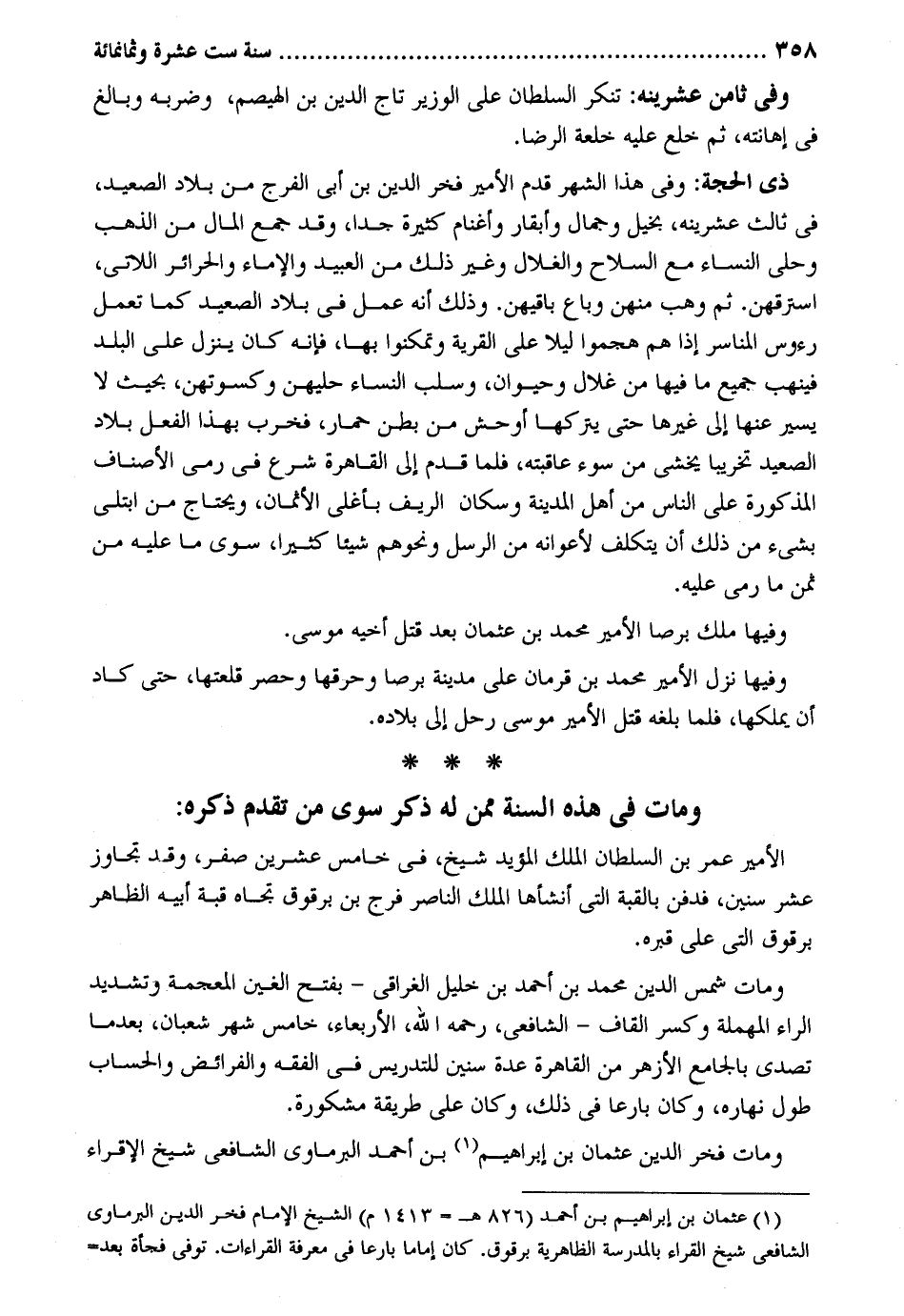 وَفِي ثامن عشرينه: تنكر السُّلْطَان على الْوَزير تَاج الدّين بن الهيصم وضربه وَبَالغ فِي إهانته ثمَّ ذِي الْحجَّة: وَفِي هَذَا الشَّهْر قدم الْأَمِير فَخر الدّين بن أبي الْفرج من بِلَاد الصَّعِيد فِي ثَالِث عشرينه بخيل وجمال وأبقار وأغنام كَثِيرَة جدا وَقد جمع المَال من الذَّهَب وحلي النِّسَاء مَعَ السِّلَاح والغلال وَغير ذَلِك من العبيد وَالْإِمَاء والحرائر اللَّاتِي استرقهن. ثمَّ وهب مِنْهُنَّ وَبَاعَ باقيهن. وَذَلِكَ أَنه عمل فِي بِلَاد الصَّعِيد كَمَا تعْمل رُءُوس المناسر إِذا هم هجموا لَيْلًا على الْقرْيَة وتمكنوا بهَا فَإِنَّهُ كَانَ ينزل على الْبَلَد فينهب جَمِيع مَا فِيهَا من غلال وحيوان وسلب النِّسَاء حليهن وكسوتهن بِحَيْثُ لَا يسير عَنْهَا إِلَى غَيرهَا حَتَّى يَتْرُكهَا أوحش من بطن حمَار فخرب بِهَذَا الْفِعْل بِلَاد الصَّعِيد تخريباً يخْشَى من سوء عاقبته فَلَمَّا قدم إِلَى الْقَاهِرَة شرع فِي رمي الْأَصْنَاف الْمَذْكُورَة على النَّاس من أهل الْمَدِينَة وسكان الرِّيف بأغلى الْأَثْمَان وَيحْتَاج من ابْتُلِيَ بِشَيْء من ذَلِك أَن يتَكَلَّف لأعوانه من الرُّسُل وَنَحْوهم شَيْئا كثيرا سوى مَا عَلَيْهِ من ثمن مَا رمى عَلَيْهِ. وفيهَا ملك برصا الْأَمِير مُحَمَّد بن عُثْمَان بعد قتل أَخِيه مُوسَى. وفيهَا نزل الْأَمِير مُحَمَّد بن قرمان على مَدِينَة برصا وحرقها وَحصر قلعتها حَتَّى كَاد أَن يملكهَا فَلَمَّا بلغه قتل الْأَمِير مُوسَى رَحل إِلَى بِلَاده. وَمَات فِي هَذِه السّنة الْأَمِير عمر بن السُّلْطَان الْملك الْمُؤَيد شيخ فِي خَامِس عشْرين صفر وَقد تجَاوز عشر سِنِين فَدفن بالقبة الَّتِي أَنْشَأَهَا الْملك النَّاصِر فرج بن برقوق تجاه قبَّة أَبِيه الظَّاهِر برقوق الَّتِي على قَبره. وَمَات شمس الدّين مُحَمَّد بن أَحْمد بن خَلِيل الغراقي - بِفَتْح الْغَيْن الْمُعْجَمَة وَتَشْديد الرَّاء الْمُهْملَة وَكسر الْقَاف - الشَّافِعِي رَحمَه الله الْأَرْبَعَاء خَامِس شهر شعْبَان بَعْدَمَا تصدى بالجامع الْأَزْهَر من الْقَاهِرَة عدَّة سِنِين للتدريس فِي الْفِقْه والفرائض والحساب طول نَهَاره وَكَانَ بارعاً فِي ذَلِك وَكَانَ على طَريقَة مشكورة. وَمَات فَخر الدّين عُثْمَان بن إِبْرَاهِيم بن أَحْمد الْبرمَاوِيّ الشَّافِعِي شيخ الإقراء