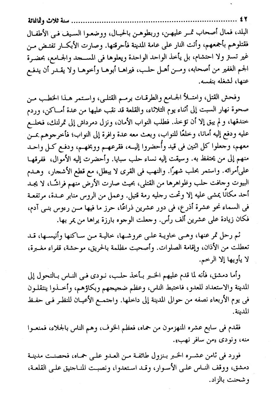 الْبَلَد فَمَال أَصْحَاب تمر عَلَيْهِنَّ وربطوهن بالحبال وَوَضَعُوا السَّيْف فِي الْأَطْفَال فَقَتَلُوهُمْ بأجمعهم وَأَتَتْ النَّار على عَامَّة الْمَدِينَة فأحرقتها. وَصَارَت الْأَبْكَار تفتض من غير تستر وَلَا احتشام بل يَأْخُذ الْوَاحِد الْوَاحِدَة ويعلوها فِي الْمَسْجِد وَالْجَامِع بِحَضْرَة الجم الْغَفِير من أَصْحَابه وَمن أهل حلب فيراها أَبوهَا وأخوها وَلَا يقدر أَن يدْفع عَنْهَا لشغله بِنَفسِهِ. وفحش الْقَتْل وامتلأ الْجَامِع والطرقات برمم الْقَتْلَى وَاسْتمرّ هَذَا الْخطب من صحوة نَهَار السبت إِلَى أثْنَاء يَوْم الثُّلَاثَاء والقلعة قد نقب عَلَيْهَا من عدَّة أَمَاكِن وردم خندقها وَلم يبْق إِلَّا أَن تُؤْخَذ. فَطلب النواب الْأمان وَنزل دمرداش إِلَى تمرلنك فَخلع عَلَيْهِ وَدفع إِلَيْهِ أَمَانًا وخلعاً للنواب وَبعث مَعَه عدَّة وافرة إِلَى النواب فأخرجوهم. مِمَّن مَعَهم وَجعلُوا كل اثْنَيْنِ فِي قيد وأحضروا إِلَيْهِ فقرعهم ووبخهم وَدفع كل وَاحِد مِنْهُم إِلَى من يحْتَفظ بِهِ. وسيقت إِلَيْهِ نسَاء حلب سَبَايَا. وأحضرت إِلَيْهِ الْأَمْوَال ففرقها على أمرائه. وَاسْتمرّ بحلب شهرا. والنهب فِي الْقرى لَا يبطل مَعَ قطع الْأَشْجَار وَهدم الْبيُوت وجافت حلب وظواهرها من الْقَتْلَى بِحَيْثُ صَارَت الأَرْض مِنْهُم فراشا لَا يجد أحد مَكَانا يمشي عَلَيْهِ إِلَّا وَتَحْت رجلَيْهِ رمة قَتِيل. وَعمل من الروس مَنَابِر عدَّة مُرْتَفعَة فِي السَّمَاء نَحْو عشرَة أَذْرع فِي دور عشْرين ذِرَاعا حرز مَا فِيهَا من رُءُوس بني آدم فَكَانَ زِيَادَة على عشْرين ألف رَأس. وَجعلت الْوُجُوه بارزة يَرَاهَا من يمر بهَا. ثمَّ رَحل تمر عَنْهَا وَهِي خاوية على عروشها خَالِيَة من ساكنها وأنيسها قد تعطلت من الْأَذَان وَإِقَامَة الصَّلَوَات. وأصبحت مظْلمَة بالحريق موحشة قفراء مغبرة لَا يَأْوِيهَا إِلَّا الرخم. وَأما دمشق فَأَنَّهُ لما قدم عَلَيْهِم الْخَبَر بِأخذ حلب نُودي فِي النَّاس بالتحول إِلَى الْمَدِينَة والاستعداد لِلْعَدو فاختبط النَّاس وَعظم ضجيجهم وبكاؤهم وَأخذُوا ينتقلون فِي يَوْم الْأَرْبَعَاء نصفه من حوالي الْمَدِينَة إِلَى داخلها. وَاجْتمعَ الْأَعْيَان للنَّظَر فِي حفظ الْمَدِينَة. فَقدم فِي سَابِع عشره المنهزمون من حماه فَعظم الْخَوْف وهم النَّاس بالجلاء فمنعوا مِنْهُ وَنُودِيَ من سَافر نهب. فورد فِي ثامن عشره الْخَبَر بنزول طَائِفَة من الْعَدو على حماه فحصنت مَدِينَة دمشق ووقف النَّاس على الأسوار وَقد اسْتَعدوا ونصبت المناجنيق على القلعة وشحنت بالزاد.