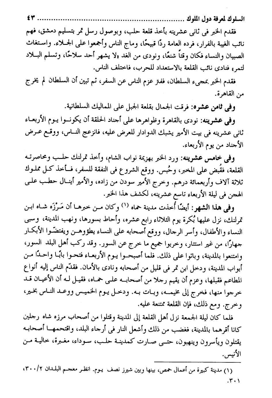 فَقدم الْخَبَر فِي ثَانِي عشرينه بِأخذ قلعة حلب وبوصول رسل تمر بِتَسْلِيم دمشق فهم نَائِب الْغَيْبَة بالفرار فَرده الْعَامَّة ردا قبيحاً وماج النَّاس وَأَجْمعُوا على الْجلاء. واستغاث الصّبيان وَالنِّسَاء فَكَانَ وقتا شنعاً وَنُودِيَ من الْغَد لَا يشهر أحد سِلَاحا وتسلم الْبِلَاد لتمر فَنَادَى نَائِب القلعة بالاستعداد للحرب فَاخْتلف النَّاس. فَقدم الْخَبَر بمجيء السُّلْطَان ففتر عزم النَّاس عَن السّفر ثمَّ تبين أَن السُّلْطَان لم يخرج من الْقَاهِرَة. وَفِي ثامن عشره: فرقت الْجمال بقلعة الْجَبَل على المماليك السُّلْطَانِيَّة. وَفِي عشرينه: نُودي بِالْقَاهِرَةِ وظواهرها على أجناد الْحلقَة أَن يَكُونُوا يَوْم الْأَرْبَعَاء ثَانِي عشرينه فِي بَيت الْأَمِير يشبك الدوادار للعرض عَلَيْهِ فانزعج النَّاس وَوَقع عرض الأجناد من يَوْم الْأَرْبَعَاء. وَفِي خَامِس عشرينه: ورد الْخَبَر بهزيمة نواب الشَّام وَأخذ تمرلنك حلب ومحاصرته القلعة فَقبض على الْمخبر وَحبس. وَوَقع الشُّرُوع فِي النَّفَقَة للسَّفر فَأخذ كل مَمْلُوك ثَلَاثَة آلَاف وَأَرْبَعمِائَة دِرْهَم. وَخرج الْأَمِير سودن من زَاده والأمير أينال حطب على الهجن فِي لَيْلَة الْأَرْبَعَاء تَاسِع عشرينه لكشف هَذَا الْخَبَر. وَفِي هَذَا الشَّهْر: أَيْضا أخذت مَدِينَة حماه وَكَانَ من خَبَرهَا أَن مرزه شاه ابْن تمرلنك نزل عَلَيْهَا بكرَة يَوْم الثُّلَاثَاء رَابِع عشره وأحاط بسورها وَنهب الْمَدِينَة وَسبي النِّسَاء والأطفال وَأسر الرِّجَال وَوَقع أَصْحَابه على النِّسَاء يطؤوهن ويفتضوا الْأَبْكَار جهاراً من غير استتار وخربوا جَمِيع مَا خرج عَن السُّور. وَقد ركب أهل الْبَلَد السُّور وامتنعوا بِالْمَدِينَةِ وَبَاتُوا على ذَلِك. فَلَمَّا أَصْبحُوا يَوْم الْأَرْبَعَاء فتحُوا بَابا وَاحِدًا من أَبْوَاب الْمَدِينَة وَدخل ابْن تمر فِي قَلِيل من أَصْحَابه ونادي بالأمان. فَقدم النَّاس إِلَيْهِ أَنْوَاع المطاعم فقبلها وعزم أَن يُقيم رجلا من أَصْحَابه على حماه فَقيل لَهُ أَن الْأَعْيَان قد خَرجُوا مِنْهَا فَخرج إِلَى مخيمه وَبَات بِهِ. وَدخل يَوْم الْخَمِيس ووعد النَّاس بِخَير وَخرج. وَمَعَ ذَلِك فَإِن القلعة ممتنعة عَلَيْهِ. فَلَمَّا كَانَ لَيْلَة الْجُمُعَة نزل أهل القلعة إِلَى الْمَدِينَة وَقتلُوا من أَصْحَاب مرزه شاه رجلَيْنِ كَانَا أقرهما بِالْمَدِينَةِ فَغَضب من ذَلِك وأشعل النَّار فِي أرجاء الْبَلَد واقتحمها أَصْحَابه يقتلُون وَيَأْسِرُونَ وينهبون حَتَّى صَارَت كمدينة حلب سَوْدَاء مغبرة خَالِيَة من الأنيس.