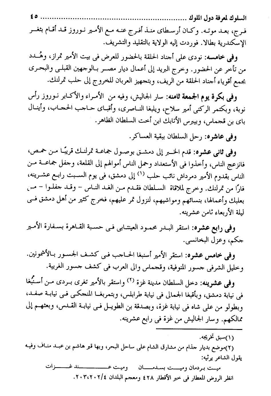 فرج بعد مَوته. وَكَانَ أرسطاي مُنْذُ أفرج عَنهُ مَعَ الْأَمِير نوروز قد أَقَامَ بثغر الْإسْكَنْدَريَّة بطالاً. فوردت إِلَيْهِ الْولَايَة بالتقليد والتشريف. وَفِي خامسه: نُودي على أجناد الْحلقَة بالحضور للعرض فِي بَيت الْأَمِير تمراز وهدد من تَأَخّر عَن الْحُضُور. وَخرج الْبَرِيد إِلَى أَعمال ديار مصر بِالْوَجْهَيْنِ القبلي والبحري بِجمع أقوياء أجناد الْحلقَة من الرِّيف وبتجهيز العربان لِلْخُرُوجِ إِلَى حلب تمرلنك. وَفِي بكرَة يَوْم الْجُمُعَة ثامنه: سَار الجاليش وَفِيه من الْأُمَرَاء والأكابر نوروز رَأس نوبَة وبكتمر الركني أَمِير سلَاح ويلبغا الناصري وأقباي حَاجِب الْحجاب وأينال باي بن قجماس وبيبرس الأتابك ابْن أُخْت السُّلْطَان الظَّاهِر. وَفِي عاشره: رَحل السُّلْطَان بِبَقِيَّة العساكر. وَفِي ثَانِي عشره: قدم الْخَبَر إِلَى دمشق بوصول جمَاعَة تمرلنك قَرِيبا من حمص فأنزعج النَّاس وَأخذُوا فِي الاستعداد وَحمل النَّاس أَمْوَالهم إِلَى القلعة وجفل جمَاعَة من النَّاس بقدوم الْأَمِير دمرداش نَائِب حلب إِلَى دمشق فِي يَوْم السبت رَابِع عشرينه فَارًّا من تمرلنك. وَخرج لملاقاة السُّلْطَان فَقدم من الْغَد النَّاس - وَقد جفلوا - من بعلبك وأعمالها بنسائهم ومواشيهم لنزول تمر عَلَيْهِم فَخرج كثير من أهل دمشق فِي لَيْلَة الْأَرْبَعَاء ثامن عشرينه. وَفِي رَابِع عشره: اسْتَقر الْبَدْر مَحْمُود العينتابي فِي حسبَة الْقَاهِرَة بسفارة الْأَمِير جكم وعزل البخانسي. وَفِي خَامِس عشره: اسْتَقر الْأَمِير أسنبغا الْحَاجِب فِي كشف الجسور بالأشمونين. وخليل الشرفي جسور المنوفية وقجماس وَالِي الْعَرَب فِي كشف جسور الغربية. وَفِي عشرينه: دخل السُّلْطَان مَدِينَة غَزَّة وَاسْتقر بالأمير تغري بردى من أسنبغا فِي نِيَابَة دمشق وبأقبغا الجمالي فِي نِيَابَة طرابلس وبتمربغا المنجكي فِي نِيَابَة صفد وبطولو من عَليّ شاه فِي نِيَابَة غَزَّة وبصدقة بن الطَّوِيل فِي نِيَابَة الْقُدس وبعثهم إِلَى ممالكهم. وَسَار الجاليش من غَزَّة فِي رَابِع عشرينه.