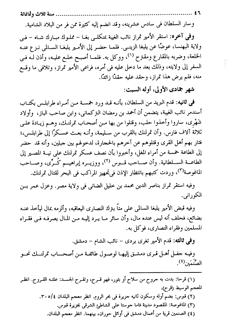 وَسَار السُّلْطَان فِي سادس عشرينه وَقد انْضَمَّ إِلَيْهِ كَثِيرَة مِمَّن فر من الْبِلَاد الشامية. وَفِي آخِره: اسْتَقر الْأَمِير تمراز نَائِب الْغَيْبَة بمنكلي بغا - مَمْلُوك مبارك شاه - فِي ولَايَة البهنسا عوضا عَن يلبغا الزيني. فَلَمَّا حضر إِلَى الْأَمِير يلبغا السالمي نزع عَنهُ الخلعة وضربه بالمقارع ومقترح ووكل بِهِ. فَلَمَّا أصبح خلع عَلَيْهِ وَأذن لَهُ فِي السّفر إِلَى ولَايَته وَذَلِكَ بعد مَا دخل عَلَيْهِ فِي أمره فراعى الْأَمِير تمراز وتلافي مَا وَقع مِنْهُ فَلم يرض هَذَا تمراز وحقد عَلَيْهِ حقداً زَائِدا. شهر جُمَادَى الأول أَوله السبت: فِي ثَانِيه: قدم الْبَرِيد من السُّلْطَان بِأَنَّهُ قد ورد خَمْسَة من أُمَرَاء طرابلس بِكِتَاب أسندمر نَائِب الْغَيْبَة يتَضَمَّن أَن أَحْمد بن رَمَضَان التركماني وَابْن صَاحب الباز وَأَوْلَاد شَهْري سَارُوا وَأخذُوا حلب وَقتلُوا من بهَا من أَصْحَاب تمرلنك وهم زِيَادَة على ثَلَاثَة آلَاف فَارس. وَأَن تمرلنك بِالْقربِ من سليمَة وَأَنه بعث عسكراً إِلَى طرابلس فثار بهم أهل الْقرى وقتلوهم عَن أخرهم بِالْحِجَارَةِ لدخولهم بَين جبلين وَأَنه قد حضر إِلَى الطَّاعَة خَمْسَة من أُمَرَاء الْمغل وأخبروا بِأَن نصف عَسْكَر تمرلنك على نِيَّة الْمصير إِلَى الطَّاعَة السُّلْطَانِيَّة. وَأَن صَاحب قبرس ووزيره إِبْرَاهِيم كرى وَصَاحب الماغوصة وَردت كتبهمْ بانتظار الْإِذْن فِي تجهيز المراكب فِي الْبَحْر لقِتَال تمرلنك. وَفِيه اسْتَقر تمراز بناصر الدّين مُحَمَّد بن خَلِيل الضاني فِي ولَايَة مصر. وعزل عمر بن الكوراني. وَفِيه قبض الْأَمِير يلبغا السالمي على متا بترك النَّصَارَى ليعاقبه وألزمه بِمَال ليَأْخُذ عَنهُ بضائع فَحلف أَنه لَيْسَ عِنْده مَال وَأَن سَائِر مَا يرد إِلَيْهِ من المَال يصرفهُ فِي فُقَرَاء الْمُسلمين وفقراء النَّصَارَى فَوكل بِهِ. وَفِي ثالثه: قدم الْأَمِير تغري بردى - نَائِب الشَّام - دمشق. وَفِيه جفل أهل قرى دمشق إِلَيْهَا لوصول طَائِفَة من أَصْحَاب تمرلنك نَحْو الصنمين.