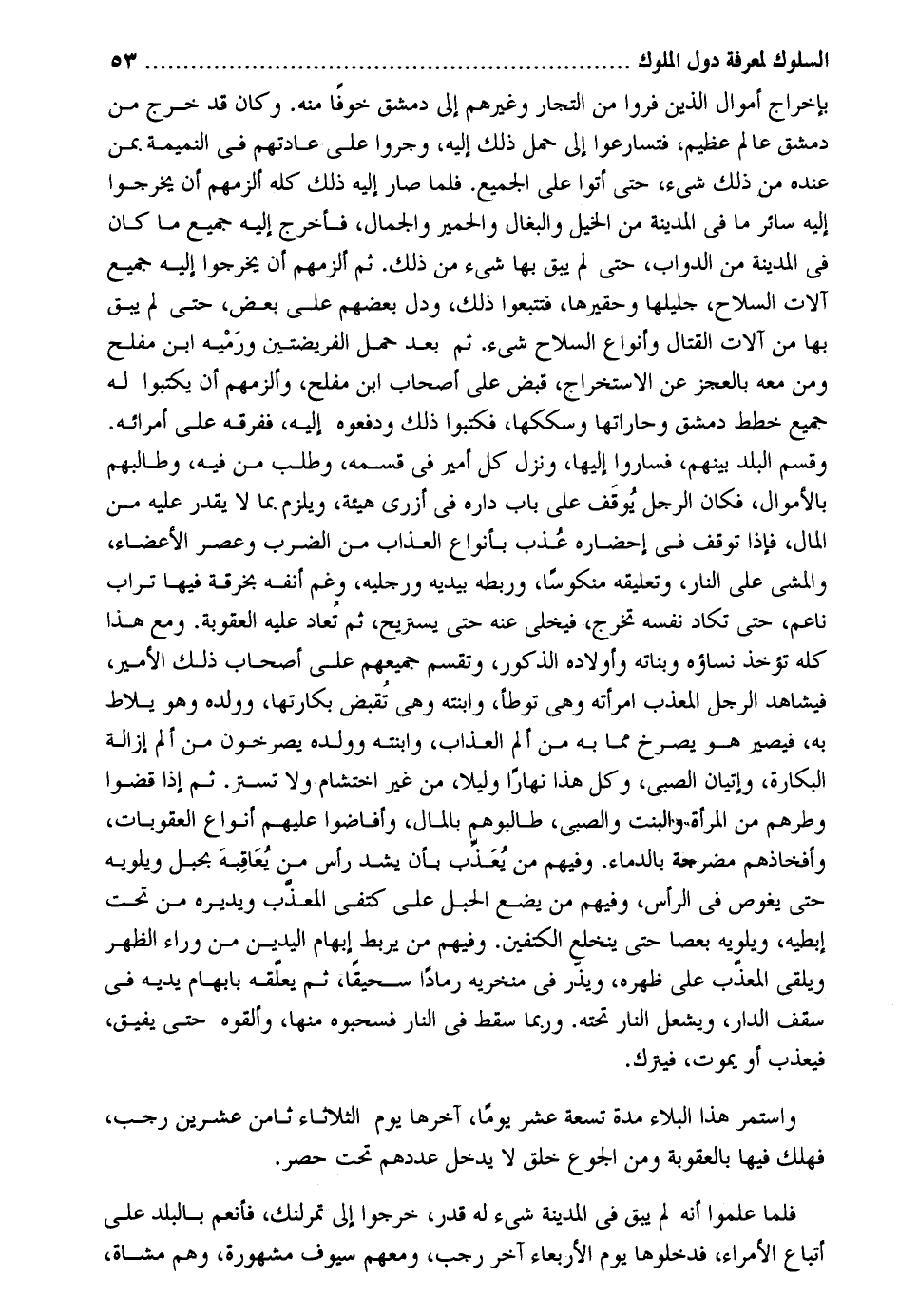 بِإِخْرَاج أَمْوَال الَّذين فروا من التُّجَّار وَغَيرهم إِلَى دمشق خوفًا مِنْهُ. وَكَانَ قد خرج من دمشق عَالم عَظِيم فتسارعوا إِلَى حمل ذَلِك إِلَيْهِ وجروا على عَادَتهم فِي النميمة بِمن عِنْده من ذَلِك شَيْء حَتَّى أَتَوا على الْجَمِيع. فَلَمَّا صَار إِلَيْهِ ذَلِك كُله ألزمهم أَن يخرجُوا إِلَيْهِ سَائِر مَا فِي الْمَدِينَة من الْخَيل وَالْبِغَال وَالْحمير وَالْجمال فَاخْرُج إِلَيْهِ جَمِيع مَا كَانَ فِي الْمَدِينَة من الدَّوَابّ حَتَّى لم يبْق بهَا شَيْء من ذَلِك. ثمَّ ألزمهم أَن يخرجُوا إِلَيْهِ جَمِيع آلَات السِّلَاح جليلها وحقيرها فتتبعوا ذَلِك وَدلّ بَعضهم على بعض حَتَّى لم يبْق بهَا من آلَات الْقِتَال وأنواع السِّلَاح شَيْء. ثمَّ بعد حمل الفريضتين ورميه ابْن مُفْلِح وَمن مَعَه بِالْعَجزِ عَن الاستخراج قبض على أَصْحَاب ابْن مُفْلِح وألزمهم أَن يكتبوا لَهُ جَمِيع خطط دمشق وحاراتها وسككها فَكَتَبُوا ذَلِك ودفعوه إِلَيْهِ ففرقه على أمرائه. وَقسم الْبَلَد بَينهم فَسَارُوا إِلَيْهَا وَنزل كل أَمِير فِي قسمه وَطلب من فِيهِ وطالبهم بالأموال فَكَانَ الرجل يُوقف على بَاب دَاره فِي أزرى هَيْئَة وَيلْزم بِمَا لَا يقدر عَلَيْهِ من المَال فَإِذا توقف فِي إِحْضَاره عذب بأنواع الْعَذَاب من الضَّرْب وعصر الْأَعْضَاء وَالْمَشْي على النَّار وتعليقه منكوشاً وربطه بيدَيْهِ وَرجلَيْهِ وغم أَنفه بِخرقَة فِيهَا تُرَاب ناعم حَتَّى تكَاد نَفسه تخرج فيخلى عَنهُ حَتَّى يستريح ثمَّ تُعَاد عَلَيْهِ الْعقُوبَة. وَمَعَ هَذَا كُله تُؤْخَذ نساوه وَبنَاته وَأَوْلَاده الذُّكُور وتقسم جَمِيعهم على أَصْحَاب ذَلِك الْأَمِير فيشاهد الرجل المعذب امْرَأَته وَهِي تُوطأ وَابْنَته وَهِي تقبض بَكَارَتهَا وَولده وَهُوَ يلاط بِهِ فَيصير هُوَ يصْرخ مِمَّا بِهِ من ألم الْعَذَاب وَابْنَته وَولده يصرخون من ألم إِزَالَة الْبكارَة وإتيان الصَّبِي وكل هَذَا نَهَارا وليلاً من غير احتشام وَلَا تستر. ثمَّ إِذا قضوا وطرهم من الْمَرْأَة وَالْبِنْت وَالصَّبِيّ طالبوهم بِالْمَالِ وأفاضوا عَلَيْهِم أَنْوَاع الْعُقُوبَات وأفخاذهم مضرجة بالدماء. وَفِيهِمْ من يعذب بِأَن يشد رَأس من يُعَاقِبهُ بِحَبل ويلويه حَتَّى يغوص فِي الرَّأْس وَفِيهِمْ من يضع الْحَبل على كَتِفي المعذب ويديره من تَحت إبطه ويلويه بعصا حَتَّى ينخلع الْكَتِفَيْنِ. وَفِيهِمْ من يرْبط إِبْهَام الْيَدَيْنِ من وَرَاء الظّهْر ويلقي المعذب على ظَهره ويذر فِي مَنْخرَيْهِ رَمَادا سحيقاً ثمَّ يعلقه بإبهام يَدَيْهِ فِي سقف الدَّار ويشعل النَّار تَحْتَهُ. وَرُبمَا سقط فِي النَّار فسحبوه مِنْهَا وألقوه حَتَّى يفِيق فيعذب أَو يَمُوت فَيتْرك. وَاسْتمرّ هَذَا الْبلَاء مُدَّة تِسْعَة عشر يَوْمًا آخرهَا يَوْم الثُّلَاثَاء ثامن عشْرين رَجَب فَهَلَك فِيهَا بالعقوبة وَمن الْجُوع خلق لَا يدْخل عَددهمْ تَحت حصر. فَلَمَّا علمُوا أَنه لم يبْق فِي الْمَدِينَة شَيْء لَهُ قدر خَرجُوا إِلَى تمرلنك فأنعم بِالْبَلَدِ على أَتبَاع الْأُمَرَاء فَدَخَلُوهَا يَوْم الْأَرْبَعَاء آخر رحب وَمَعَهُمْ سيوف مَشْهُورَة وهم مشَاة