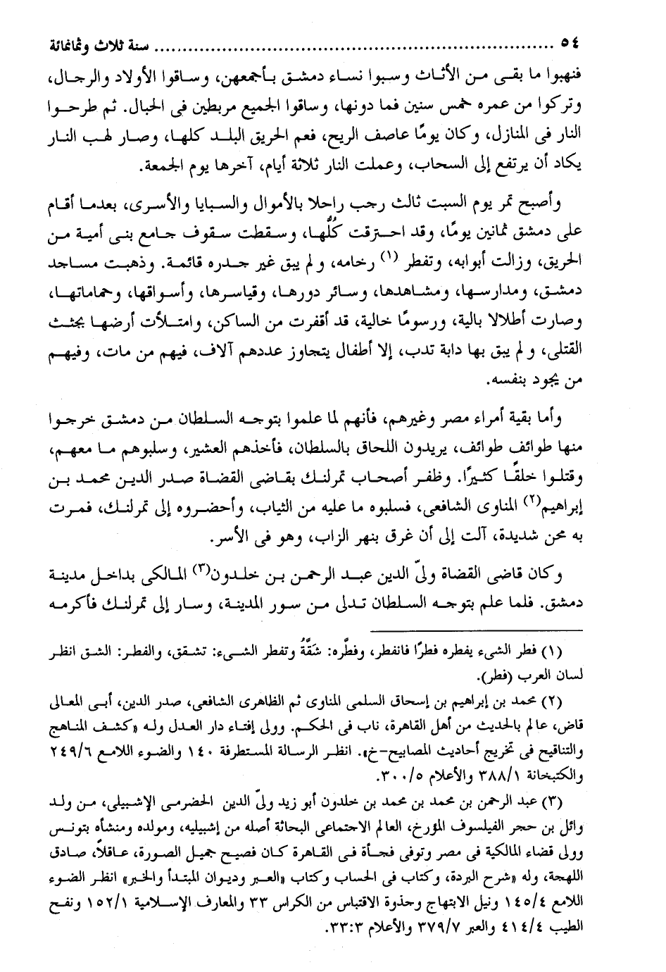 فنهبوا مَا بَقِي من الأثاث وَسبوا نسَاء دمشق بأجمعهن وَسَاقُوا الْأَوْلَاد وَالرِّجَال وَتركُوا من عمره خمس سِنِين فَمَا دونهَا وَسَاقُوا الْجَمِيع مربطين فِي الحبال. ثمَّ طرحوا النَّار فِي الْمنَازل وَكَانَ يَوْمًا عاصف الرّيح فَعم الْحَرِيق الْبَلَد كلهَا وَصَارَ لَهب النَّار يكَاد أَن يرْتَفع إِلَى السَّحَاب وعملت النَّار ثَلَاثَة أَيَّام آخرهَا يَوْم الْجُمُعَة. وَأصْبح تمر يَوْم السبت ثَالِث رَجَب راحلاً بالأموال والسبايا والأسري بَعْدَمَا أَقَامَ على دمشق ثَمَانِينَ يَوْمًا وَقد احترقت كلهَا وَسَقَطت سقوف جَامع بني أُميَّة من الْحَرِيق وزالت أبوابه وتفطر رخامه وَلم يبْق غير جدره قَائِمَة. وَذَهَبت مَسَاجِد دمشق ومدارسها ومشاهدها وَسَائِر دورها وقياسرها وأسواقها وحماماتها وَصَارَت أطلالاً بالية ورسوماً خَالِيَة قد أقفرت من السَّاكِن وامتلأت أرْضهَا بجثث الْقَتْلَى وَلم يبْق بهَا دَابَّة تدب إِلَّا أَطْفَال يتَجَاوَز عَددهمْ آلَاف فيهم من مَاتَ وَفِيهِمْ من يجود بِنَفسِهِ. وَأما بَقِيَّة أُمَرَاء مصر وَغَيرهم فَإِنَّهُم لما علمُوا بتوجه السُّلْطَان من دمشق خَرجُوا مِنْهَا طوائف طوائف يُرِيدُونَ اللحاق بالسلطان فَأَخذهُم العشير وسلبوهم مَا مَعَهم وَقتلُوا خلقا كثيرا. وظفر أَصْحَاب تمرلنك بقاضي الْقُضَاة صدر الدّين مُحَمَّد بن إِبْرَاهِيم الْمَنَاوِيّ الشَّافِعِي فسلبوه مَا عَلَيْهِ من الثِّيَاب وأحضروه إِلَى تمرلنك فمرت بِهِ محن شَدِيدَة آلت إِلَى أَن غرق بنهر الزاب وَهُوَ فِي الْأسر. وَكَانَ قَاضِي الْقُضَاة ولى الدّين عبد الرَّحْمَن بن خلدون الْمَالِكِي بداخل مَدِينَة دمشق. فَلَمَّا علم بتوجه السُّلْطَان تدلى من سور الْمَدِينَة وَسَار إِلَى تمرلنك فَأكْرمه