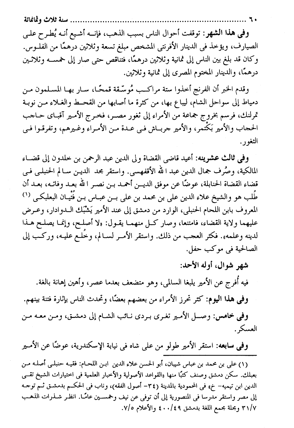 وَفِي هَذَا الشَّهْر: توقفت أَحْوَال النَّاس بِسَبَب الذَّهَب فَإِنَّهُ أشيع أَنه يطْرَح على الصيارف وَيُؤْخَذ فِي الدِّينَار الأفرنتي المشخص مبلغ تِسْعَة وَثَلَاثِينَ درهما من الْفُلُوس. وَكَانَ قد بلغ بَين النَّاس إِلَى ثَمَانِيَة وَثَلَاثِينَ درهما فتناقص حَتَّى صَار إِلَى خمسه وَثَلَاثِينَ درهما وَالدِّينَار الْمَخْتُوم الْمصْرِيّ إِلَى ثَمَانِيَة وَثَلَاثِينَ. وَقدم الْخَبَر أَن الفرنج أخذُوا سِتَّة مراكب موسقة قمحاً سَار بهَا الْمُسلمُونَ من دمياط إِلَى سواحل الشَّام ليباع بهَا من كَثْرَة مَا أَصَابَهَا من الْقَحْط والغلاء من نوبَة تمرلنك فرسم بِخُرُوج جمَاعَة من الْأُمَرَاء إِلَى ثغور مصر فَخرج الْأَمِير آقباي حَاجِب الْحجاب والأمير بكتمر والأمير جرباش فِي عدَّة من الْأُمَرَاء وَغَيرهم وَتَفَرَّقُوا فِي الثغور. وَفِي ثَالِث عشرينه: أُعِيد قَاضِي الْقُضَاة ولي الدّين عبد الرَّحْمَن بن خلدون إِلَى قَضَاء الْمَالِكِيَّة وصوف جمال الدّين عبد الله الأقفهسي. وَاسْتقر مجد الدّين سَالم الْحَنْبَلِيّ فِي قَضَاء الْقُضَاة الْحَنَابِلَة عوضا عَن موفق الدّين أَحْمد بن نصر الله بعد وَفَاته بعد أَن طلب هُوَ وَالشَّيْخ عَلَاء الدّين عَليّ بن مُحَمَّد بن عَليّ بن عَبَّاس بن فتيَان البعلبكي الْمَعْرُوف بِابْن اللحام الْحَنْبَلِيّ الْوَارِد من دمشق إِلَى عِنْد الْأَمِير يشبك الدوادار وَعرض عَلَيْهِمَا ولَايَة الْقَضَاء فامتنعا وَصَارَ كل مِنْهُمَا يَقُول: لَا أصلح وَإِنَّمَا يصلح هَذَا لدينِهِ وَعلمه. فَكثر الْعجب من ذَلِك. وَاسْتقر الْأَمر لسالم وخلع عَلَيْهِ وَركب إِلَى الصالحية فِي موكب حمل. شهر شَوَّال أَوله الْأَحَد: فِيهِ أفرج عَن الْأَمِير يلبغا السالمي وَهُوَ متضعف بَعْدَمَا عصر وأهين إهانة بَالِغَة. وَفِي هَذَا الْيَوْم: كثر تحرز الْأُمَرَاء من بَعضهم بَعْضًا وتحدث النَّاس بإثارة فتْنَة بَينهم. وَفِي خَامِس: وصل الْأَمِير تغري بردى نَائِب الشَّام إِلَى دمشق وَمن مَعَه من الْعَسْكَر. وَفِي سابعه: اسْتَقر الْأَمِير طولو من على شاه فِي نِيَابَة الْإسْكَنْدَريَّة عوضا عَن الْأَمِير