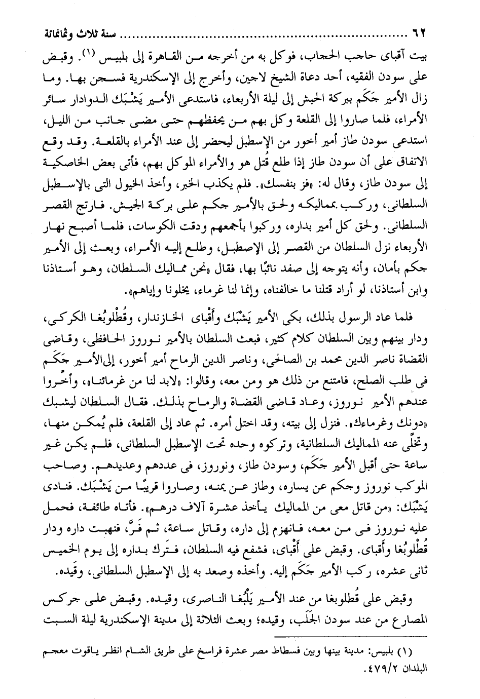 بَيت آقباي حَاجِب الْحجاب فَوكل بِهِ من أخرجه من الْقَاهِرَة إِلَى بلبيس وَقبض على سودن الْفَقِيه أحد دعاة الشَّيْخ لاجين وَأخرج إِلَى الْإسْكَنْدَريَّة فسجن بهَا. وَمَا زَالَ الْأَمِير جكم ببركة الْحَبَش إِلَى لَيْلَة الْأَرْبَعَاء فاستدعي الْأَمِير يشبك الدوادار سَائِر الْأُمَرَاء فَلَمَّا صَارُوا إِلَى القلعة وكل بهم من يحفظهم حَتَّى مضى جَانب من اللَّيْل استدعى سودن طاز أَمِير أخور من الإسطبل ليحضر إِلَى عِنْد الْأُمَرَاء بالقلعة. وَقد وَقع الِاتِّفَاق على أَن سودن طاز إِذا طلع قتل هُوَ والأمراء الْمُوكل بهم فَأتى بعض الخاصكية إِلَى سودن طاز وَقَالَ لَهُ: فز بِنَفْسِك. فَلم يكذب الْخَبَر وَأخذ الْخُيُول الَّتِي بالإسطبل السلطاني وَركب بمماليكه وَلحق بالأمير جكم على بركَة الْجَيْش. فارتج الْقصر السلطاني. وَلحق كل أَمِير بداره وركبوا بأجمعهم ودقت الكوسات فَلَمَّا أصبح نَهَار الْأَرْبَعَاء نزل السُّلْطَان من الْقصر إِلَى الإصطبل وطلع إِلَيْهِ الْأُمَرَاء وَبعث إِلَى الْأَمِير جكم بِأَمَان وَأَنه يتَوَجَّه إِلَى صفد نَائِبا بهَا فَقَالَ: نَحن مماليك السُّلْطَان وَهُوَ أستاذنا وَابْن أستاذنا لَو أَرَادَ قتلنَا مَا خالفناه وَإِنَّمَا لنا غُرَمَاء يخلونا وإياهم. فَلَمَّا عَاد الرَّسُول بذلك بكي الْأَمِير يشبك وأقباي الخازندار وقطلوبغا الكركي وَدَار بَينهم وَبَين السُّلْطَان كَلَام كثير فَبعث السُّلْطَان بالأمير نوروز الحافظي وقاضي الْقُضَاة نَاصِر الدّين مُحَمَّد بن الصَّالِحِي وناصر الدّين الرماح أَمِير أخور إِلَى الْأَمِير جكم فِي طلب الصُّلْح فَامْتنعَ من ذَلِك هُوَ وَمن مَعَه وَقَالُوا: لابد لنا من غرمائنا وأخروا عِنْدهم الْأَمِير نوروز وَعَاد قَاضِي الْقُضَاة والرماح بذلك. فَقَالَ السُّلْطَان ليشبك دُونك وغرماءك. فَنزل إِلَى بَيته وَقد اخْتَلَّ أمره. ثمَّ عَاد إِلَى القلعة فَلم يُمكن مِنْهَا وتخفي عَنهُ المماليك السُّلْطَانِيَّة وتركوه وَحده تَحت الإسطبل السلطاني فَلم يكن غير سَاعَة حَتَّى أقبل الْأَمِير جكم وسودن طاز ونوروز فِي عَددهمْ وعديدهم. وَصَاحب الموكب نوروز وجكم عَن يسَاره وطاز عَن يمنه وصاروا قَرِيبا من يشبك. فنادي يشبك: من قَاتل معي من المماليك يَأْخُذ عشرَة آلَاف دِرْهَم. فَأَتَاهُ طَائِفَة فَحمل عَلَيْهِ نوروز فِي من مَعَه فَانْهَزَمَ إِلَى دَاره وَقَاتل سَاعَة ثمَّ فر فنهبت دَاره وَدَار قطلوبغا وأقباي. وَقبض على أقباي فشفع فِيهِ السُّلْطَان فَترك بداره إِلَى يَوْم الْخَمِيس ثَانِي عشره ركب الْأَمِير جكم إِلَيْهِ. وَأَخذه وَصعد بِهِ إِلَى الإسطبل السلطاني وَقَيده. وَقبض على قطلوبغا من عِنْد الْأَمِير يلبغا الناصري وَقَيده. وَقبض على جركس المصارع من عِنْد سودن الجلب وَقَيده وَبعث الثَّلَاثَة إِلَى مَدِينَة الْإسْكَنْدَريَّة لَيْلَة السبت