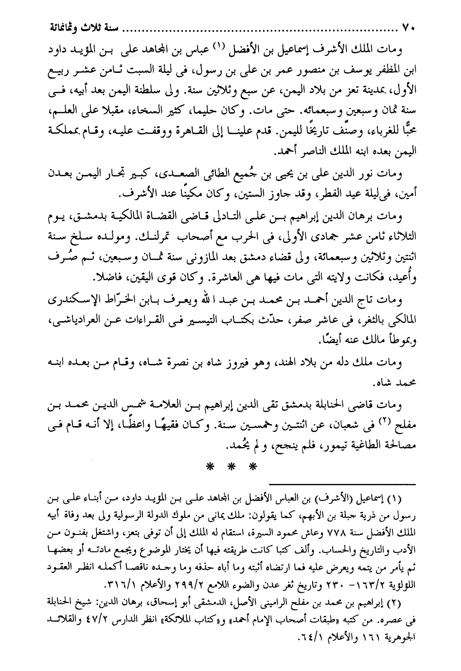 وَمَات الْملك الْأَشْرَف إِسْمَاعِيل بن الْأَفْضَل عَبَّاس بن الْمُجَاهِد عَليّ بن الْمُؤَيد دَاوُد ابْن المظفر يُوسُف بن مَنْصُور عمر بن على بن رَسُول فِي لَيْلَة السبت ثامن عشر ربيع الأول بِمَدِينَة تعز من بِلَاد الْيمن عَن سبع وَثَلَاثِينَ سنة. ولى سلطنة الْيمن بعد أَبِيه فِي سنة ثَمَان وَسبعين وَسَبْعمائة. حَتَّى مَاتَ. وَكَانَ حَلِيمًا كثير السخاء مُقبلا على الْعلم محباً للغرباء وصنف تَارِيخا لليمن. قدم علينا إِلَى الْقَاهِرَة ووقفت عَلَيْهِ وَقَامَ بمملكة الْيمن بعده ابْنه الْملك النَّاصِر أَحْمد. وَمَات نور الدّين على بن يحيى بن جَمِيع الطَّائِي الصعدي كَبِير تجار الْيمن بِعَدَد أَمِين فِي لَيْلَة عيد الْفطر وَقد جاور السِّتين وَكَانَ مكيناً عِنْد الْأَشْرَف. وَمَات برهَان الدّين إِبْرَاهِيم بن على التادلي قَاضِي الْقُضَاة الْمَالِكِيَّة بِدِمَشْق يَوْم الثُّلَاثَاء ثامن عشر جُمَادَى الأولى فِي الْحَرْب مَعَ أَصْحَاب تمرلنك. ومولده سلخ سنة اثْنَتَيْنِ وَثَلَاثِينَ وَسَبْعمائة ولي قَضَاء دمشق بعد المازوني سنة ثَمَان وَسبعين ثمَّ صرف وأعيد فَكَانَت ولَايَته الَّتِي مَاتَ فِيهَا هِيَ الْعَاشِرَة. وَكَانَ قوي الْيَقِين فَاضلا. وَمَات تَاج الدّين أَحْمد بن مُحَمَّد بن عبد الله وَيعرف بِابْن الْخَرَّاط الإسكندري الْمَالِكِي بالثغر فِي عَاشر صفر حدث بِكِتَاب التَّيْسِير فِي الْقرَاءَات عَن العرادياشي وبموطأ مَالك عَنهُ أَيْضا. وَمَات ملك دله من بِلَاد الْهِنْد وَهُوَ فَيْرُوز شاه بن نصْرَة شاه وَقَامَ من بعده ابْنه مُحَمَّد شاه هـ وَمَات قَاضِي الْحَنَابِلَة بِدِمَشْق تَقِيّ الدّين إِبْرَاهِيم بن الْعَلامَة شمس الدّين مُحَمَّد بن مُفْلِح فِي شعْبَان عَن اثْنَتَيْنِ وَخمسين سنة. وَكَانَ فَقِيها واعظاً إِلَّا أَنه قَامَ فِي مصالحة الطاغية تيمور فَلم ينجح وَلم يحمد.