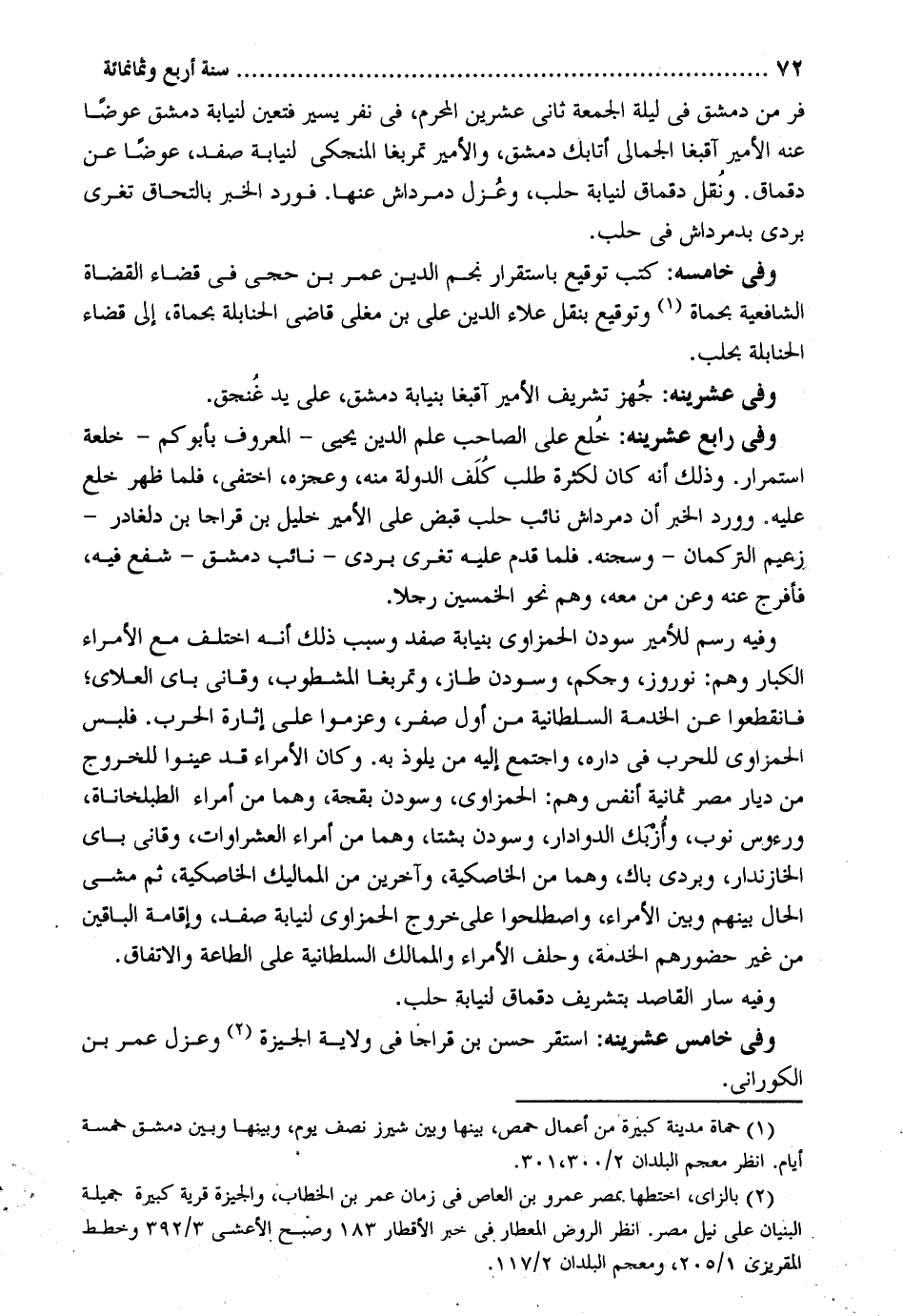 فر من دمشق فِي لَيْلَة الْجُمُعَة ثَانِي عشْرين الْمحرم فِي نفر يسير فَتعين لنيابة دمشق عوضا عَنهُ الْأَمِير أقبغا الجمالي أتابك دمشق والأمير تمربغا المنجكي لنيابة صفد عوضا عَن دقماق. وَنقل دقماق لنيابة حلب وعزل دمرداش عَنْهَا. فورد الْخَبَر بالتحاق تغري بردى بدمرداش فِي حلب. وَفِي خامسه: كتب توقيع باستمرار نجم الدّين عمر بن حجي فِي قَضَاء الْقُضَاة الشَّافِعِيَّة بحماة وتوقيع بِنَقْل عَلَاء الدّين عَليّ بن مغلي قَاضِي الْحَنَابِلَة بحماة إِلَى قَضَاء الْحَنَابِلَة بحلب. وَفِي عشرينه: جهز تشريف الْأَمِير آقبغا بنيابة دمشق على يَد غنجق. وَفِي رَابِع عشرينه: خلع على الصاحب علم الدّين يحيى - الْمَعْرُوف بأبو كم - خلعة اسْتِمْرَار. وَذَلِكَ أَنه كَانَ لِكَثْرَة طلب كلف الدولة مِنْهُ وعجزه اختفي فَلَمَّا ظهر خلع عَلَيْهِ. وَورد الْخَبَر أَن دمرداش نَائِب حلب قبض على الْأَمِير خَلِيل بن قراحا بن دلغادر - زعيم التركمان - وسجنه. فَلَمَّا قدم عَلَيْهِ تغري بردى - نَائِب دمشق - شفع فِيهِ فافرج عَنهُ وَعَن من مَعَه وهم نَحْو الْخمسين رجلا. وَفِيه رسم للأمير سودن الحمزاوي بنيابة صفد وَسبب ذَلِك أَنه اخْتلف مَعَ الْأُمَرَاء الْكِبَار وهم: نوروز وَحكم وسودن طاز وتمربغا المشطوب وقاني باي العلاي فانقطعوا عَن الْخدمَة السُّلْطَانِيَّة من أول صفر وعزموا على إثارة الْحَرْب. فَلبس الحمزاوي للحرب فِي دَاره وَاجْتمعَ إِلَيْهِ من يلوذ بِهِ. وَكَانَ الْأُمَرَاء قد عينوا لِلْخُرُوجِ من ديار مصر ثَمَانِيَة أنفس وهم: الحمزاوي وسردن بقجة وهما من أُمَرَاء الطبلخاناة ورءوس نوب وأزبك الدوادار وسودن بشتا وهما من أُمَرَاء العشراوات وقاني باي الخازندار وبردى باك وهما من الخاصكية وَآخَرين من المماليك الخاصكية ثمَّ مَشى الْحَال بَينهم وَبَين الْأُمَرَاء واصطلحوا على خُرُوج الحمزاوي لنيابة صفد وَإِقَامَة البَاقِينَ من غير حضورهم الْخدمَة وَحلف الْأُمَرَاء والممالك السُّلْطَانِيَّة على الطَّاعَة والاتفاق. وَفِيه سَار القاصد بتشريف دقماق لنيابة حلب. وَفِي خَامِس عشرينه: اسْتَقر حسن بن قراجا فِي ولَايَة الجيزة وعزل عمر بن الكوراني.