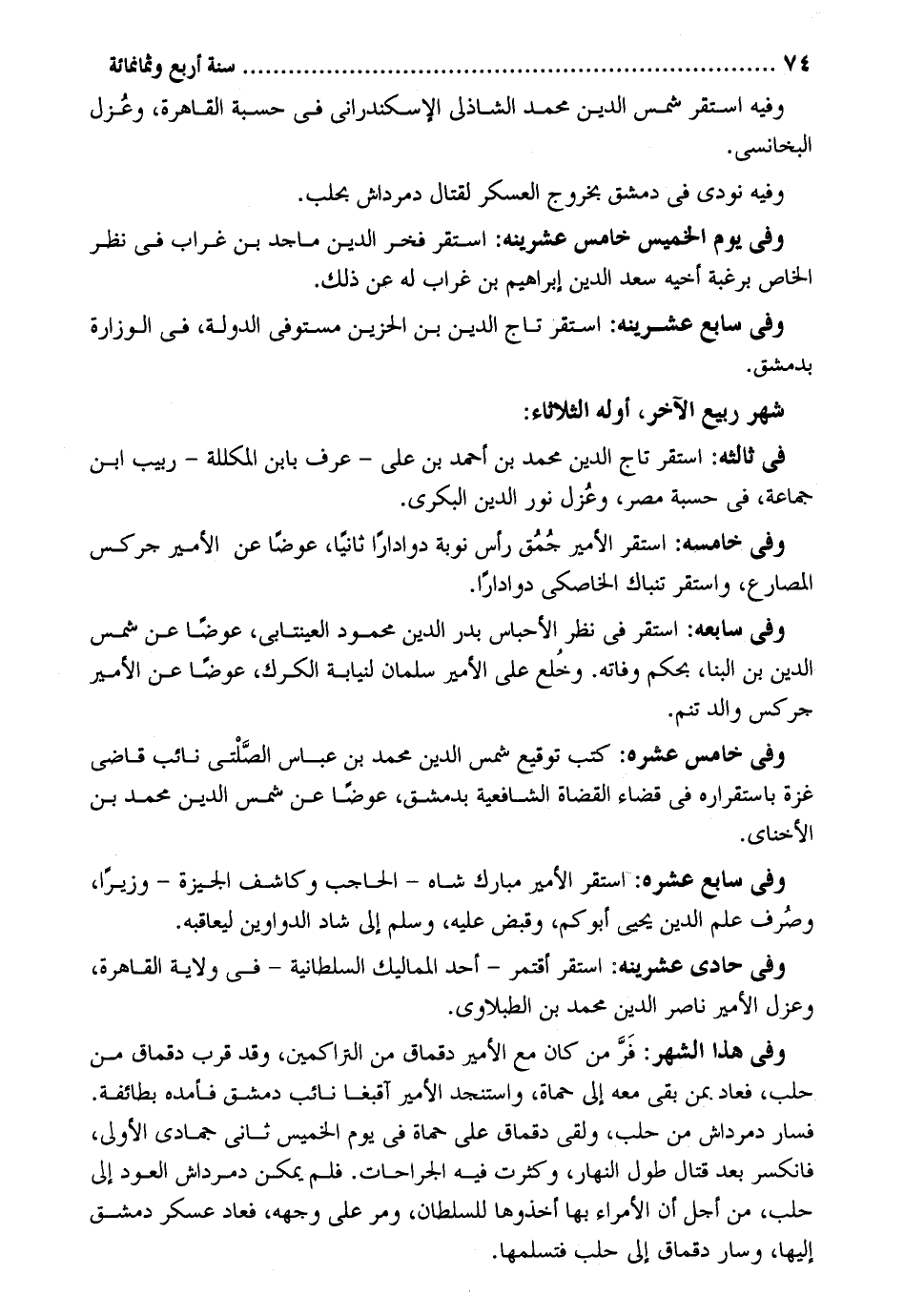 وَفِيه اسْتَقر شمس الدّين مُحَمَّد الشاذلي الإسْكَنْدراني فِي حسبَة الْقَاهِرَة وعزل البخانسي. وَفِيه نُودي فِي دمشق بِخُرُوج الْعَسْكَر لقِتَال دمرداش بحلب. وَفِي يَوْم الْخَمِيس خَامِس عشرينه: اسْتَقر فَخر الدّين ماجد بن غراب فِي نظر الْخَاص برغبة أَخِيه سعد الدّين إِبْرَاهِيم بن غراب لَهُ عَن ذَلِك. وَفِي سَابِع عشرينه: اسْتَقر تَاج الدّين بن الحزين مُسْتَوْفِي الدولة فِي الوزارة بِدِمَشْق. شهر ربيع الآخر أَوله الثُّلَاثَاء: فِي ثالثه: اسْتَقر تَاج الدّين مُحَمَّد بن أَحْمد بن عَليّ - عرف بِابْن المكللة - ربيب ابْن جمَاعَة فِي حسبَة مصر وعزل نور الدّين الْبكْرِيّ. وَفِي خامسه: اسْتَقر الْأَمِير جمق رَأس نوبَة دواداراً ثَانِيًا عوضا عَن الْأَمِير جركس المصارع وَاسْتقر تنباك الخاصكي دواداراً. وَفِي سابعه: اسْتَقر فِي نظر الأحباس بدر الدّين مَحْمُود العينتابي عوضا عَن شمس الدّين بن الْبَنَّا بِحكم وَفَاته. وخلع على الْأَمِير سلمَان لنيابة الكرك عوضا عَن الْأَمِير جركس وَالِد تنم. وَفِي خَامِس عشره: كتب توقيع شمس الدّين مُحَمَّد بن عَبَّاس الصلتي نَائِب قَاضِي غَزَّة باستقراره فِي قَضَاء الْقُضَاة الشَّافِعِيَّة بِدِمَشْق عوضا عَن شمس الدّين مُحَمَّد بن الأخناي. وَفِي سَابِع عشره: اسْتَقر الْأَمِير مبارك شاه - الْحَاجِب وَكَاشف الجيزة - وزيراً وَصرف علم الدّين يحمي أبوكم وَقبض عَلَيْهِ وَسلم إِلَى شاد الدَّوَاوِين ليعاقبه. وَفِي حادي عشرينه: اسْتَقر أقتمر - أحد المماليك السُّلْطَانِيَّة - فِي ولَايَة الْقَاهِرَة وعزل الْأَمِير نَاصِر الدّين مُحَمَّد بن الطلاوي. وَفِي هَذَا الشَّهْر: فر من كَانَ مَعَ الْأَمِير دقماق من التراكمين وَقد قرب دقماق من حلب فَعَاد بِمن بَقِي مَعَه إِلَى حماة واستنجد الْأَمِير آقبغا نَائِب دمشق فأمده بطَائفَة. فَسَار دمرداش من حلب وَلَقي دقماق على حماة فِي يَوْم الْخَمِيس ثَانِي جُمَادَى الأولى فانكسر بعد قتال طول النَّهَار وَكَثُرت فِيهِ الْجِرَاحَات. فَلم يُمكن دمرداش الْعود إِلَى حلب من أجل أَن الْأُمَرَاء بهَا أخذوها للسُّلْطَان وَمر على وَجهه فَعَاد عَسْكَر دمشق إِلَيْهَا وَسَار دقماق إِلَى حلب فتسلمها.