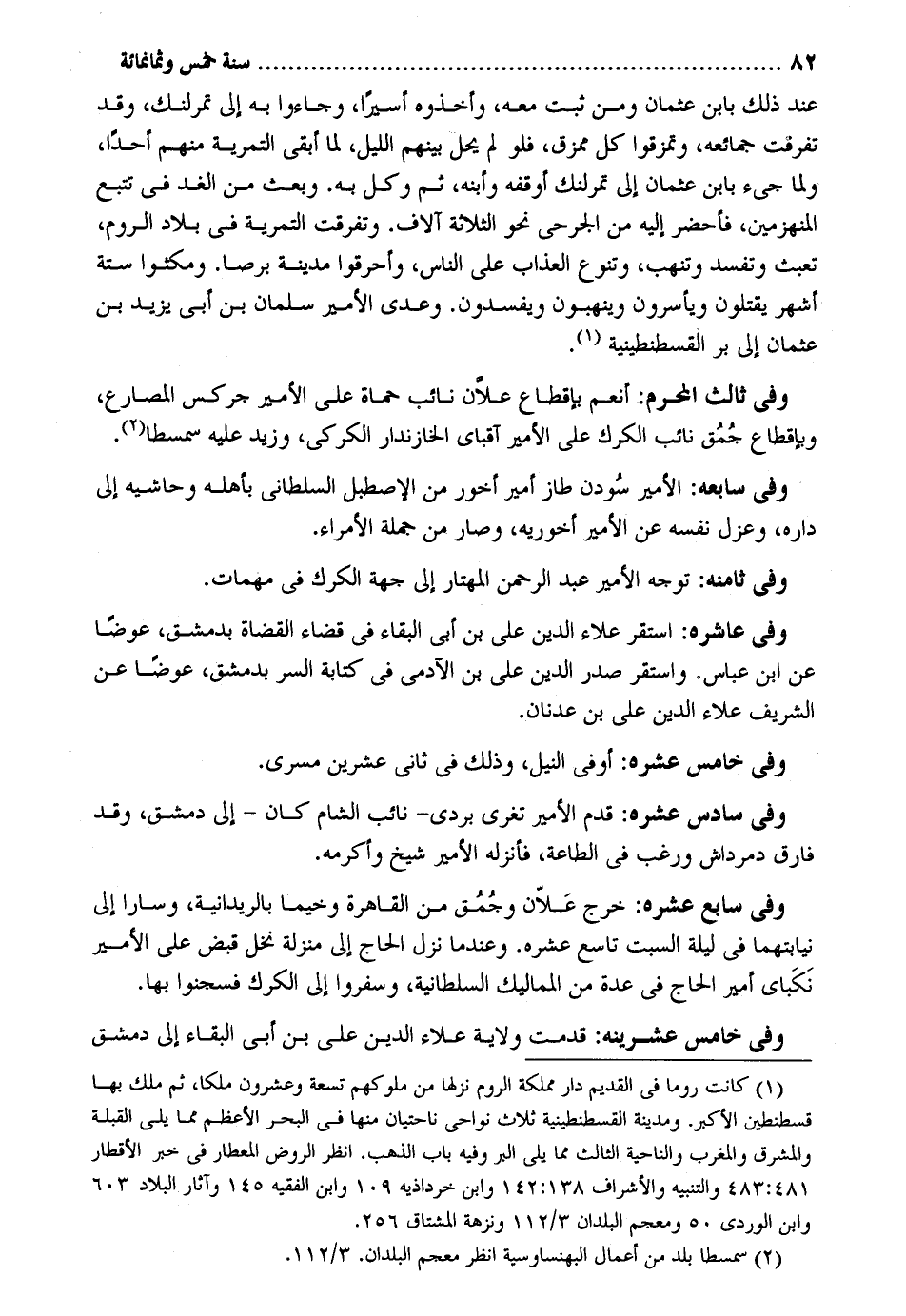 عِنْد ذَلِك بِابْن عُثْمَان وَمن ثَبت مَعَه وأخذوه أسراً وَجَاءُوا بِهِ إِلَى تمرلنك وَقد تَفَرَّقت جمائعه وتمزقوا كل ممزق فَلَو لم يحل بَينهم اللَّيْل لما أُبْقِي التمرية مِنْهُم أحدا وَلما جِيءَ بِابْن عُثْمَان إِلَى تمرلنك أوقفهُ وأبنه ثمَّ وكل بِهِ. وَبعث من الْغَد فِي تتبع المنهزمين فأحضر إِلَيْهِ من الْجَرْحى نَحْو الثَّلَاثَة آلَاف. وَتَفَرَّقَتْ التمرية فِي بِلَاد الرّوم تعبث وتفسد وتنهب وتنوع الْعَذَاب على النَّاس وأحرقوا مَدِينَة برصا. ومكثوا سِتَّة أشهر يقتلُون وَيَأْسِرُونَ وينهبون ويفسدون. وعدى الْأَمِير سلمَان بن أبي يزِيد بن عُثْمَان إِلَى بر الْقُسْطَنْطِينِيَّة. وَفِي ثَالِث الْمحرم: أنعم لإقطاع عَلان نَائِب حماة على الْأَمِير جركس المصارع وبإقطاع جمق نَائِب الكرك على الْأَمِير آقباي الخازندار الكركي وَزيد عَلَيْهِ سمسطا. وَفِي سابعه: الْأَمِير سودن طاز أَمِير أخور من الإصطبل السلطاني بأَهْله وحاشيه إِلَى دَاره وعزل نَفسه عَن الْأَمِير أخوريه وَصَارَ من جملَة الْأُمَرَاء. وَفِي ثامنه: توجه الْأَمِير عبد الرَّحْمَن المهتار إِلَى جِهَة الكرك فِي مهمات. وَفِي عاشره: اسْتَقر عَلَاء الدّين على بن أبي الْبَقَاء فِي قَضَاء الْقُضَاة بِدِمَشْق عوضا عَن ابْن عَبَّاس وَاسْتقر صدر الدّين على بن الْآدَمِيّ فِي كِتَابَة السِّرّ بِدِمَشْق عوضا عَن الشريف عَلَاء الدّين عَليّ بن عدنان. وَفِي خَامِس عشره: أوفي النّيل وَذَلِكَ فِي ثَانِي عشْرين مسرى. وَفِي سادس عشره: قدم الْأَمِير تغري بردى - نَائِب الشَّام كَانَ - إِلَى دمشق وَقد فَارق دمرداش وَرغب فِي الطَّاعَة فأنزله الْأَمِير شيخ وأكرمه. وَفِي سَابِع عشره: خرج عَلان وجمق من الْقَاهِرَة وخيما بالريدانية وسارا إِلَى نيابتهما فِي لَيْلَة السبت تَاسِع عشره. وعندما نزل الْحَاج إِلَى منزلَة نخل قبض على الْأَمِير نكباي أَمِير الْحَاج فِي عدَّة من المماليك السُّلْطَانِيَّة وسفروا إِلَى الكرك فسجنوا بهَا. وَفِي خَامِس عشرينه: قدمت ولَايَة عَلَاء الدّين عَليّ بن أبي الْبَقَاء إِلَى دمشق