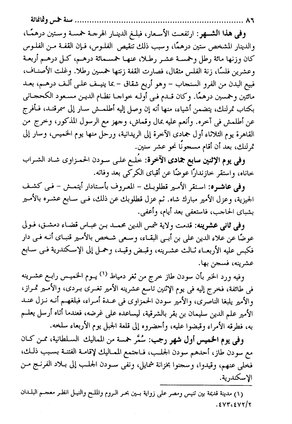 وَفِي هَذَا الشَّهْر: ارْتَفَعت الأسعار فَبلغ الدِّينَار الهرجة خَمْسَة وَسِتِّينَ درهما وَالدِّينَار المشخص سِتِّينَ درهما وَسبب ذَلِك تنقيص الْفُلُوس فَإِن القفة من الْفُلُوس كَانَ وَزنهَا مائَة رَطْل وَخَمْسَة عشر رطلا عَنْهَا خَمْسمِائَة دِرْهَم كل دِرْهَم أَرْبَعَة وَعشْرين فلسًا رنة الْفلس مِثْقَال فَصَارَت القفة زنتها خمسين رطلا. وغلت الْأَصْنَاف فَبيع الْبدن من الفرو السنجاب - وَهُوَ أَربع شقَاق - بِمَا ينيف على ألف دِرْهَم بعد مِائَتَيْنِ وَخمسين درهما. وَكَانَ قدم فِي أَوله خواجا نظام الدّين مَسْعُود الكحجاني بِكِتَاب تمرلنك يتَضَمَّن أَشْيَاء مِنْهَا أَنه إِن وصل إِلَيْهِ أطلمش سَار إِلَى سَمَرْقَنْد فأفرج عَن أطلمش فِي آخِره. وأنعم عَلَيْهِ بِمَال وقماش وجهز مَعَ الرَّسُول الْمَذْكُور وَخرج من الْقَاهِرَة يَوْم الثُّلَاثَاء أول جُمَادَى الْآخِرَة إِلَى الريدانية ورحل مِنْهَا يَوْم الْخَمِيس وَسَار إِلَى تمرلنك بعد أَن أَقَامَ مسجوناً نَحْو عشر سِنِين. وَفِي يَوْم الِاثْنَيْنِ سَابِع جُمَادَى الْآخِرَة: خلع على سودن الحمزاوي شاد الشَّرَاب خاناه وَاسْتقر خازنداراً عوضا عَن أقباي الكركي بعد وَفَاته. وَفِي عاشره: اسْتَقر الْأَمِير قطلوبك - الْمَعْرُوف بأستادار أيتمش - فِي كشف الجيزية وعزل الْأَمِير (سقط صفحة 68 و 78 مبارك شاه. ثمَّ عزل قطلوبك عَن ذَلِك فِي سَابِع عشره بالأمير بشباي ... . . وَفِيه خلع على الْقُضَاة الْأَرْبَع خلع الِاسْتِمْرَار)