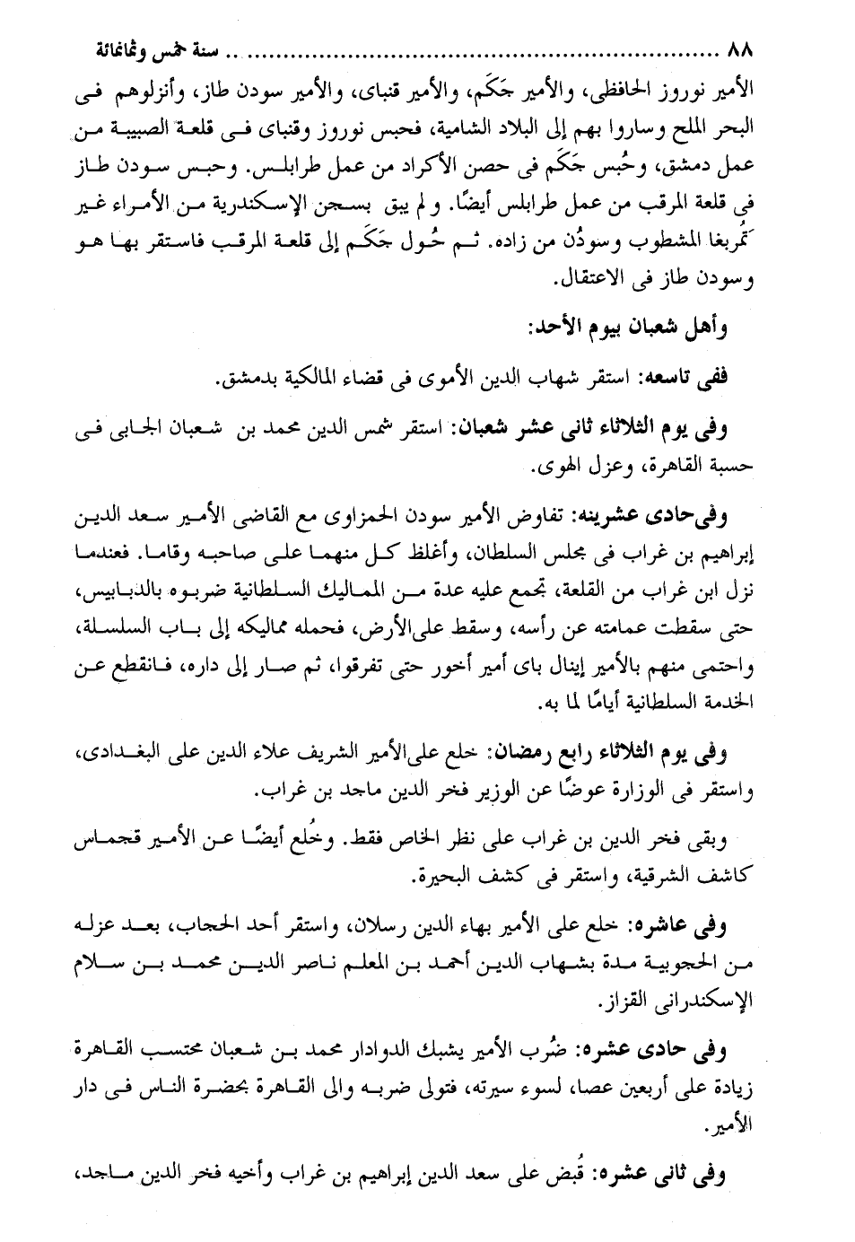 الْأَمِير نوروز الحافظي والأمير جكم والأمير قنباي والأمير سودن طاز وأنزلوهم فِي الْبَحْر الْملح وَسَارُوا بهم إِلَى الْبِلَاد الشامية فحبس نوروز وقنباي فِي قلعة الصبيبة من عمل دمشق وَحبس جكم فِي حصن الأكراد من عمل طرابلس. وَحبس سودن طاز فِي قلعة المرقب من عمل طرابلس أَيْضا. وَلم يبْق بسجن الْإسْكَنْدَريَّة من الْأُمَرَاء غير تمربغا المشطوب وسودن من زَاده ثمَّ حول جكم إِلَى قلعة المرقب فاستمر بهَا هُوَ وسودن طاز فِي الاعتقال. وَأهل شعْبَان بِيَوْم الْأَحَد: وَفِي يَوْم الثُّلَاثَاء ثَانِي عشر شعْبَان: اسْتَقر شمس الدّين مُحَمَّد بن شعْبَان الجابي فِي حسبَة الْقَاهِرَة وعزل الْهوى. وَفِي حادي عشرينه: تفاوض الْأَمِير سودن الحمزاوي مَعَ القَاضِي الْأَمِير سعد الدّين إِبْرَاهِيم بن غراب فِي مجْلِس السُّلْطَان وَأَغْلظ كل مِنْهُمَا على صَاحبه وقاما. فعندما نزل ابْن غراب من القلعة تجمع عَلَيْهِ عدَّة من المماليك السُّلْطَانِيَّة ضربوه بالدبابيس حَتَّى سَقَطت عمَامَته عَن رَأسه وَسقط على الأَرْض فَحَمله مماليكه إِلَى بَاب السلسلة واحتمي مِنْهُم بالأمير إينال باي أَمِير أخور حَتَّى تفَرقُوا ثمَّ صَار إِلَى دَاره فَانْقَطع عَن الْخدمَة السُّلْطَانِيَّة أَيَّامًا لما بِهِ. وَفِي يَوْم الثُّلَاثَاء رَابِع رَمَضَان: خلع على الْأَمِير الشريف عَلَاء الدّين عَليّ البعدادي وَاسْتقر فِي الوزارة عوضا عَن الْوَزير فَخر الدّين ماجد بن غراب. وَبَقِي فَخر الدّين بن غراب على نظر الْخَاص فَقَط. وخلع أَيْضا عَن الْأَمِير قجماس كاشف الشرقية وَاسْتقر فِي كشف الْبحيرَة. وَفِي عاشره: خلع على الْأَمِير بهاء الدّين رسْلَان وَاسْتقر أحد الْحجاب بعد عَزله من الحجوبية مُدَّة بشهاب الدّين أَحْمد بن الْمعلم نَاصِر الدّين مُحَمَّد بن سَلام الإسْكَنْدراني الْقَزاز. وَفِي حادي عشره: ضرب الْأَمِير يشبك الدوادار مُحَمَّد بن شعْبَان محتسب الْقَاهِرَة زِيَادَة على أَرْبَعِينَ عَصا لسوء سيرته فَتَوَلّى ضربه وَالِي الْقَاهِرَة بِحَضْرَة النَّاس فِي دَار الْأَمِير. وَفِي ثَانِي عشره: قبض على سعد الدّين إِبْرَاهِيم بن غراب وأخيه فَخر الدّين ماجد