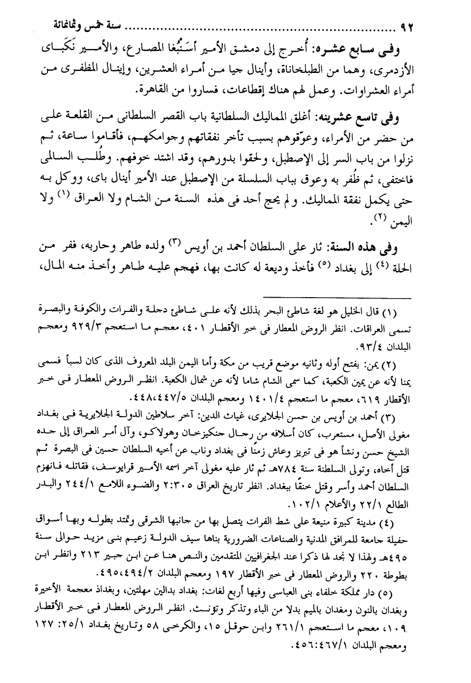 وَفِي سَابِع عشره: أخرج إِلَى دمشق الْأَمِير أسنبغا المصارع والأمير نكباي الأزدمري وهما من الطبلخاناة وأينال جيا من أُمَرَاء الْعشْرين وإينال المظفري من أُمَرَاء العشراوات. وَعمل لَهُم هُنَاكَ اقطاعات فَسَارُوا من الْقَاهِرَة. وَفِي تاسمع عشرينه: اغلق المماليك السُّلْطَانِيَّة بَاب الْقصر السلطاني من القلعة على من حضر من الْأُمَرَاء وعوقوهم بِسَبَب تَأَخّر نفقاتهم وجوامكهم فأقاموا سَاعَة ثمَّ نزلُوا من بَاب السِّرّ إِلَى الإصطبل وَلَحِقُوا بدورهم وَقد اشْتَدَّ خوفهم. وَطلب السالمي فاختفى ثمَّ طمر بِهِ وعوق بِبَاب السلسلة من الإصطبل عِنْد الْأَمِير أينال باي ووكل بِهِ حَتَّى يكمل نَفَقَة المماليك. وَلم يحجّ أحد فِي هَذِه السّنة من الشَّام وَلَا الْعرَاق وَلَا الْيمن. وَفِي هَذِه السّنة: ثار على السُّلْطَان أَحْمد بن أويس وَلَده طَاهِر وحاربه ففر من الْحلَّة إِلَى بَغْدَاد فَأخذ وَدِيعَة لَهُ كَانَت بهَا فهجم عَلَيْهِ طَاهِر وَأخذ مِنْهُ المَال