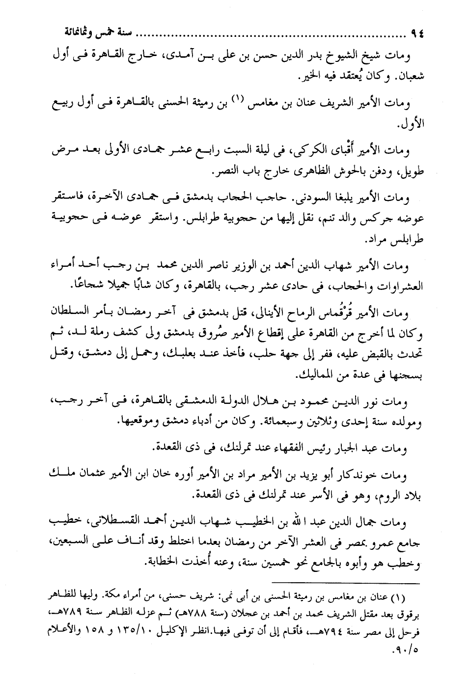 وَمَات شيخ الشُّيُوخ بدر الدّين حسن بن عَليّ بن آمدي خَارج الْقَاهِرَة فِي أول شعْبَان. وَكَانَ يعْتَقد فِيهِ الْخَيْر. وَمَات الْأَمِير الشريف عنان بن مغامس بن رميثة الحسني بِالْقَاهِرَةِ فِي أول ربيع الأول. وَمَات الْأَمِير أقباي الكركي فِي لَيْلَة السبت رَابِع عشر جُمَادَى الأولى بعد مرض طَوِيل وَدفن بالحوش الظَّاهِرِيّ خَارج بَاب النَّصْر. وَمَات الْأَمِير يلبغا السودني. حَاجِب الْحجاب بِدِمَشْق فِي جُمَادَى الْآخِرَة فاستقر عوضه جركس وَالِد تنم نقل إِلَيْهَا من حجوبية طرابلس. وَاسْتقر عوضه فِي حجوبية طرابلس مُرَاد. وَمَات الْأَمِير شهَاب الدّين أَحْمد بن الْوَزير نَاصِر الدّين مُحَمَّد بن رَجَب أحد أُمَرَاء العشراوات وَمَات الْأَمِير قرقماس الرماح الأينالي قتل بِدِمَشْق فِي أخر رَمَضَان بِأَمْر السُّلْطَان وَكَانَ لما أخرج من الْقَاهِرَة على إقطاع الْأَمِير صروق بِدِمَشْق ولي كشف رَملَة لد ثمَّ تحدث بِالْقَبْضِ عَلَيْهِ ففر إِلَى جِهَة حلب فَأخذ عِنْد بعلبك وَحمل إِلَى دمشق وَقتل بسجنها فِي عدَّة من المماليك. وَمَات نور الدّين مَحْمُود بن هِلَال الدولة الدِّمَشْقِي بِالْقَاهِرَةِ فِي آخر رَجَب ومولده سنة إِحْدَى وَثَلَاثِينَ وَسَبْعمائة. وَكَانَ من أدباء دمشق وموقعيها. وَمَات عبد الْجَبَّار رَئِيس الْفُقَهَاء عِنْد تمرلنك فِي ذِي الْقعدَة. وَمَات خوندكار أَبُو يزِيد بن الْأَمِير مُرَاد بن الْأَمِير أوره خَان ابْن الْأَمِير عُثْمَان ملك بِلَاد الرّوم وَهُوَ فِي الْأسر عِنْد تمرلنك فِي ذِي الْقعدَة. وَمَات جال الدّين عبد الله بن الْخطب شهَاب الدّين أَحْمد الْقُسْطَلَانِيّ خطيب جَامع عَمْرو بِمصْر فِي الْعشْر الآخر من رَمَضَان بَعْدَمَا اخْتَلَط وَقد أناف على السّبْعين وخطب هُوَ وَأَبوهُ بالجامع نَحْو خمسين سنة وَعنهُ أخذت الخطابة.