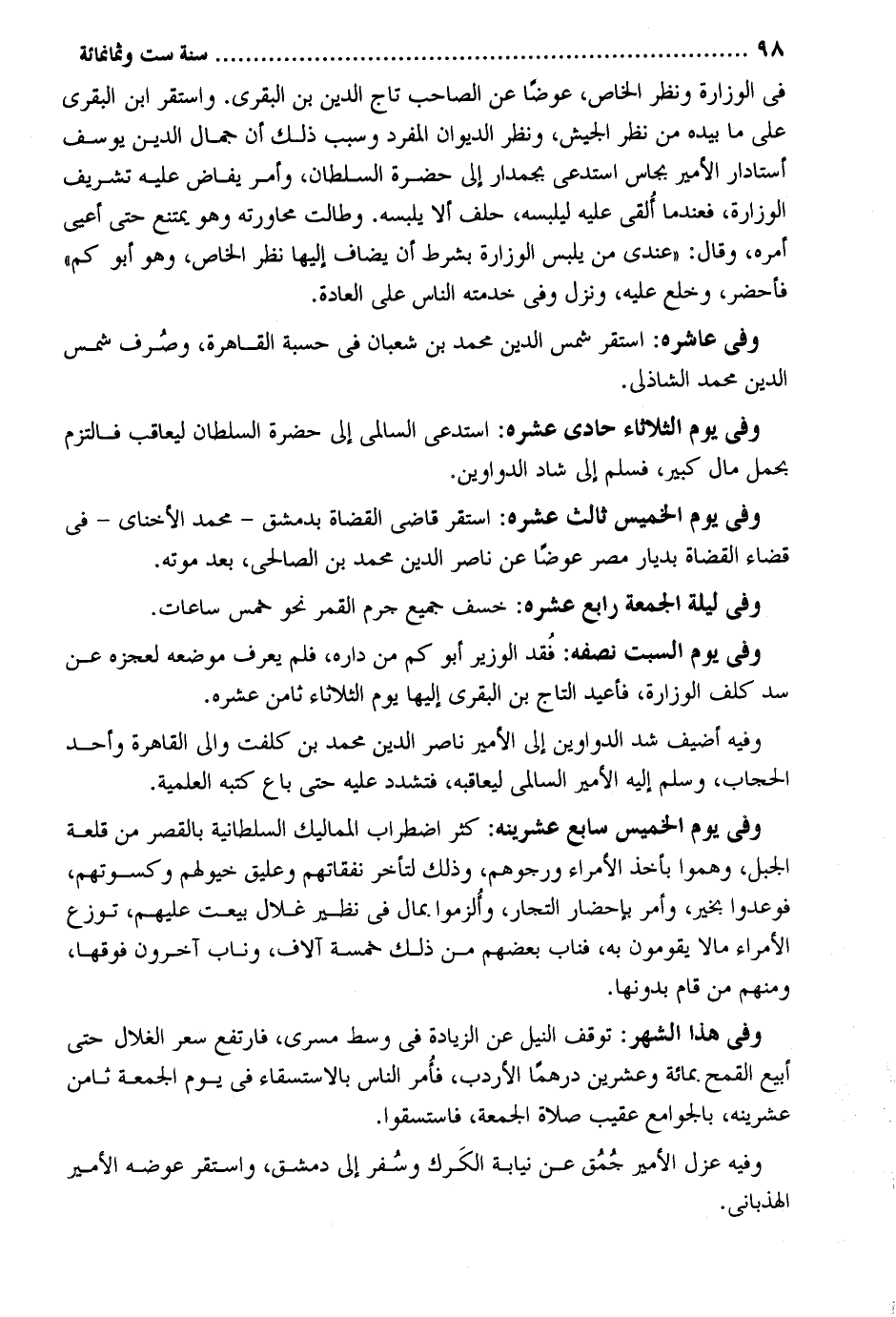 فِي الوزارة وَنظر الْخَاص عوضا عَن الصاحب تَاج الدّين بن البقري. وَاسْتقر ابْن البقري على مَا بِيَدِهِ من نظر الْجَيْش وَنظر الدِّيوَان الْمُفْرد وَسبب ذَلِك أَن جمال الدّين يُوسُف أستادار الْأَمِير بجاس استدعي بجمدار إِلَى حَضْرَة السُّلْطَان وَأمر يفاض عَلَيْهِ تشريف الوزارة فعندما ألْقى عَلَيْهِ ليلبسه حلف أَلا يلْبسهُ. وطالت محاورته وَهُوَ يمْتَنع حَتَّى أعيى أمره وَقَالَ: عِنْدِي من يلبس الوزارة بِشَرْط أَن يُضَاف إِلَيْهَا نظر الْخَاص وَهُوَ أَبُو كم فأحضر وخلع عَلَيْهِ وَنزل وَفِي خدمته النَّاس على وَفِي عاشره: اسْتَقر شمس الدّين مُحَمَّد بن شعْبَان فِي حسبَة الْقَاهِرَة وَصرف شمس الدّين عمد الشاذلي. وَفِي يَوْم الثُّلَاثَاء حادي عشره: استدعى السالمي إِلَى حَضْرَة السُّلْطَان ليعاقب فالتزم بِحمْل مَال كَبِير فَسلم إِلَى شاد الدَّوَاوِين. وَفِي يَوْم الْخَمِيس ثَالِث عشره: اسْتَقر قَاضِي الْقُضَاة بِدِمَشْق - مُحَمَّد الأخناي - فِي قَضَاء الْقُضَاة بديار مصر عوضا عَن نَاصِر الدّين مُحَمَّد بن الصَّالِحِي بعد مَوته. وَفِي لَيْلَة الْجُمُعَة رَابِع عشره: خسف جَمِيع جرم الْقَمَر نَحْو خمس سَاعَات. وَفِي يَوْم السبت نصفه: فقد الْوَزير أَبُو كم من دَاره فَلم يعرف مَوْضِعه لعَجزه عَن سد كلف الوزارة فأعيد التَّاج بن البقري إِلَيْهَا يَوْم الثُّلَاثَاء ثامن عشره. وَفِيه أضيف شدّ الدَّوَاوِين إِلَى الْأَمِير نَاصِر الدّين مُحَمَّد بن كلفت وَالِي الْقَاهِرَة وَأحد الْحجاب وَسلم إِلَيْهِ الْأَمِير السالمي ليعاقبه فتشدد عَلَيْهِ حَتَّى بَاعَ كتبه العلمية. وَفِي يَوْم الْخَمِيس سَابِع عشرينه: كثر اضْطِرَاب المماليك السُّلْطَانِيَّة بِالْقصرِ من قلعة الْجَبَل وهموا بِأخذ الْأُمَرَاء ورجوهم وَذَلِكَ لتأخر نفقاتهم وعليق خيولهم وكسوتهم فوعدوا بِخَير وَأمر بإحضار التُّجَّار وألزموا بِمَال فِي نَظِير غلال بِيعَتْ عَلَيْهِم توزع الْأُمَرَاء مَالا يقومُونَ بِهِ فناب وَفِي هَذَا الشَّهْر: توقف النّيل عَن الزِّيَادَة فِي وسط مسرى فارتفع سعر الغلال حَتَّى أبيع الْقَمْح بِمِائَة وَعشْرين درهما الأردب فَأمر النَّاس بالاستسقاء فِي يَوْم الْجُمُعَة ثامن عشرينه بالجوامع عقيب صَلَاة الْجُمُعَة فاستسقوا. وَفِيه عزل الْأَمِير جمق عَن نِيَابَة الكرك وسفر إِلَى دمشق وَاسْتقر عوضه الْأَمِير الهذباني.