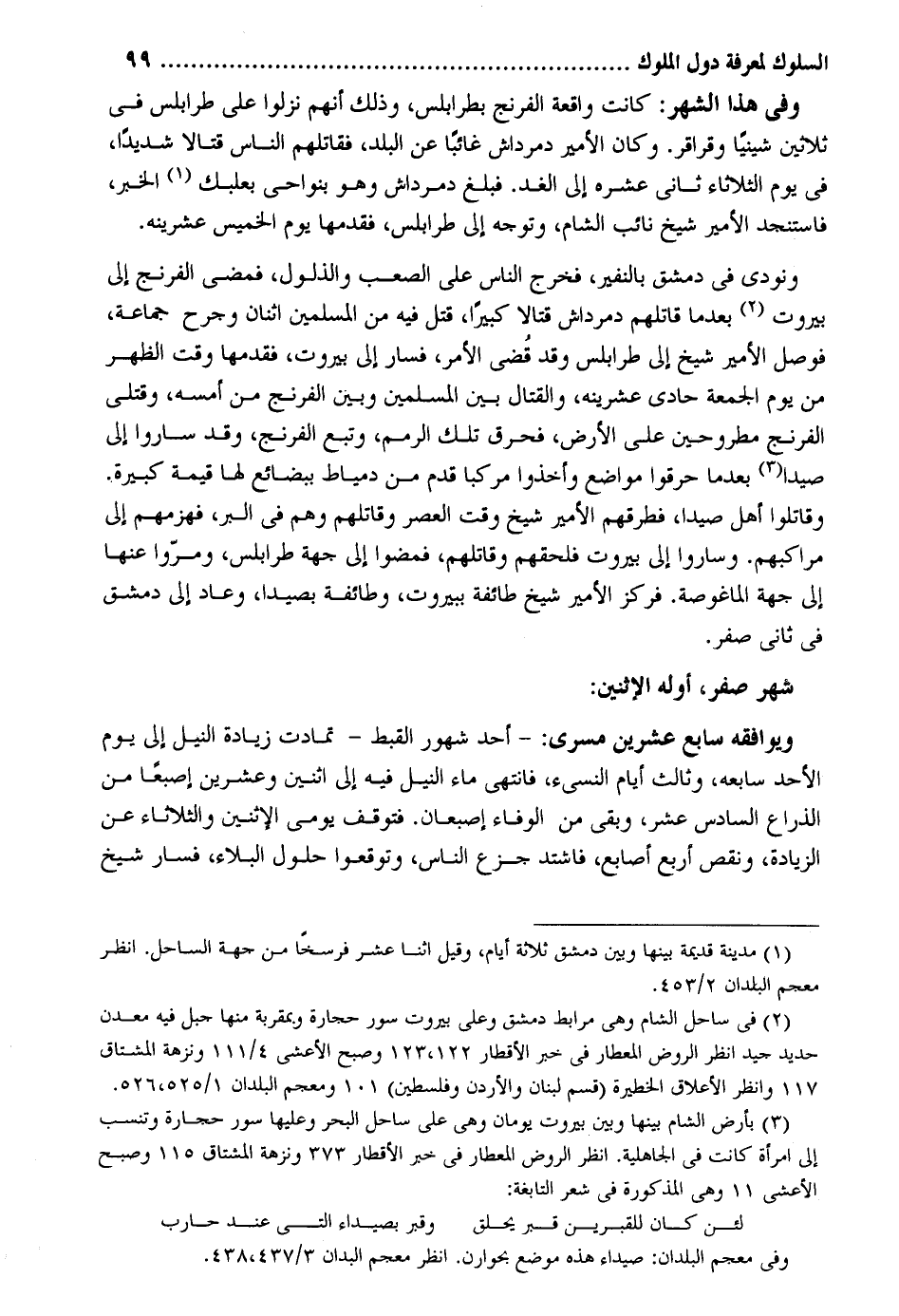 وَفِي هَذَا الشَّهْر: كَانَت وَاقعَة الفرنج بطرابلس وَذَلِكَ أَنهم نزلُوا على طرابلس فِي ثَلَاثِينَ شينياً وقراقر. وَكَانَ الْأَمِير دمرداش غَائِبا عَن الْبَلَد فَقَاتلهُمْ النَّاس قتالاً شَدِيدا فِي يَوْم الثُّلَاثَاء ثَانِي عشره إِلَى الْغَد. فَبلغ دمرداش وَهُوَ بنواحي بعلبك الْخَبَر فاستنجد الْأَمِير شيخ نَائِب الشَّام وَتوجه إِلَى طرابلس فَقَدمهَا يَوْم الْخَمِيس عشرينه. وَنُودِيَ فِي دمشق بالنفير فَخرج النَّاس على الصعب والذلول فَمضى الفرنج إِلَى بيروت بَعْدَمَا قَاتلهم دمرداش قتالاً كَبِيرا قتل فِيهِ من الْمُسلمين اثْنَان وجرح جمَاعَة فوصل الْأَمِير شيخ إِلَى طرابلس وَقد قضى الْأَمر فَسَار إِلَى بيروت فَقَدمهَا وَقت الظّهْر من يَوْم الْجُمُعَة حادي عشرينه والقتال بَين الْمُسلمين وَبَين الفرنج من أمسه وقتلى الفرنج مطروحين على الأَرْض فَحرق تِلْكَ الرمم وَتبع الفرنج وَقد سَارُوا إِلَى صيدا بَعْدَمَا حرقوا مَوَاضِع وَأخذُوا مركبا قدم من دمياط بِبَضَائِع لَهَا قيمَة كَبِيرَة. وقاتلوا أهل صيدا فطرقهم الْأَمِير شيخ وَقت الْعَصْر وَقَاتلهمْ وهم فِي الْبر فَهَزَمَهُمْ إِلَى مراكبهم. وَسَارُوا إِلَى بيروت فلحقهم وَقَاتلهمْ فَمَضَوْا إِلَى جِهَة طرابلس ومروا عَنْهَا إِلَى جِهَة الماغوصة. فَرَكزَ الْأَمِير شيخ طَائِفَة ببيروت وَطَائِفَة بصيدا وَعَاد إِلَى دمشق فِي ثَانِي صفر. شهر صفر أَوله الِاثْنَيْنِ: وَيُوَافِقهُ سَابِع عشْرين مسرى: - أحد شهور القبط - تمادت زِيَادَة النّيل إِلَى يَوْم الْأَحَد سابعه وثالث أَيَّام النسيء فَانْتهى مَاء النّيل فِيهِ إِلَى اثْنَيْنِ وَعشْرين إصبعاً من الذِّرَاع السَّادِس عشر وبقى من الْوَفَاء إصبعان. فتوقف يومي الِاثْنَيْنِ وَالثُّلَاثَاء عَن الزِّيَادَة وَنقص أَربع أَصَابِع فَاشْتَدَّ جزع النَّاس وتوقعوا حُلُول الْبلَاء فَسَار شيخ