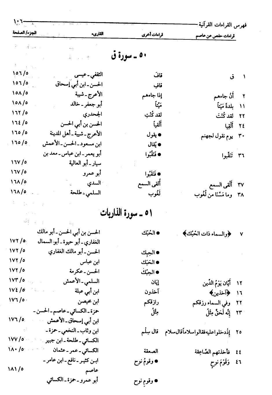 ٧: وَالسَّماءِ ذاتِ الْحُبُكِ: الحبك: الحسن بن أبي الحسن- أبو مالك الغفاري- أبو حيوة- أبو السمال: ٥/ ١٧٢ الحبك: الحسن- أبو مالك الغفاري: ٥/ ١٧٢ الحبك: ابن عباس: ٥/ ١٧٢ الحبك: الحسن- عكرمة: ٥/ ١٧٢ ١٢: أَيَّانَ يَوْمُ الدِّينِ: إيان: السلمي- الأعمش: ٥/ ١٧٣ ١٦: آخِذِينَ: آخذون: ابن أبي عبلة: ٥/ ١٧٤ ٢٢: وَفِي السَّماءِ رِزْقُكُمْ: رازقكم: ابن محيصن: ٥/ ١٧٦ ٢٣: إِنَّهُ لَحَقٌّ مِثْلَ: مثل: حمزة- الكسائي- عاصم- الحسن- ابن أبي إسحاق- الأعمش: ٥/ ١٧٦ ٢٥: إِذْ دَخَلُوا عَلَيْهِ فَقالُوا سَلاماً قالَ سَلامٌ: قال سلم: ابن وثاب- النخعي- حمزة- الكسائي- طلحة- ابن جبير: ٥/ ١٧٧ ٤٤: فَأَخَذَتْهُمُ الصَّاعِقَةُ: الصعقة: الكسائي- عمر- عثمان: ٥/ ١٨٠ ٤٦: وَقَوْمَ نُوحٍ: وقوم نوح: ابن كثير- نافع- ابن عامر- عاصم: ٥/ ١٨١ وقوم نوح: أبو عمرو- حمزة- الكسائي