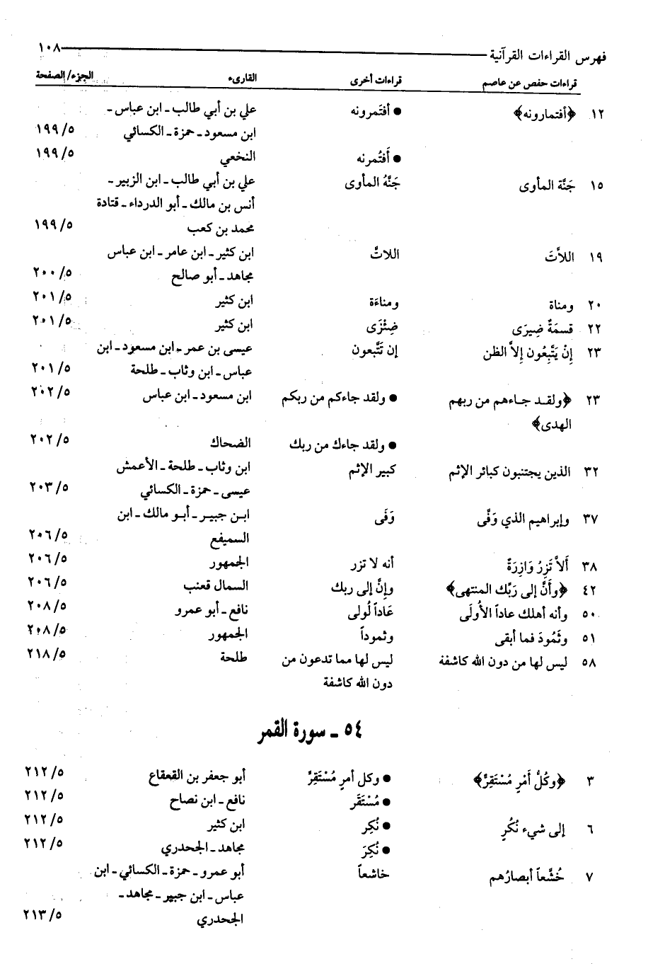 ١٢: أَفَتُمارُونَهُ: أفتمرونه: علي بن أبي طالب- ابن عباس- ابن مسعود- حمزة- الكسائي: ٥/ ١٩٩ أفتمرنه: النخعي: ٥/ ١٩٩ ١٥: جَنَّةُ الْمَأْوى: جنّة المأوى: علي بن أبي طالب- ابن الزبير- أنس بن مالك- أبو الدرداء- قتادة محمد بن كعب: ٥/ ١٩٩ ١٩: اللَّاتَ: اللاتّ: ابن كثير- ابن عامر- ابن عباس مجاهد- أبو صالح: ٥/ ٢٠٠ ٢٠: وَمَناةَ: ومناءة: ابن كثير: ٥/ ٢٠١ ٢٢: قِسْمَةٌ ضِيزى: ضئزى: ابن كثير: ٥/ ٢٠١ ٢٣: إِنْ يَتَّبِعُونَ إِلَّا الظَّنَّ: إن تتّبعون: عيسى بن عمر- ابن مسعود- ابن عباس- ابن وثاب- طلحة: ٥/ ٢٠١ ٢٣: وَلَقَدْ جاءَهُمْ مِنْ رَبِّهِمُ الْهُدى: ولقد جاءكم من ربكم: ابن مسعود- ابن عباس: ٥/ ٢٠٢ ولقد جاءك من ربك: الضحاك: ٥/ ٢٠٢ ٣٢: الَّذِينَ يَجْتَنِبُونَ كَبائِرَ الْإِثْمِ: كبير الإثم: ابن وثاب- طلحة- الأعمش عيسى- حمزة- الكسائي: ٥/ ٢٠٣ ٣٧: وَإِبْراهِيمَ الَّذِي وَفَّى: وفى: ابن جبير- أبو مالك- ابن السميفع: ٥/ ٢٠٦ ٣٨: أَلَّا تَزِرُ وازِرَةٌ: أنه لا تزر: الجمهور: ٥/ ٢٠٦ ٤٢: وَأَنَّ إِلى رَبِّكَ الْمُنْتَهى: وإنّ إلى ربك: السمال قعنب: ٥/ ٢٠٦ ٥٠: وَأَنَّهُ أَهْلَكَ عاداً الْأُولى: عادا لولى: نافع- أبو عمرو: ٥/ ٢٠٨ ٥١: وَثَمُودَ فَما أَبْقى: وثمودا: الجمهور: ٥/ ٢٠٨ ٥٨: لَيْسَ لَها مِنْ دُونِ اللَّهِ كاشِفَةٌ: ليس لها مما تدعون من دون الله كاشفة: طلحة: ٥/ ٢١٨