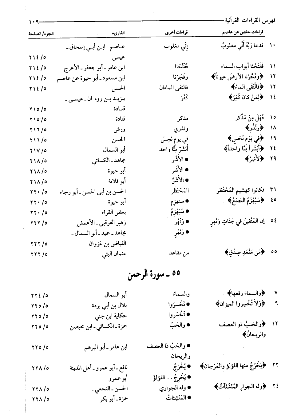 ٧: وَالسَّماءَ رَفَعَها: والسماء: أبو السمال: ٥/ ٢٢٤ ٩: وَلا تُخْسِرُوا الْمِيزانَ: تخسروا: بلال بن أبي بردة: ٥/ ٢٢٥ تخسروا: حكاية ابن جني: ٥/ ٢٢٥ ١٢: وَالْحَبُّ ذُو الْعَصْفِ وَالرَّيْحانُ: والحبّ: حمزة- الكسائي- ابن محيصن: ٥/ ٢٢٥ والحبّ ذا العصف والريحان: ابن عامر- أبو البرهم: ٥/ ٢٢٥ ٢٢: يَخْرُجُ مِنْهُمَا اللُّؤْلُؤُ وَالْمَرْجانُ: يخرج: نافع- أبو عمرو- أهل المدينة: ٥/ ٢٢٨ يخرج.. اللؤلؤ: أبو عمرو ٢٤: وَلَهُ الْجَوارِ الْمُنْشَآتُ: وله الجواري: الحسن- النخعي.: ٥/ ٢٢٨