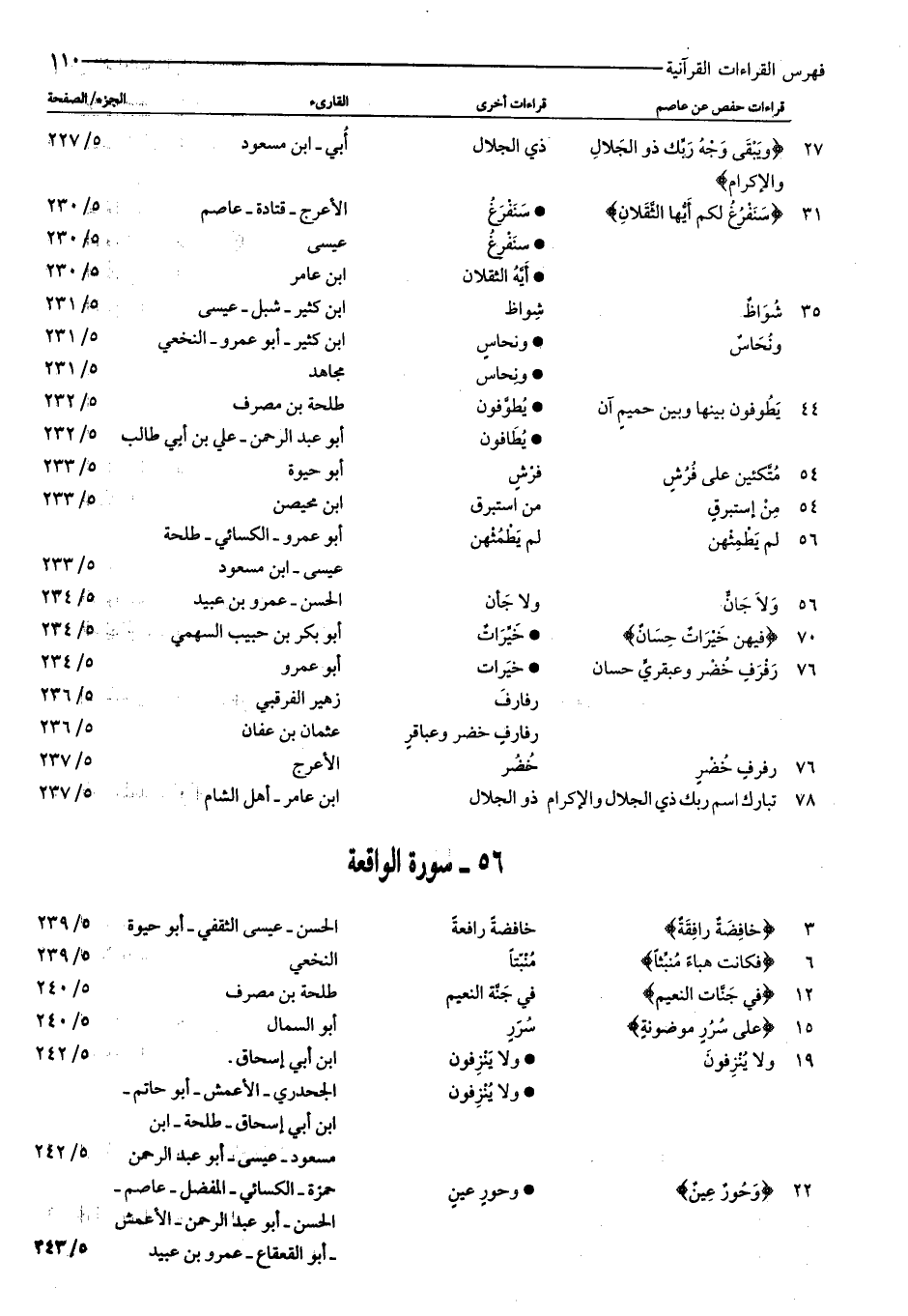 ٢٧: وَيَبْقى وَجْهُ رَبِّكَ ذُو الْجَلالِ وَالْإِكْرامِ: ذي الجلال: أبي- ابن مسعود: ٥/ ٢٢٧ ٣١: سَنَفْرُغُ لَكُمْ أَيُّهَ الثَّقَلانِ: سنفرغ: الأعرج- قتادة- عاصم: ٥/ ٢٣٠ سنفرغ: عيسى: ٥/ ٢٣٠ أيّة الثقلان: ابن عامر: ٥/ ٢٣٠ ٣٥: شُواظٌ: شواظ: ابن كثير- شبل- عيسى: ٥/ ٢٣١ وَنُحاسٌ: ونحاس: ابن كثير- أبو عمرو- النخعي: ٥/ ٢٣١ ونحاس: مجاهد: ٥/ ٢٣١ ٤٤: يَطُوفُونَ بَيْنَها وَبَيْنَ حَمِيمٍ آنٍ: يطوّفون: طلحة بن مصرف: ٥/ ٢٣٢ يطافون: أبو عبد الرحمن- علي بن أبي طالب: ٥/ ٢٣٢ ٥٤: مُتَّكِئِينَ عَلى فُرُشٍ: فرش: أبو حيوة: ٥/ ٢٣٣ ٥٤: مِنْ إِسْتَبْرَقٍ: من إستبرق: ابن محيصن: ٥/ ٢٣٣ ٥٦: لَمْ يَطْمِثْهُنَّ: لم يطمثهن: أبو عمرو- الكسائي- طلحة عيسى- ابن مسعود: ٥/ ٢٣٣ ٥٦: وَلا جَانٌّ: ولا جأن: الحسن- عمرو بن عبيد: ٥/ ٢٣٤ ٧٠: فِيهِنَّ خَيْراتٌ حِسانٌ: خيّرات: أبو بكر بن حبيب السهمي: ٥/ ٢٣٤ ٧٦: رَفْرَفٍ خُضْرٍ وَعَبْقَرِيٍّ حِسانٍ: خيرات: أبو عمرو: ٥/ ٢٣٤ رفارف: زهير الفرقبي: ٥/ ٢٣٦ رفارف خضر وعباقر: عثمان بن عفان: ٥/ ٢٣٦ ٧٦: رَفْرَفٍ خُضْرٍ: خضر: الأعرج: ٥/ ٢٣٧ ٧٨: تَبارَكَ اسْمُ رَبِّكَ ذِي الْجَلالِ وَالْإِكْرامِ: ذو الجلال: ابن عامر- أهل الشام: ٥/ ٢٣٧
