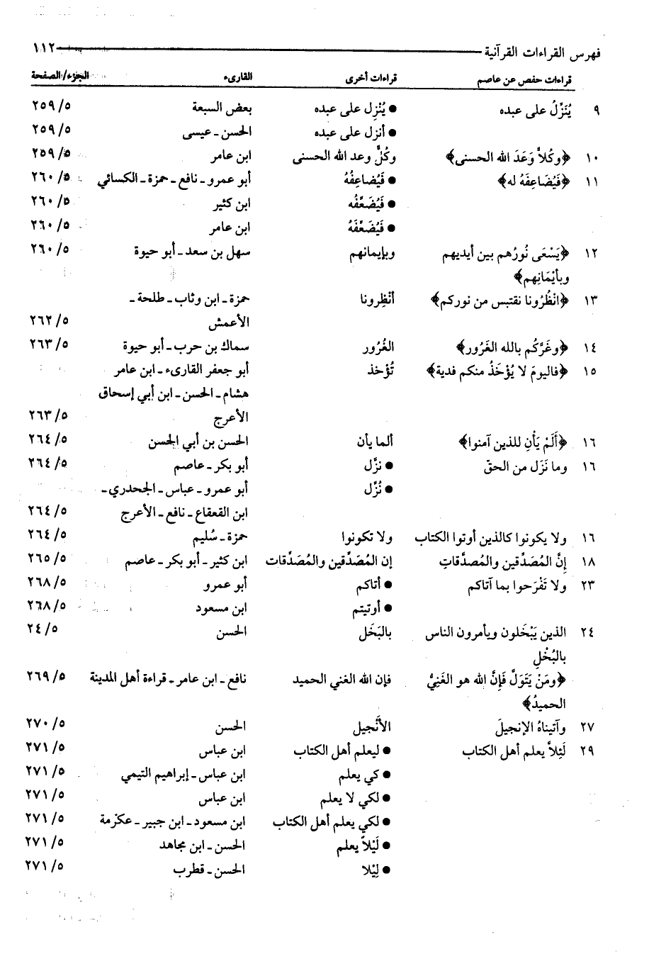 ٩: يُنَزِّلُ عَلى عَبْدِهِ: ينزل على عبده: بعض السبعة: ٥/ ٢٥٩ أنزل على عبده: الحسن- عيسى: ٥/ ٢٥٩ ١٠: وَكُلًّا وَعَدَ اللَّهُ الْحُسْنى: وكلّ وعد الله الحسنى: ابن عامر: ٥/ ٢٥٩ ١١: فَيُضاعِفَهُ لَهُ: فيضاعفه: أبو عمرو- نافع- حمزة- الكسائي: ٥/ ٢٦٠ فيضعّفه: ابن كثير: ٥/ ٢٦٠ فيضعّفه: ابن عامر: ٥/ ٢٦٠ ١٢: يَسْعى نُورُهُمْ بَيْنَ أَيْدِيهِمْ وَبِأَيْمانِهِمْ: وبإيمانهم: سهل بن سعد- أبو حيوة: ٥/ ٢٦٠ ١٣: انْظُرُونا نَقْتَبِسْ مِنْ نُورِكُمْ: أنظرونا: حمزة- ابن وثاب- طلحة- الأعمش: ٥/ ٢٦٢ ١٤: وَغَرَّكُمْ بِاللَّهِ الْغَرُورُ: الغرور: سماك بن حرب- أبو حيوة: ٥/ ٢٦٣ ١٥: فَالْيَوْمَ لا يُؤْخَذُ مِنْكُمْ فِدْيَةٌ: تؤخذ: أبو جعفر القارئ- ابن عامر هشام- الحسن- ابن أبي إسحاق الأعرج: ٥/ ٢٦٣ ١٦: أَلَمْ يَأْنِ لِلَّذِينَ آمَنُوا: ألما يأن: الحسن بن أبي الحسن: ٥/ ٢٦٤ ١٦: وَما نَزَلَ مِنَ الْحَقِّ: نزّل: أبوبكر- عاصم: ٥/ ٢٦٤ نزّل: أبو عمرو- عباس- الجحدري- ابن القعقاع- نافع- الأعرج: ٥/ ٢٦٤ ١٦: وَلا يَكُونُوا كَالَّذِينَ أُوتُوا الْكِتابَ: ولا تكونوا: حمزة- سليم: ٥/ ٢٦٤ ١٨: إِنَّ الْمُصَّدِّقِينَ وَالْمُصَّدِّقاتِ: إن المصدّقين والمصدّقات: ابن كثير- أبو بكر- عاصم: ٥/ ٢٦٥ ٢٣: وَلا تَفْرَحُوا بِما آتاكُمْ: أتاكم: أبو عمرو: ٥/ ٢٦٨ أوتيتم: ابن مسعود: ٥/ ٢٦٨ ٢٤: الَّذِينَ يَبْخَلُونَ وَيَأْمُرُونَ النَّاسَ بِالْبُخْلِ: بالبخل: الحسن: ٥/ ٢٤ وَمَنْ يَتَوَلَّ فَإِنَّ اللَّهَ هُوَ الْغَنِيُّ الْحَمِيدُ: فإن الله الغني الحميد: نافع- ابن عامر- قراءة أهل المدينة: ٥/ ٢٦٩ ٢٧: وَآتَيْناهُ الْإِنْجِيلَ: الإنجيل: الحسن: ٥/ ٢٧٠ ٢٩: لِئَلَّا يَعْلَمَ أَهْلُ الْكِتابِ: ليعلم أهل الكتاب: ابن عباس: ٥/ ٢٧١ كي يعلم: ابن عباس- إبراهيم التيمي: ٥/ ٢٧١ لكي لا يعلم: ابن عباس: ٥/ ٢٧١ لكي يعلم أهل الكتاب: ابن مسعود- ابن جبير- عكرمة: ٥/ ٢٧١ ليلا يعلم: الحسن- ابن مجاهد: ٥/ ٢٧١ ليلا: الحسن- قطرب: ٥/ ٢٧١