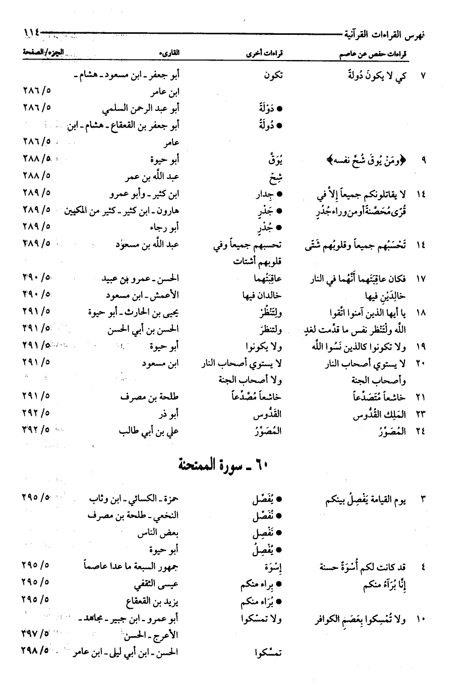 ٣: يَوْمَ الْقِيامَةِ يَفْصِلُ بَيْنَكُمْ: يفصّل: حمزة- الكسائي- ابن وثاب: ٥/ ٢٩٥ نفصّل: النخعي- طلحة بن مصرف نفصل: بعض الناس يفصل: أبو حيوة ٤: قَدْ كانَتْ لَكُمْ أُسْوَةٌ حَسَنَةٌ: إسوة: جمهور السبعة ما عدا عاصما: ٥/ ٢٩٥ إِنَّا بُرَآؤُا مِنْكُمْ: براء منكم: عيسى الثقفي: ٥/ ٢٩٥ براء منكم: يزيد بن القعقاع: ٥/ ٢٩٥ ١٠: وَلا تُمْسِكُوا بِعِصَمِ الْكَوافِرِ: ولا تمسّكوا: أبو عمرو- ابن جبير- مجاهد- الأعرج- الحسن: ٥/ ٢٩٧ تمسّكوا: الحسن- ابن أبي ليلى- ابن عامر: ٥/ ٢٩٨