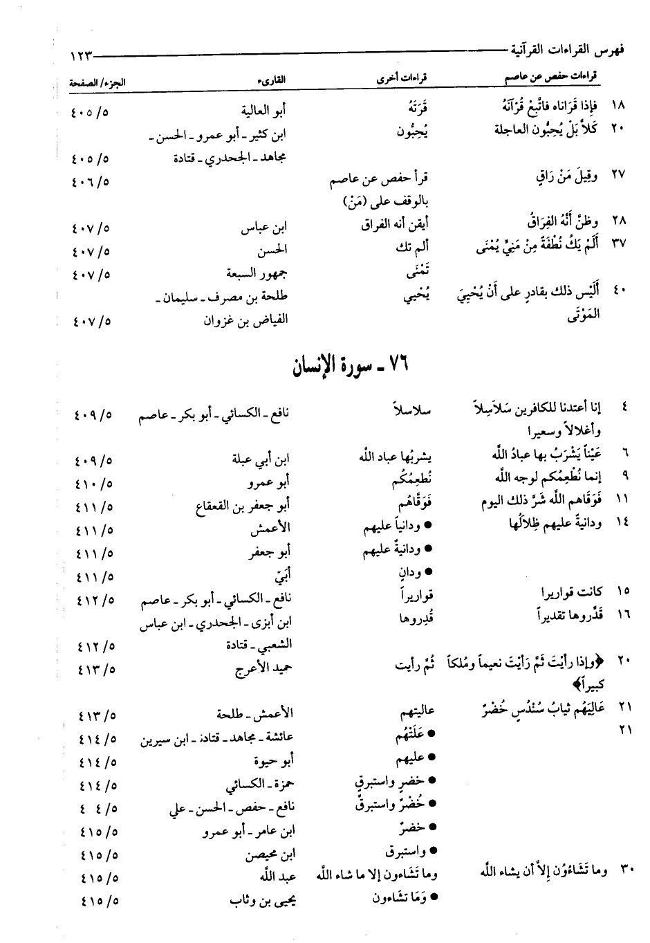 ٤: إِنَّا أَعْتَدْنا لِلْكافِرِينَ سَلاسِلَ وَأَغْلالًا وَسَعِيراً: سلاسلا: نافع- الكسائي- أبو بكر- عاصم: ٥/ ٤٠٩ ٦: عَيْناً يَشْرَبُ بِها عِبادُ اللَّهِ: يشربها عباد الله: ابن أبي عبلة: ٥/ ٤٠٩ ٩: إِنَّما نُطْعِمُكُمْ لِوَجْهِ اللَّهِ: نطعمكم: أبو عمرو: ٥/ ٤١٠ ١١: فَوَقاهُمُ اللَّهُ شَرَّ ذلِكَ الْيَوْمِ: فوقّاهم: أبو جعفر بن القعقاع: ٥/ ٤١١ ١٤: وَدانِيَةً عَلَيْهِمْ ظِلالُها: ودانيا عليهم: الأعمش: ٥/ ٤١١ ودانية عليهم: أبو جعفر: ٥/ ٤١١ ودان: أبيّ: ٥/ ٤١١ ١٥: كانَتْ قَوارِيرَا: قواريرا: نافع- الكسائي- أبو بكر- عاصم: ٥/ ٤١٢ ١٦: قَدَّرُوها تَقْدِيراً: قدروها: ابن أبزى- الجحدري- ابن عباس الشعبي- قتادة: ٥/ ٤١٢ ٢٠: وَإِذا رَأَيْتَ ثَمَّ رَأَيْتَ نَعِيماً وَمُلْكاً كَبِيراً: ثمّ رأيت: حميد الأعرج: ٥/ ٤١٣ ٢١: عالِيَهُمْ ثِيابُ سُندُسٍ خُضْرٌ: عاليتهم: الأعمش- طلحة: ٥/ ٤١٣ ٢١: علتهم عائشة- مجاهد- قتادة- ابن سيرين: ٥/ ٤١٤ عليهم: أبو حيوة: ٥/ ٤١٤ خضر وإستبرق: حمزة- الكسائي: ٥/ ٤١٤ خضر وإستبرق: نافع- حفص- الحسن- علي: ٥/ ٤١٤ خضر: ابن عامر- أبو عمرو: ٥/ ٤١٥ وإستبرق: ابن محيصن: ٥/ ٤١٥ ٣٠: وَما تَشاؤُنَ إِلَّا أَنْ يَشاءَ اللَّهُ: وما تشاءون إلا ما شاء الله: عبد الله: ٥/ ٤١٥ وما تشاءون: يحيى بن وثاب: ٥/ ٤١٥