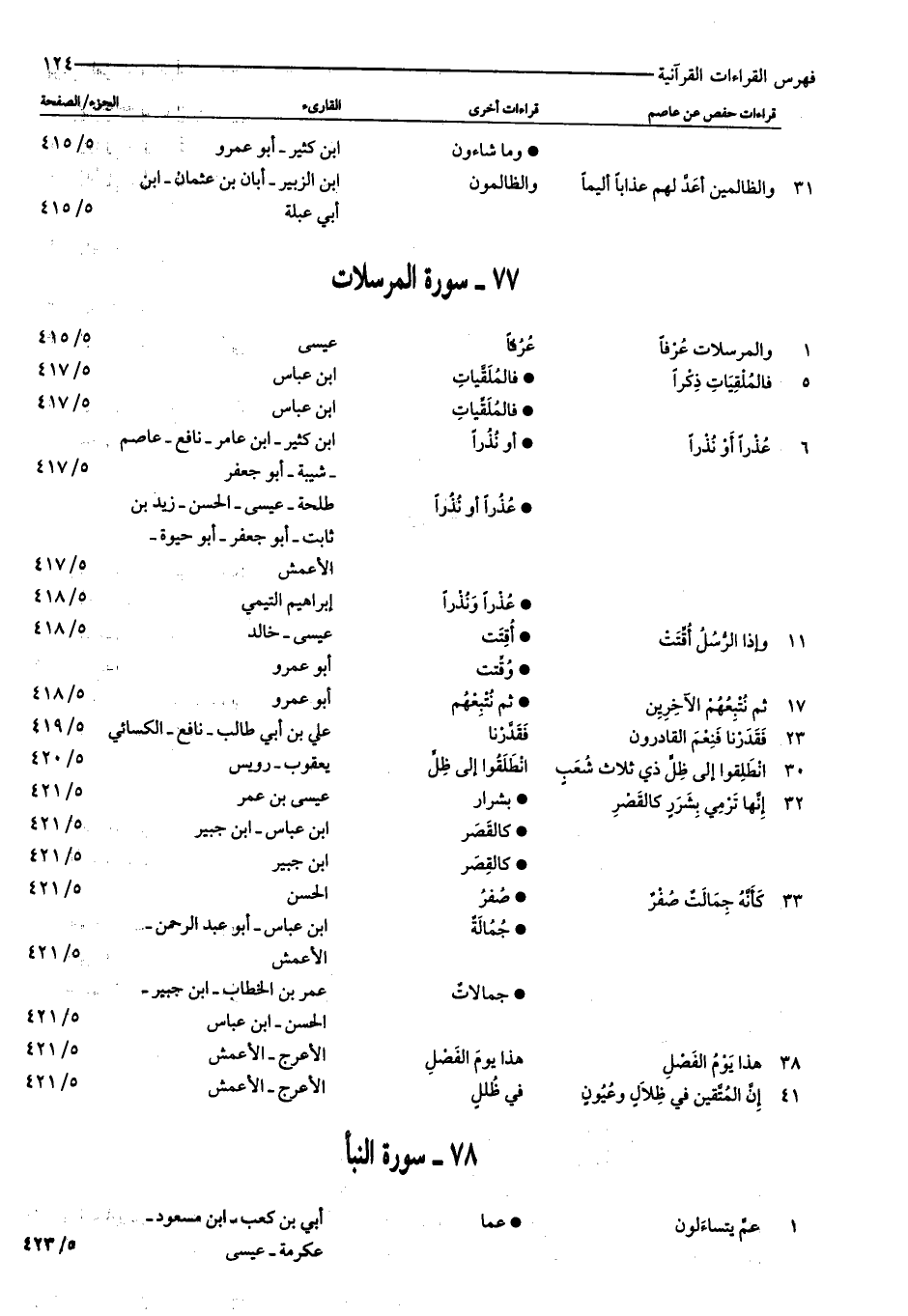 ١: وَالْمُرْسَلاتِ عُرْفاً: عرفا: عيسى: ٥/ ٤١٥ ٥: فَالْمُلْقِياتِ ذِكْراً: فالملقّيات: ابن عباس: ٥/ ٤١٧ فالملقّيات: ابن عباس: ٥/ ٤١٧ ٦: عُذْراً أَوْ نُذْراً: أو نذرا: ابن كثير- ابن عامر- نافع- عاصم- شيبة- أبو جعفر: ٥/ ٤١٧ عذرا أو نذرا: طلحة- عيسى- الحسن- زيد بن ثابت- أبو جعفر- أبو حيوة- الأعمش: ٥/ ٤١٧ عذرا ونذرا: إبراهيم التيمي: ٥/ ٤١٨ ١١: وَإِذَا الرُّسُلُ أُقِّتَتْ: أقتت: عيسى- خالد: ٥/ ٤١٨ وقّتت: أبو عمرو ١٧: ثُمَّ نُتْبِعُهُمُ الْآخِرِينَ: ثم نتبعهم: أبو عمرو: ٥/ ٤١٨ ٢٣: فَقَدَرْنا فَنِعْمَ الْقادِرُونَ: فقدّرنا: علي بن أبي طالب- نافع- الكسائي: ٥/ ٤١٩ ٣٠: انْطَلِقُوا إِلى ظِلٍّ ذِي ثَلاثِ شُعَبٍ: انطلقوا إلى ظلّ: يعقوب- رويس: ٥/ ٤٢٠ ٣٢: إِنَّها تَرْمِي بِشَرَرٍ كَالْقَصْرِ: بشرار: عيسى بن عمر: ٥/ ٤٢١ كالقصر: ابن عباس- ابن جبير: ٥/ ٤٢١ كالقصر: ابن جبير: ٥/ ٤٢١ ٣٣: كَأَنَّهُ جِمالَتٌ صُفْرٌ: صفر: الحسن: ٥/ ٤٢١ جمالة: ابن عباس- أبو عبد الرحمن- الأعمش: ٥/ ٤٢١ جمالات: عمر بن الخطاب- ابن جبير- الحسن- ابن عباس: ٥/ ٤٢١ ٣٨: هذا يَوْمُ الْفَصْلِ: هذا يوم الفصل: الأعرج- الأعمش: ٥/ ٤٢١ ٤١: إِنَّ الْمُتَّقِينَ فِي ظِلالٍ وَعُيُونٍ: في ظلل: الأعرج- الأعمش: ٥/ ٤٢١