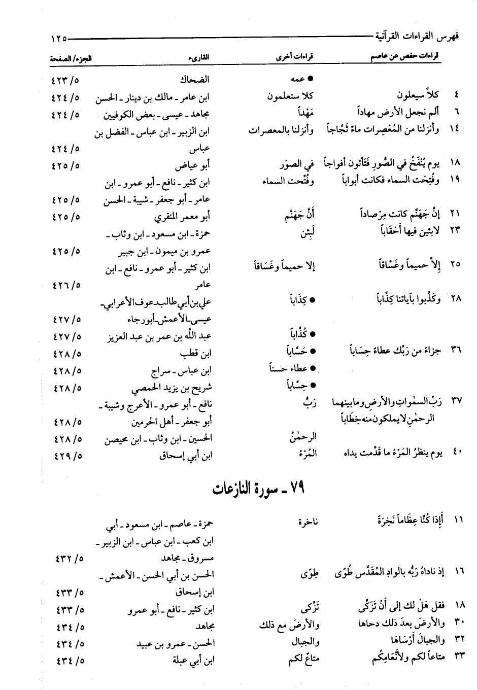 عمه: الضحاك: ٥/ ٤٢٣ ٤: كَلَّا سَيَعْلَمُونَ: كلا ستعلمون: ابن عامر- مالك بن دينار- الحسن: ٥/ ٤٢٤ ٦: أَلَمْ نَجْعَلِ الْأَرْضَ مِهاداً: مهدا: مجاهد- عيسى- بعض الكوفيين: ٥/ ٤٢٤ ١٤: وَأَنْزَلْنا مِنَ الْمُعْصِراتِ ماءً ثَجَّاجاً: وأنزلنا بالمعصرات: ابن الزبير- ابن عباس- الفضل بن عباس: ٥/ ٤٢٤ ١٨: يَوْمَ يُنْفَخُ فِي الصُّورِ فَتَأْتُونَ أَفْواجاً: في الصور: أبو عياض: ٥/ ٤٢٥ ١٩: وَفُتِحَتِ السَّماءُ فَكانَتْ أَبْواباً: وفتّحت السماء: ابن كثير- نافع- أبو عمرو- ابن عامر- أبو جعفر- شيبة- الحسن: ٥/ ٤٢٥ ٢١: إِنَّ جَهَنَّمَ كانَتْ مِرْصاداً: أنّ جهنّم: أبو معمر المنقري: ٥/ ٤٢٥ ٢٣: لابِثِينَ فِيها أَحْقاباً: لبثن: حمزة- ابن مسعود- ابن وثاب- عمرو بن ميمون- ابن جبير: ٥/ ٤٢٥ ٢٥: إِلَّا حَمِيماً وَغَسَّاقاً: إلا حميما وغساقا: ابن كثير- أبو عمرو- نافع- ابن عامر: ٥/ ٤٢٦ ٢٨: وَكَذَّبُوا بِآياتِنا كِذَّاباً: كذابا: علي بن أبي طالب- عوف الأعرابي- عيسى- الأعمش- أبو رجاء: ٥/ ٤٢٧ كذّابا عبد الله بن عمر بن عبد العزيز: ٥/ ٤٢٧ ٣٦: جَزاءً مِنْ رَبِّكَ عَطاءً حِساباً: حسّابا: ابن قطب: ٥/ ٤٢٨ عطاء حسنا: ابن عباس- سراج: ٥/ ٤٢٨ حسّابا: شريح بن يزيد الحمصي: ٥/ ٤٢٨ ٣٧: رَبِّ السَّماواتِ وَالْأَرْضِ وَما بَيْنَهُمَا: ربّ: نافع- أبو عمرو- الأعرج وشيبة- أبو جعفر- أهل الحرمين: ٥/ ٤٢٨ الرَّحْمنِ لا يَمْلِكُونَ مِنْهُ خِطاباً: الرحمن: الحسين- ابن وثاب- ابن محيصن: ٥/ ٤٢٨ ٤٠: وْمَ يَنْظُرُ الْمَرْءُ ما قَدَّمَتْ يَداهُ