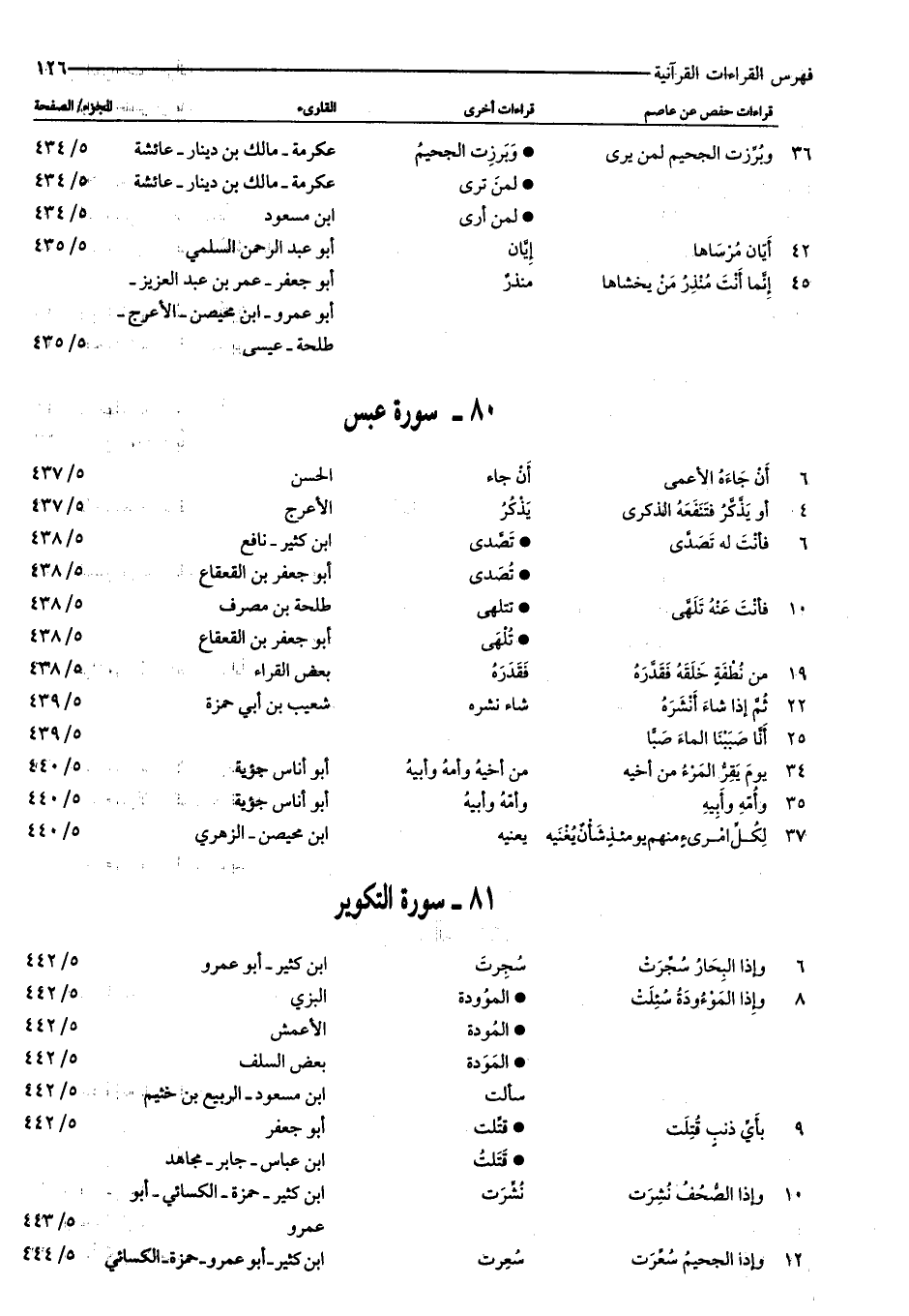 ٦: وَإِذَا الْبِحارُ سُجِّرَتْ: سجرت: ابن كثير- أبو عمرو: ٥/ ٤٤٢ ٨: وَإِذَا الْمَوْؤُدَةُ سُئِلَتْ: الموودة: البزي: ٥/ ٤٤٢ المودة: الأعمش: ٥/ ٤٤٢ المودة: بعض السلف: ٥/ ٤٤٢ سألت: ابن مسعود- الربيع بن خثيم: ٥/ ٤٤٢ ٩: بِأَيِّ ذَنْبٍ قُتِلَتْ: قتّلت: أبو جعفر: ٥/ ٤٤٢ قتلت: ابن عباس- جابر- مجاهد ١٠: وَإِذَا الصُّحُفُ نُشِرَتْ: نشّرت: ابن كثير- حمزة- الكسائي- أبو عمرو: ٥/ ٤٤٣ ١٢: وَإِذَا الْجَحِيمُ سُعِّرَتْ: سعرت: ابن كثير- أبو عمرو- حمزة- الكسائي: ٥/ ٤٤٤